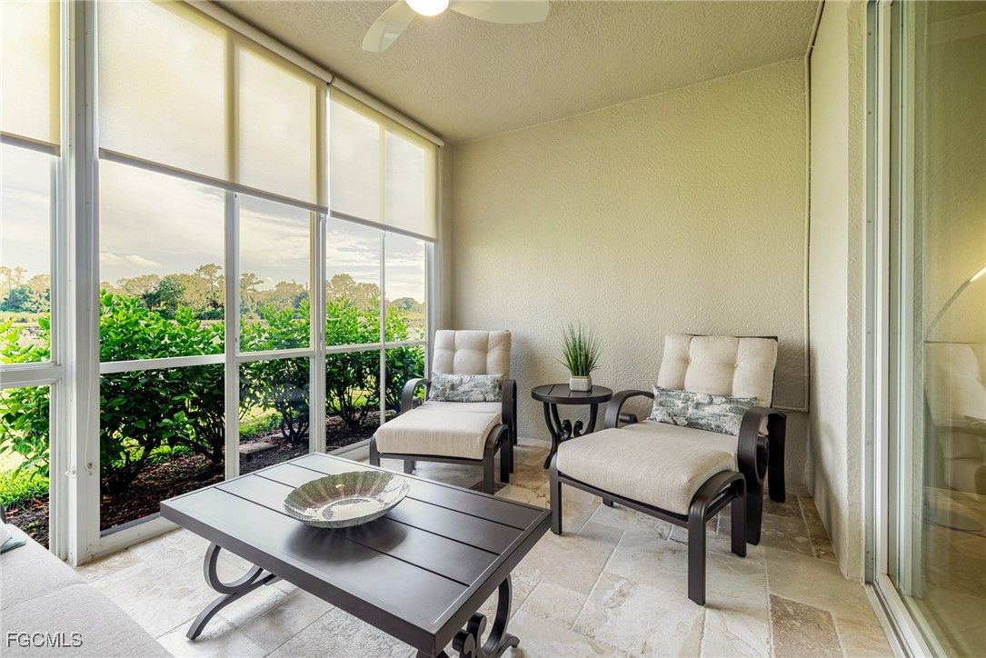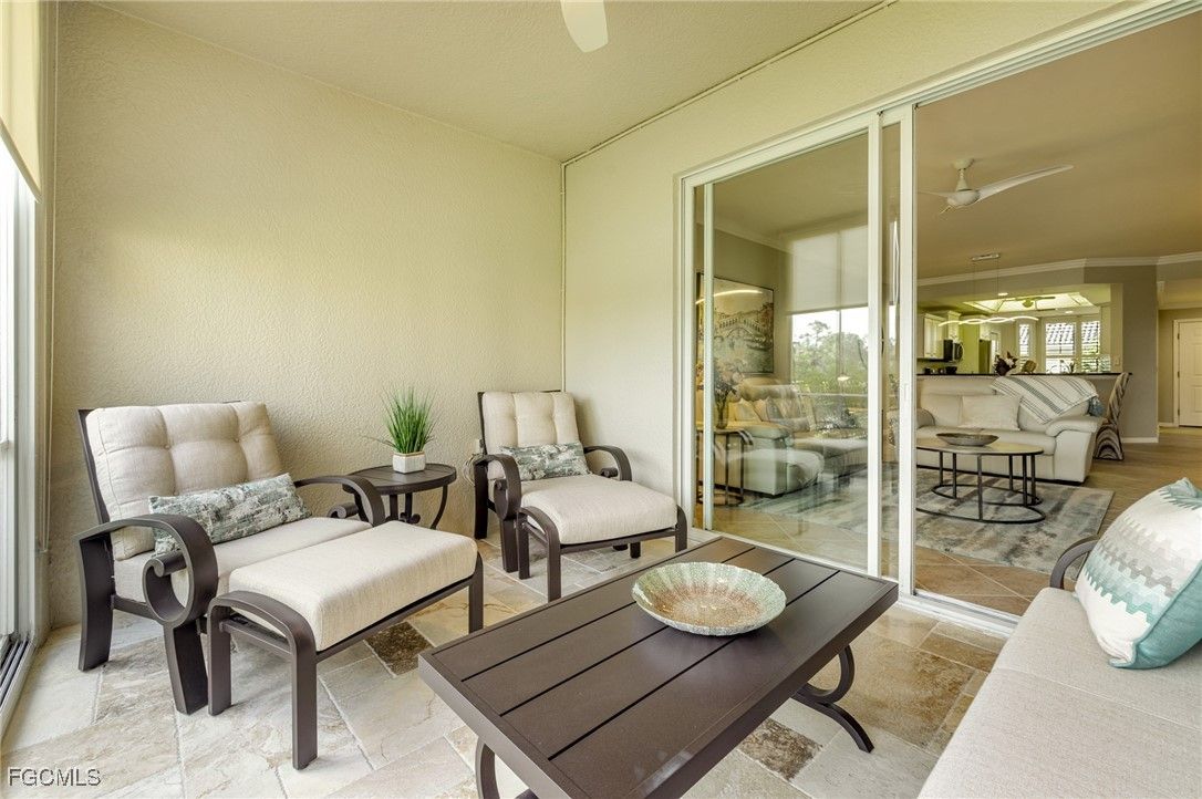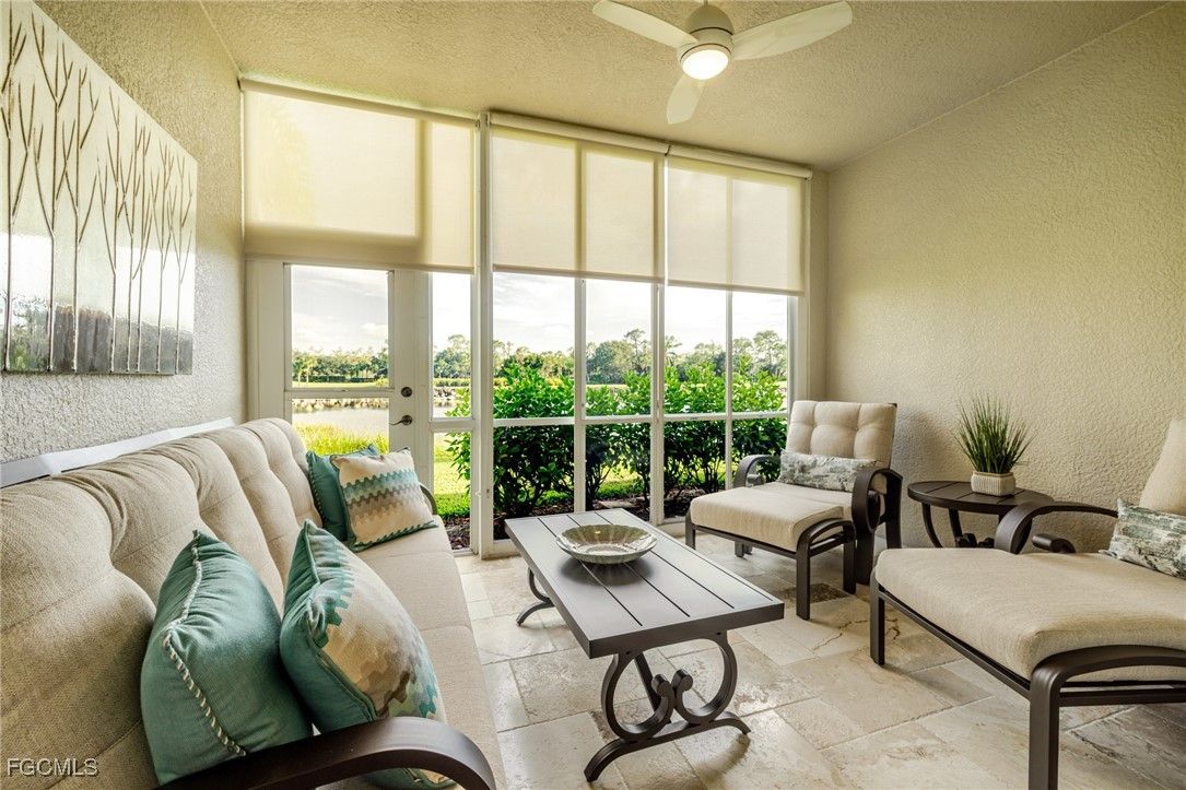 This stunning home exudes model-like perfection with its impeccable decor and neutral color palette. The Abbey floor plan, the largest of the verandas, is highly sought after. The McArthur Palm properties, completed in 2005 feature high impact glass on windows and doors, ensuring durability and safety. The front and back lanais are enclosed and adorned with travertine flooring, providing year-round comfort. These outdoor spaces offer picturesque views of the golf course, water, landscaping, and orchids, creating the perfect setting for relaxation and enjoyment. Sunrises in the morning over the water and sunsets in the evening from the front. The den has been enclosed and a closet added, transforming this home into a true 3-bedroom residence. The bedrooms feature luxury vinyl flooring that seamlessly blends with the tile in the main living areas. Crown molding, plantation shutters, granite counters, new appliances, and a new AC unit add to the home's appeal. Residents of this property have access to a neighborhood pool, chipping/putting area, and clubhouse, all within walking distance. In 2023, the property underwent renovations, including new roofs, gutters, lighting, and a fresh coat of paint. The home is offered partially furnished, with lanai sets, dining room set, and guest bedroom furniture included. Heritage Palms is an award-winning bundled golf community with 36 holes of golf, multiple restaurants, tennis courts, pickleball courts, bocce ball courts, fitness classes, swimming pools, and card rooms, providing an active and social lifestyle. The lodge and Tiki bar are currently being renovated and will open soon. adding to the community's charm. Don't miss out on the opportunity to own a home in this popular community with one of the best floor plans available.