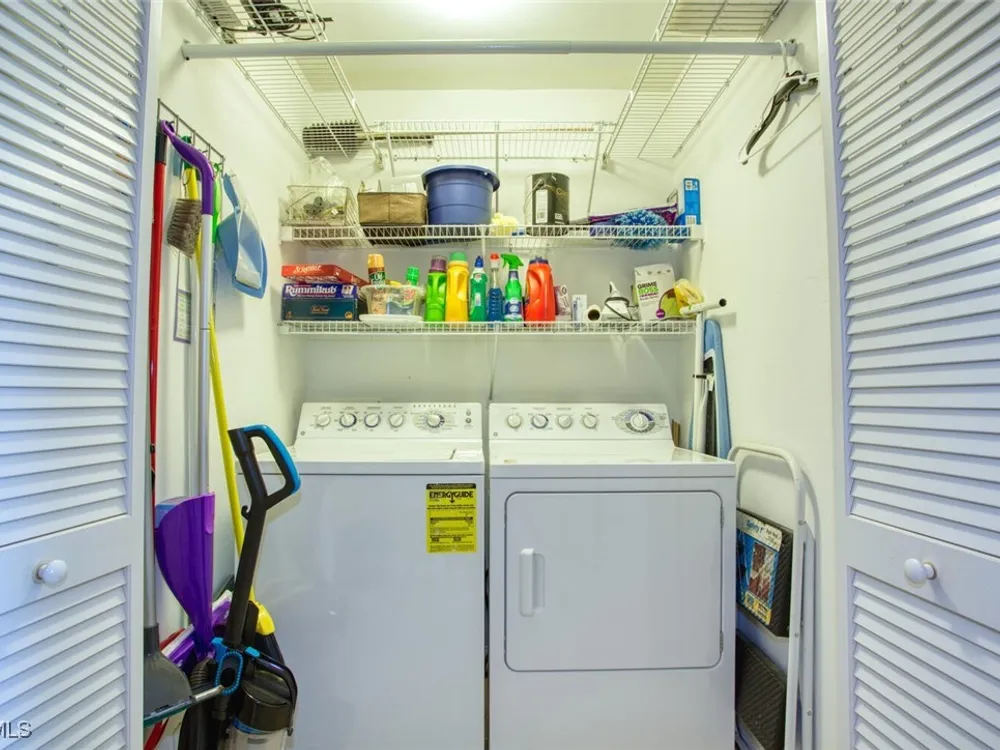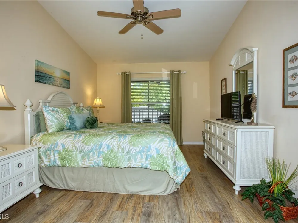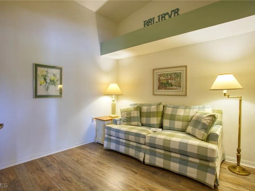 Enjoy sweeping views of the golf course, lake, and wooded preserve from this top-floor veranda. Vaulted ceilings accentuate the natural light. This spacious 2-bedroom, 2-bath with a den offers both comfort and flexibility—plus a one-car garage. The open kitchen flows into the living and dining area, perfect for entertaining. The den offers a quiet retreat or extra space for guests. Both the living room and den feature queen-size sleeper sofas, allowing the condo to comfortably accommodate up to eight people. Maintenance-free laminate flooring runs through the main living areas and primary bedroom, with plush carpet in the guest bedroom. Located within walking distance of the main clubhouse and activity/fitness center, this home puts you right in the heart of the action. Heritage Palms offers two golf courses, pickle ball and tennis courts, restaurants, and a redesigned Oasis/Tiki Bar coming soon. Centrally located in Fort Myers, you’re minutes from the airport, shopping, dining, professional baseball parks, and the world-famous beaches of Southwest Florida.