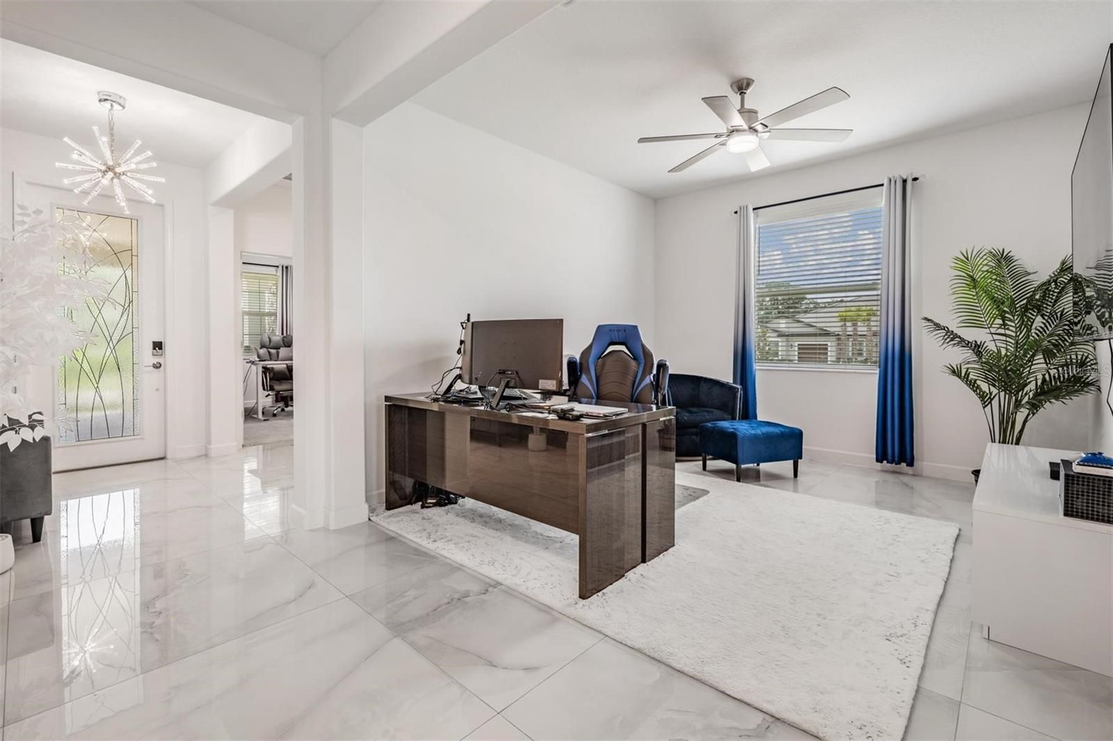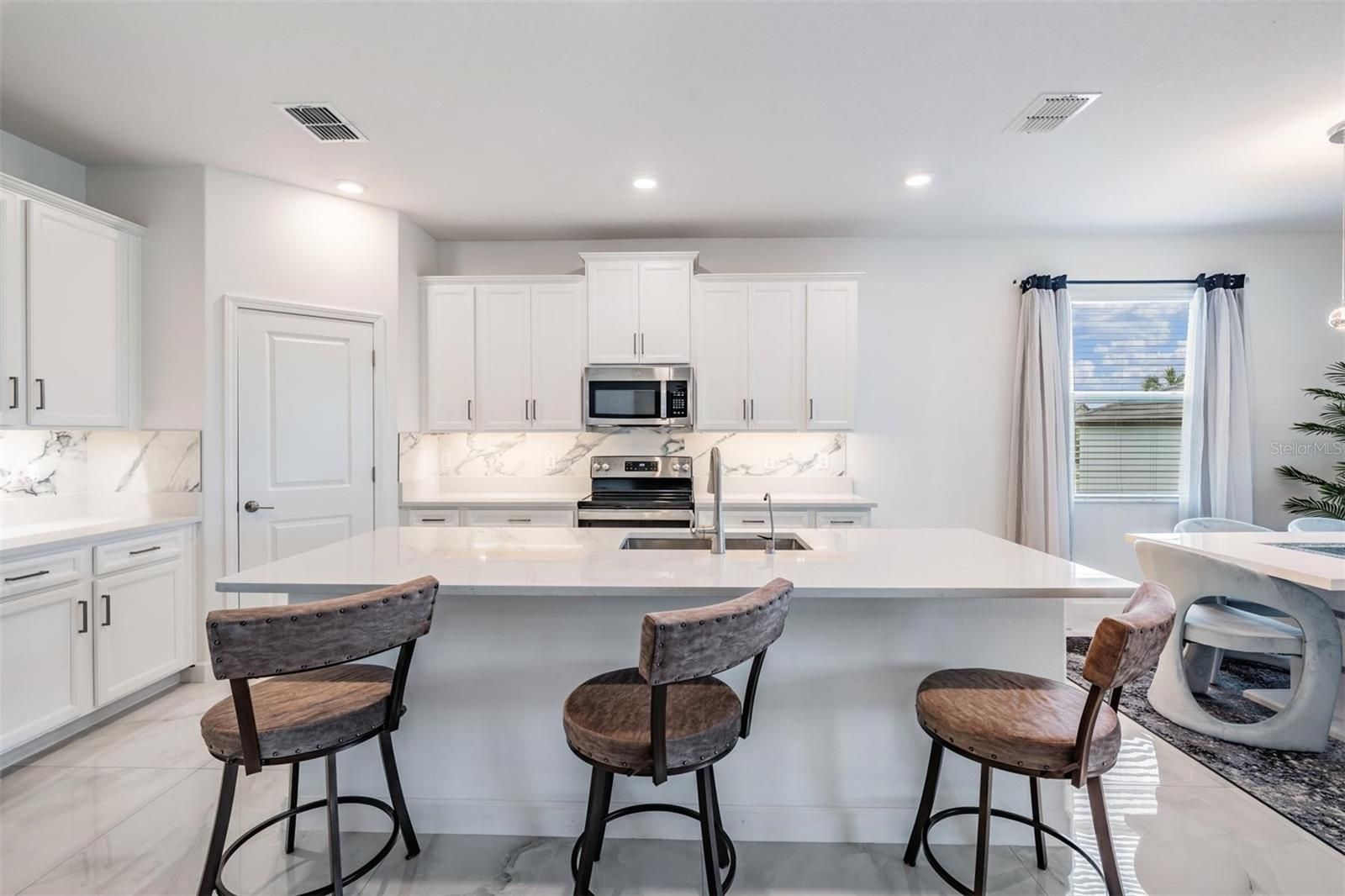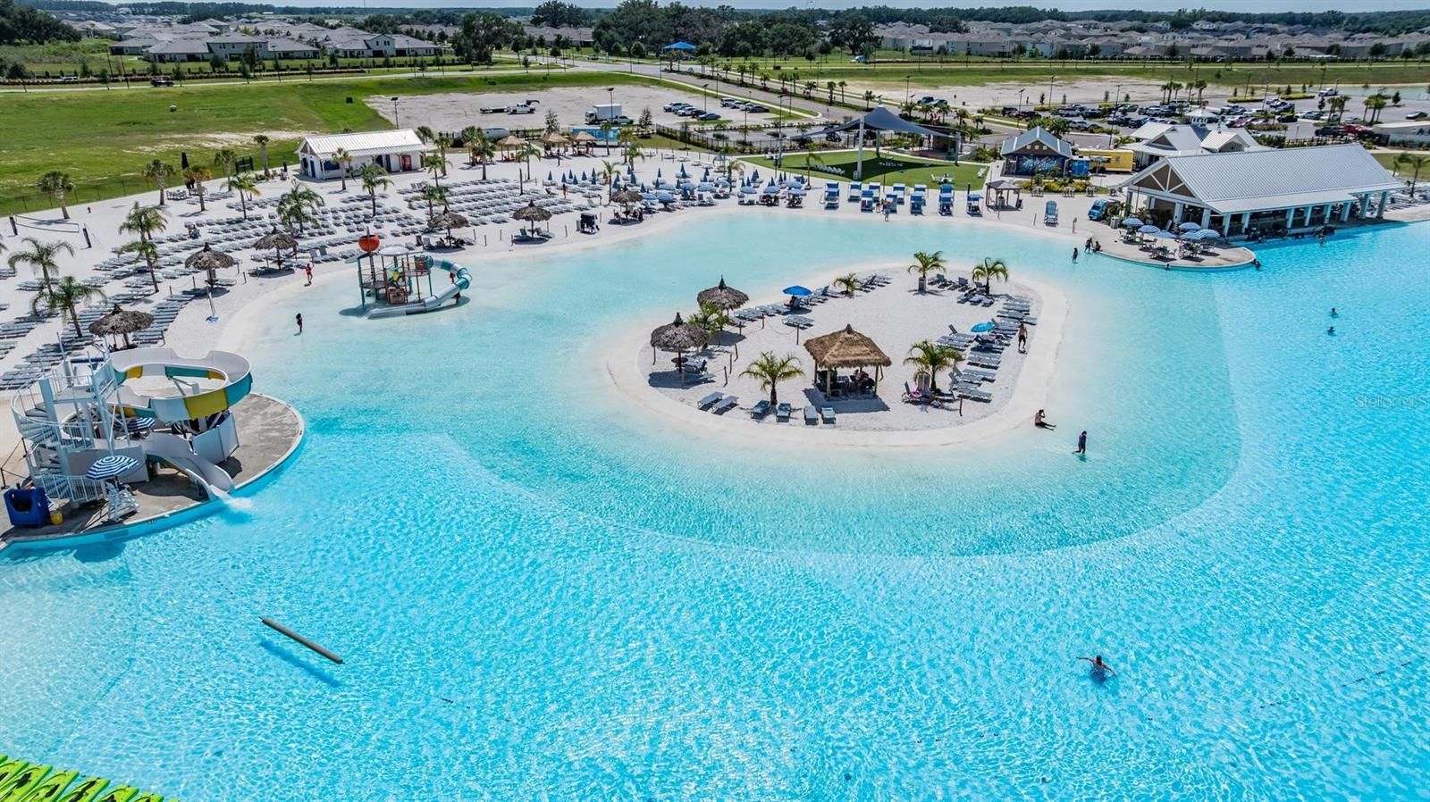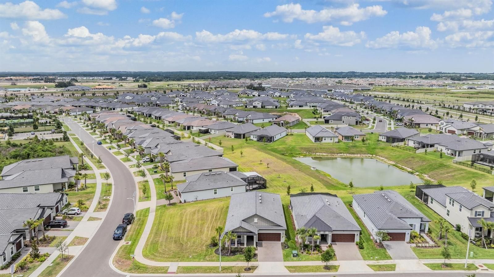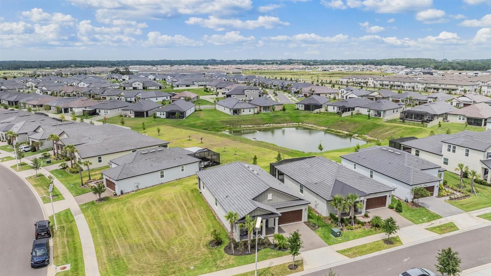 LUXURY MODEL HOME WITH + $50K in UPGRADES + DOUBLE CORNER LOT! Welcome to resort-style, maintenance-free living in the exclusive 55+ gated community featuring private amenities along with access to Florida’s 15-acre Crystal Lagoon! This stunning 2-bed | 2-bath + flex room home (1,968 sq. ft) is situated on a rare double corner lot with serene pond views. When you enter the home through the 8-foot etched glass door, you encounter beautiful 40"x 40" porcelain tiled floors. The foyer has a porcelain tile signature wall with a modern chandelier. The open concept living and dining areas create a welcoming atmosphere with plenty of natural light. The kitchen features a large island with quartz countertops, a custom porcelain tile backsplash, and a large walk-in pantry. Step outside through the 3-panel glass sliding doors onto your screened lanai with a pond view. It is a perfect spot for morning coffee. Shades have been installed on the lanai. The primary suite serves as a peaceful retreat, complete with a walk-in closet, en-suite bathroom upgraded with dual vanities, frameless, adjustable LED vanity mirrors, and a custom porcelain-tiled walk-in shower with 2 shower heads, including a rainfall shower head. The laundry room is spacious and is connected to the primary bedroom's walk-in closet. The guest bathroom has floor-to-ceiling porcelain tile with a LED Spa Shower Tower, a rain and waterfall head, and four massage body jets. The home also features upgraded modern lighting, ceiling fans, and a brick-paver driveway. Enjoy resort-style living at The Medley in Mirada, which includes a clubhouse, restaurant, fitness center, pool, pickleball, and tennis courts. A monthly calendar of events offers Water Aerobics, Mahjong, Zumba, Tai Chi, and much more. Bring your golf cart and drive to the 15-acre Lagoon, which offers Sandy Beaches, Swim-up Bar, Paddle Boarding, Kayaking, an Obstacle Course, Cabanas, Aqua Banas, and Live Music Events. A monthly calendar of events includes Bingo, Trivia Night, and Movies on the Lawn. The Master HOA's quarterly fee includes cable and the Ultra-Fi. Lawn Maintenance is included at the Medley. This home is about 40 minutes north of Downtown Tampa, 45 minutes from Tampa International Airport, 60 minutes from the Gulf Beaches, and 75 minutes from Orlando and Walt Disney World. Buyer and Buyer's Agent to confirm all room measurements.