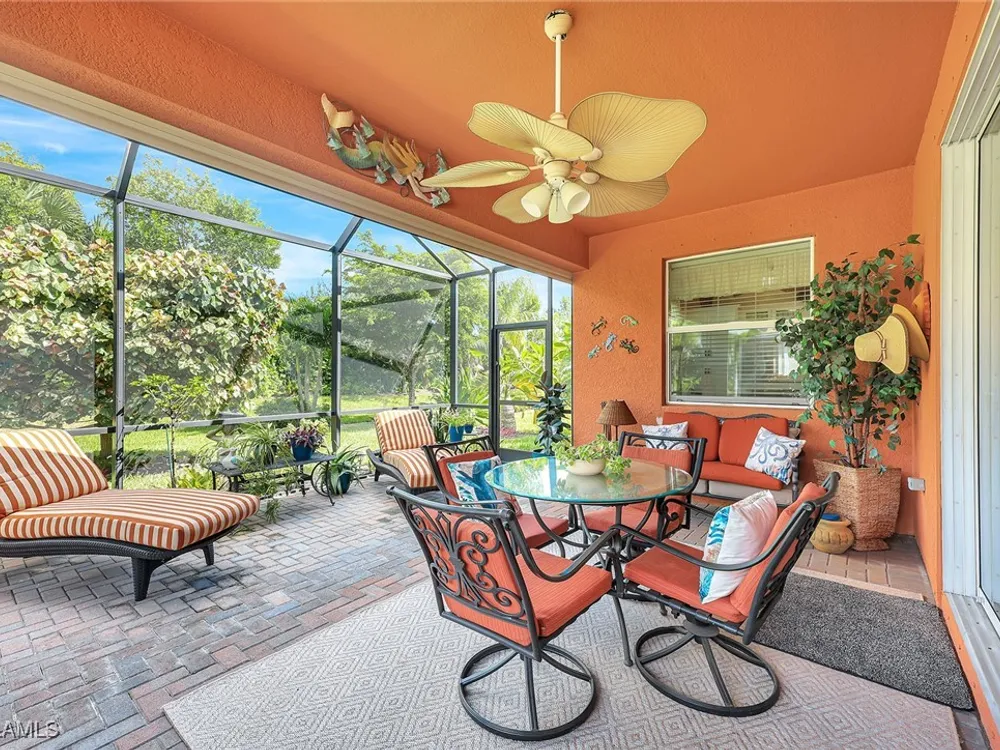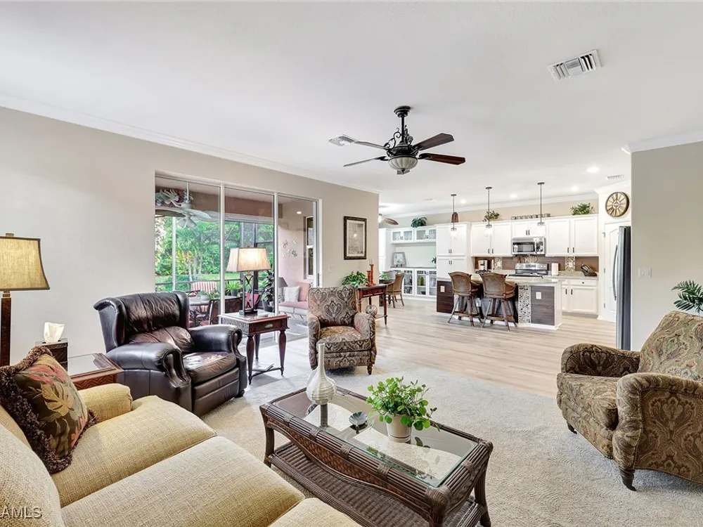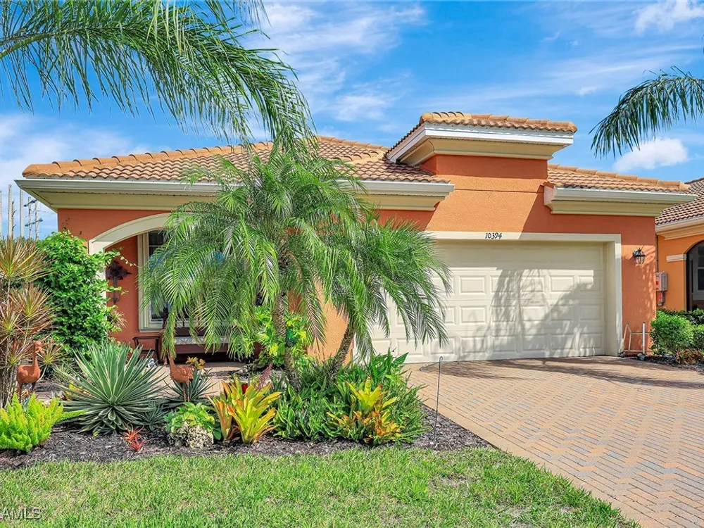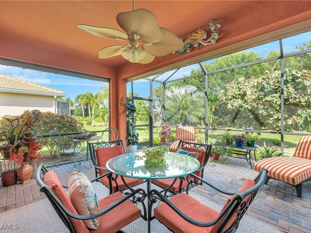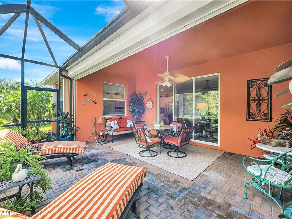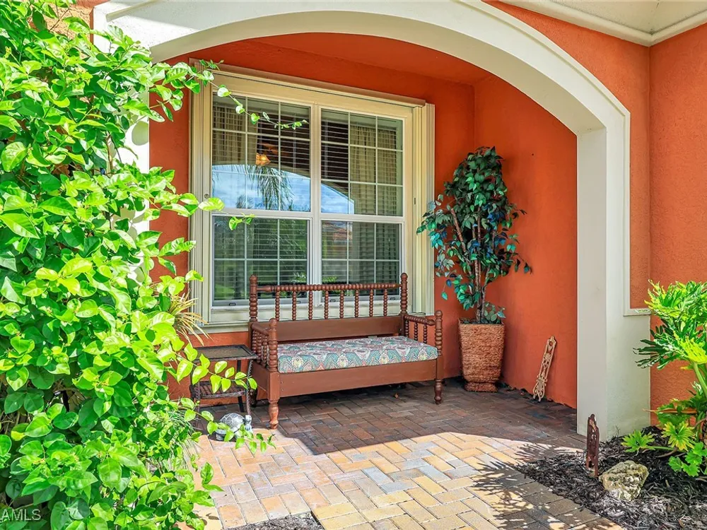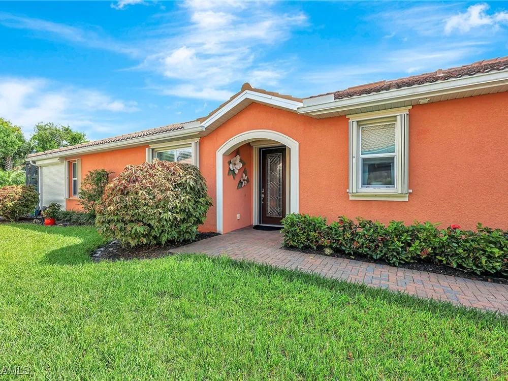Don’t miss this beautifully upgraded home that stands out! Offered furnished, complete with a golf cart, this residence features two bedrooms and a spacious office that can easily be converted into a third bedroom. You will love the open concept floor plan with attention to detail, featuring laminate wood flooring throughout, crown molding, and an extended kitchen designed for style and functionality, complete with white shaker cabinetry, stainless steel appliances, level-5 granite countertops, and a kitchen island ideal for meal prep or entertaining. The primary suite offers a generous walk-in closet, dual vanities, and a walk-in shower for comfort and convenience. Go outside to enjoy Florida living at its best on your extended screened-in paver lanai, ideal for relaxing or hosting guests. For peace of mind, this home features electric roll-down shutters on the lanai, accordion shutters around the house, in-wall pest control tubing, a whole-house water softener system, roof resealed in 2023 with an active maintenance contract and solar panels to help reduce energy costs. The garage provides extra storage with built-in shelving, metal cabinetry and a workbench, plus the golf cart with a recently replaced battery is included! In Pelican Preserve, one of Southwest Florida’s desirable 55-plus gated communities, residents enjoy resort-style living with 27-hole championship golf course, a 38-acre preserve, a 70,000 square feet town center that features indoor lap and outdoor resort styled pools, restaurants, cinema with free movies, state-of-the-art fitness center, indoor walking track, cyber cafe, six tennis courts with established tennis program, pickleball court and amphitheater. Close to the airport and some of the best dining, entertainment and beaches in Southwest Florida.