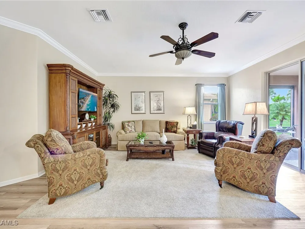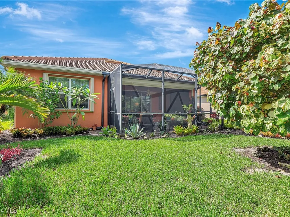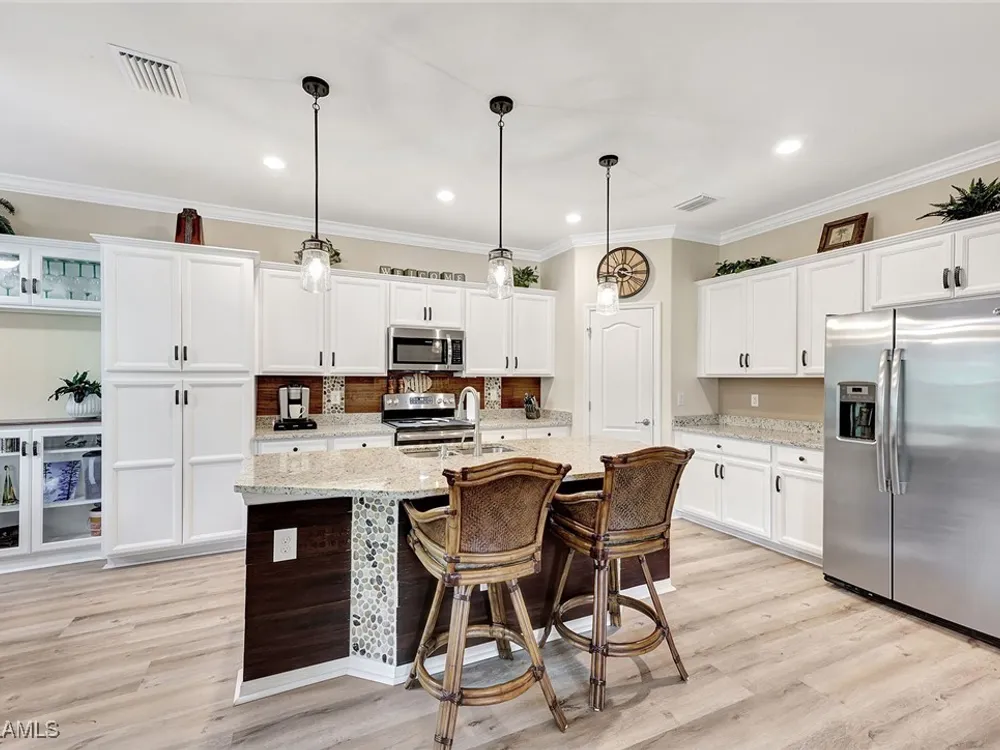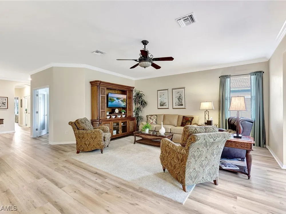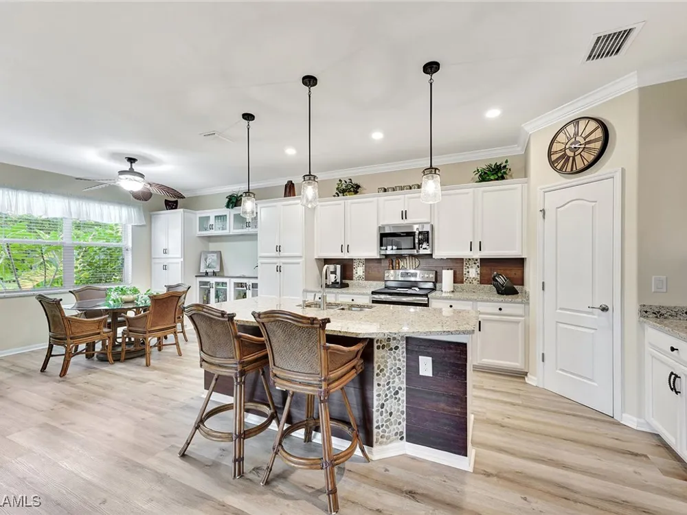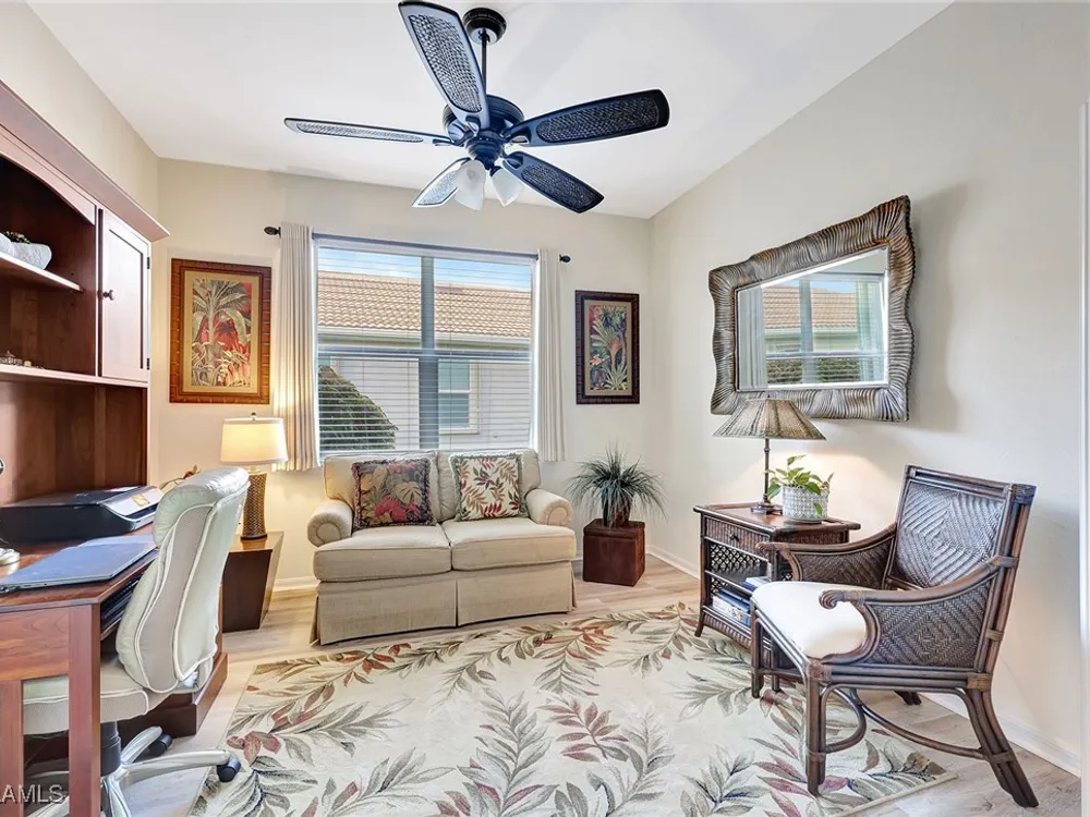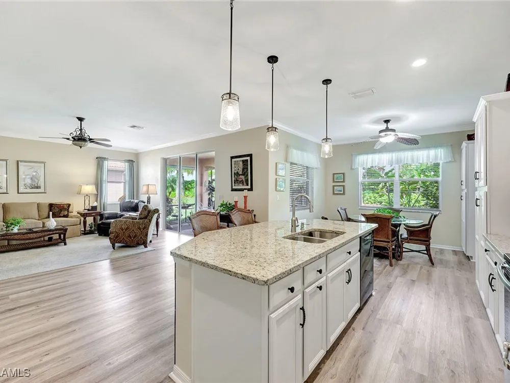 Don’t miss this beautifully upgraded home that stands out! Offered furnished, complete with a golf cart, this residence features two bedrooms and a spacious office that can easily be converted into a third bedroom. You will love the open concept floor plan with attention to detail, featuring laminate wood flooring throughout, crown molding, and an extended kitchen designed for style and functionality, complete with white shaker cabinetry, stainless steel appliances, level-5 granite countertops, and a kitchen island ideal for meal prep or entertaining. The primary suite offers a generous walk-in closet, dual vanities, and a walk-in shower for comfort and convenience. Go outside to enjoy Florida living at its best on your extended screened-in paver lanai, ideal for relaxing or hosting guests. For peace of mind, this home features electric roll-down shutters on the lanai, accordion shutters around the house, in-wall pest control tubing, a whole-house water softener system, roof resealed in 2023 with an active maintenance contract and solar panels to help reduce energy costs. The garage provides extra storage with built-in shelving, metal cabinetry and a workbench, plus the golf cart with a recently replaced battery is included! In Pelican Preserve, one of Southwest Florida’s desirable 55-plus gated communities, residents enjoy resort-style living with 27-hole championship golf course, a 38-acre preserve, a 70,000 square feet town center that features indoor lap and outdoor resort styled pools, restaurants, cinema with free movies, state-of-the-art fitness center, indoor walking track, cyber cafe, six tennis courts with established tennis program, pickleball court and amphitheater. Close to the airport and some of the best dining, entertainment and beaches in Southwest Florida.