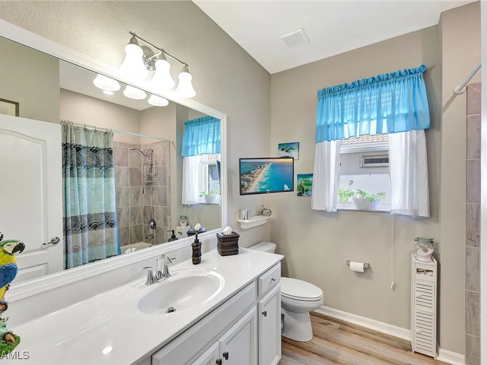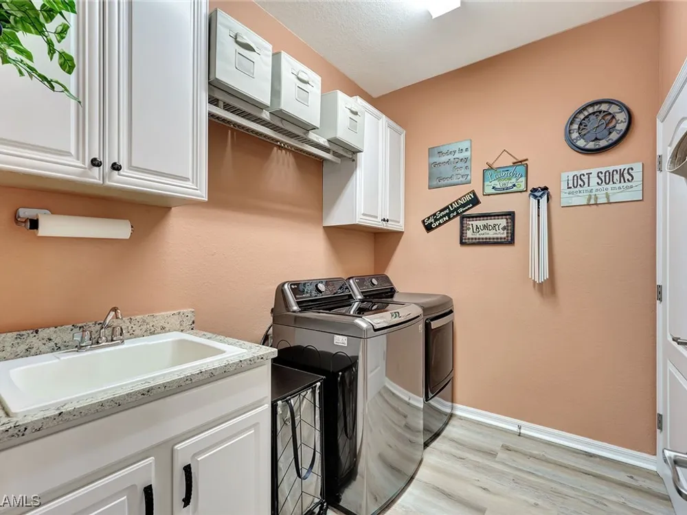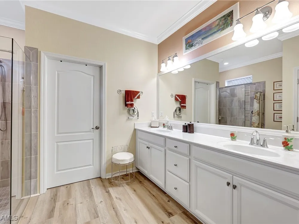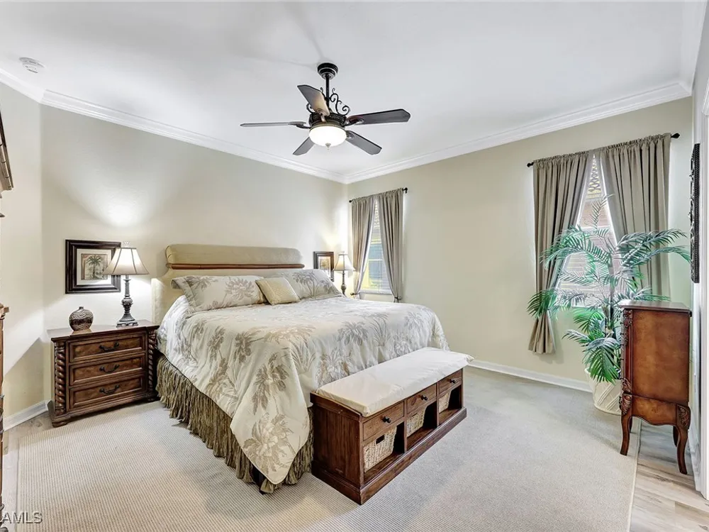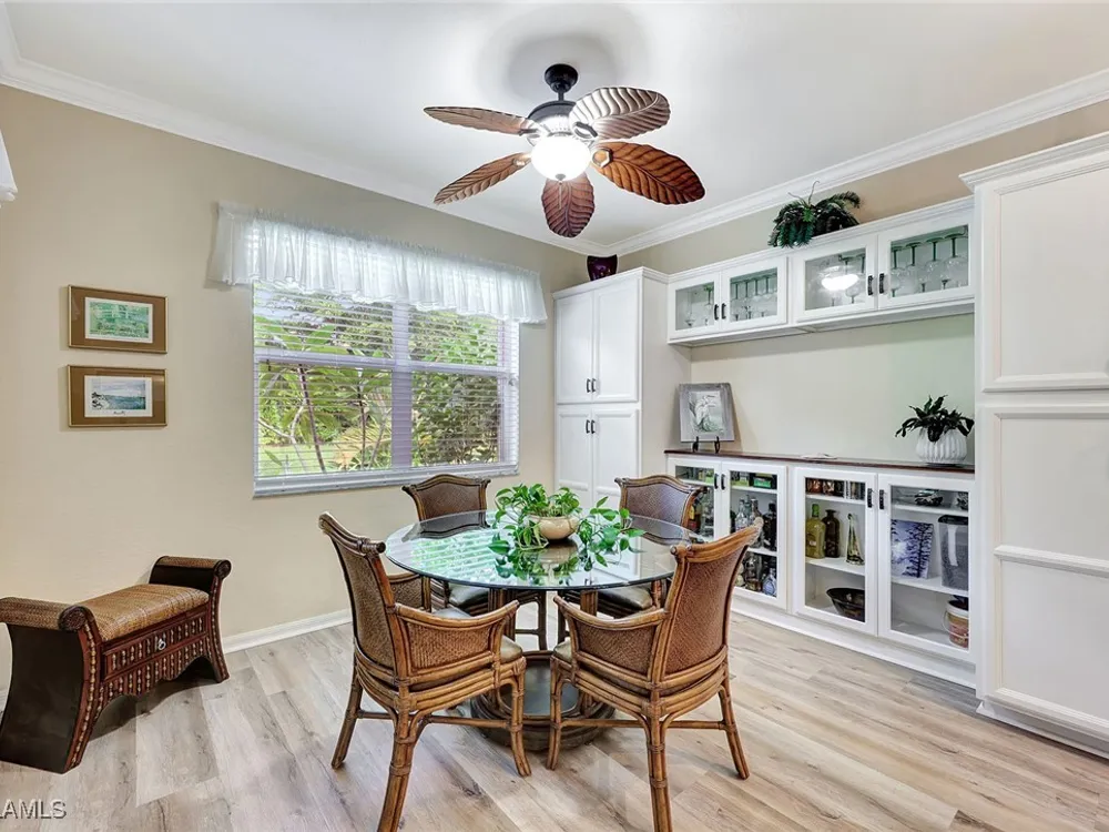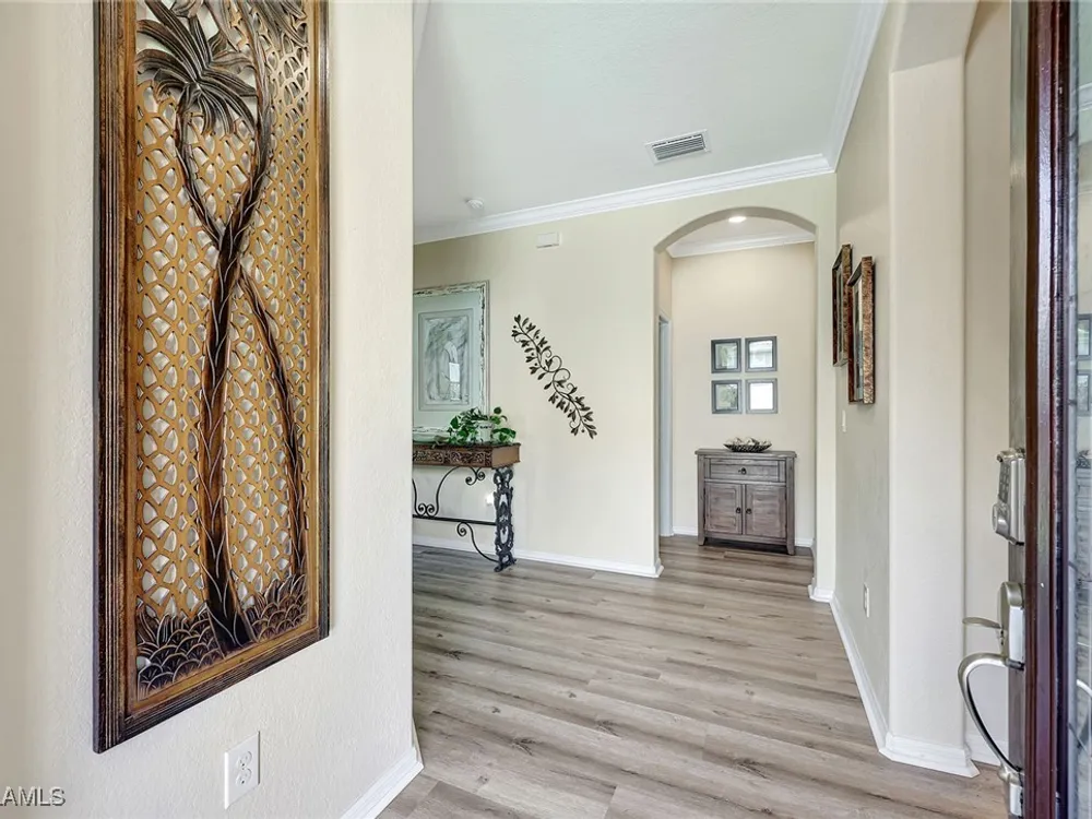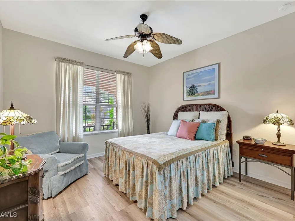 Don’t miss this beautifully upgraded home that stands out! Offered furnished, complete with a golf cart, this residence features two bedrooms and a spacious office that can easily be converted into a third bedroom. You will love the open concept floor plan with attention to detail, featuring laminate wood flooring throughout, crown molding, and an extended kitchen designed for style and functionality, complete with white shaker cabinetry, stainless steel appliances, level-5 granite countertops, and a kitchen island ideal for meal prep or entertaining. The primary suite offers a generous walk-in closet, dual vanities, and a walk-in shower for comfort and convenience. Go outside to enjoy Florida living at its best on your extended screened-in paver lanai, ideal for relaxing or hosting guests. For peace of mind, this home features electric roll-down shutters on the lanai, accordion shutters around the house, in-wall pest control tubing, a whole-house water softener system, roof resealed in 2023 with an active maintenance contract and solar panels to help reduce energy costs. The garage provides extra storage with built-in shelving, metal cabinetry and a workbench, plus the golf cart with a recently replaced battery is included! In Pelican Preserve, one of Southwest Florida’s desirable 55-plus gated communities, residents enjoy resort-style living with 27-hole championship golf course, a 38-acre preserve, a 70,000 square feet town center that features indoor lap and outdoor resort styled pools, restaurants, cinema with free movies, state-of-the-art fitness center, indoor walking track, cyber cafe, six tennis courts with established tennis program, pickleball court and amphitheater. Close to the airport and some of the best dining, entertainment and beaches in Southwest Florida.