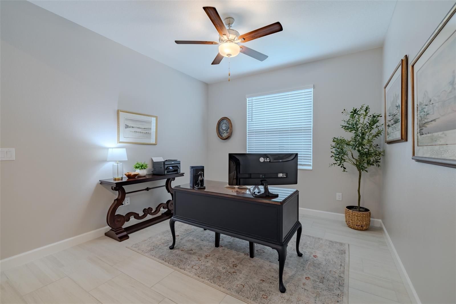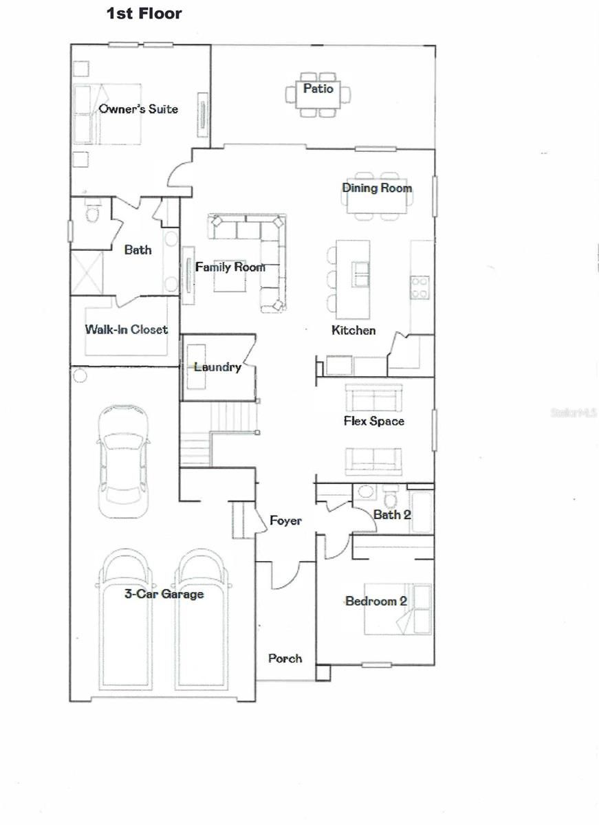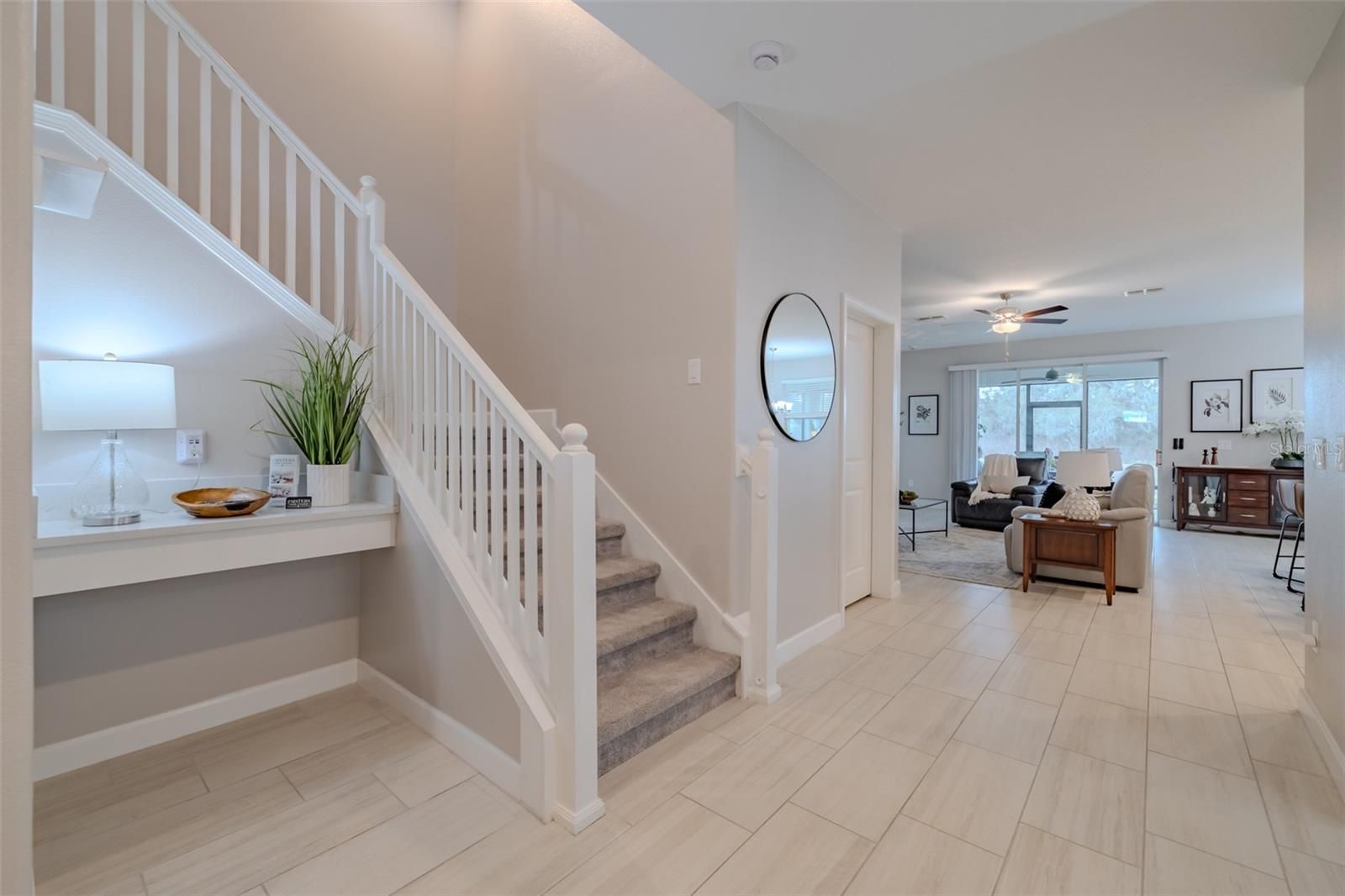 Serene pond setting, 3-bedroom, 3 full bath, 2366 sq ft, 2023 built 2 story Meridian II model located in the 55+ Medley At Mirada community, offers an open concept kitchen, dining room and Family room that overlooks the screened Lanai and pond. Quartz countertops are throughout. The owner’s suite is located on the first floor, with an ensuite bathroom featuring double sinks with a private water closet, shower, and a large walk-in closet. The second bedroom, Flex room and Full Bathroom are also on the Ceramic Plank Tiled first floor along with a 3-car tandem garage with over 200 sq. ft. overhead storage. The second floor boasts a large, carpeted loft area and third bedroom and bathroom. The perfect place for family and friends to stay while visiting. All bedrooms, loft, Family room, Flex room, and Lanai have ceiling fans. High speed fiber optic internet (ULTRAFI) & Spectrum cable TV is included in the HOA fee. Residents of Medley At Mirada have access to the resort style heated pool and amenity center equipped with café & bar, billiards room, card room, ballroom, 24 hr. fitness center, Sports courts featuring, tennis, pickleball, shuffleboard & bocce ball along with a tot lot and a dog park. There are many clubs, activities, and events for fun and enjoyment. In the heart of Mirada is the 15-acre Crystal Lagoon. The largest man-made Lagoon in the nation. Enjoy the crystal-clear blue water with a swim up bar, sandy beaches, cabanas, water slide, water splash zone, kayaking, water obstacle course. The Lagoon offers numerous activities and entertainment for year-round enjoyment. This golf cart inspired community has a Publix shopping center at its entrance and is near Dade City, The Shops at Wiregrass and Tampa Premium outlet malls, The Grove, Golf courses, Bay Care and Advent Hospitals, with close proximity and easy access to Interstate 75. CDD IS ALREADY INCLUDED IN TAX AMOUNT
