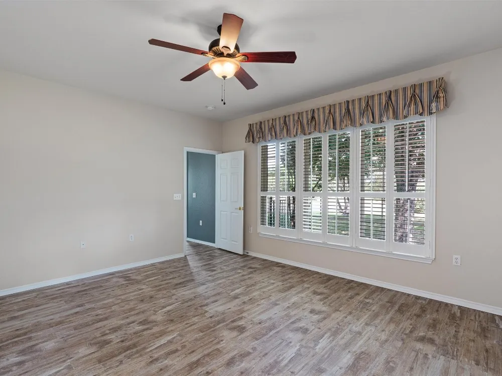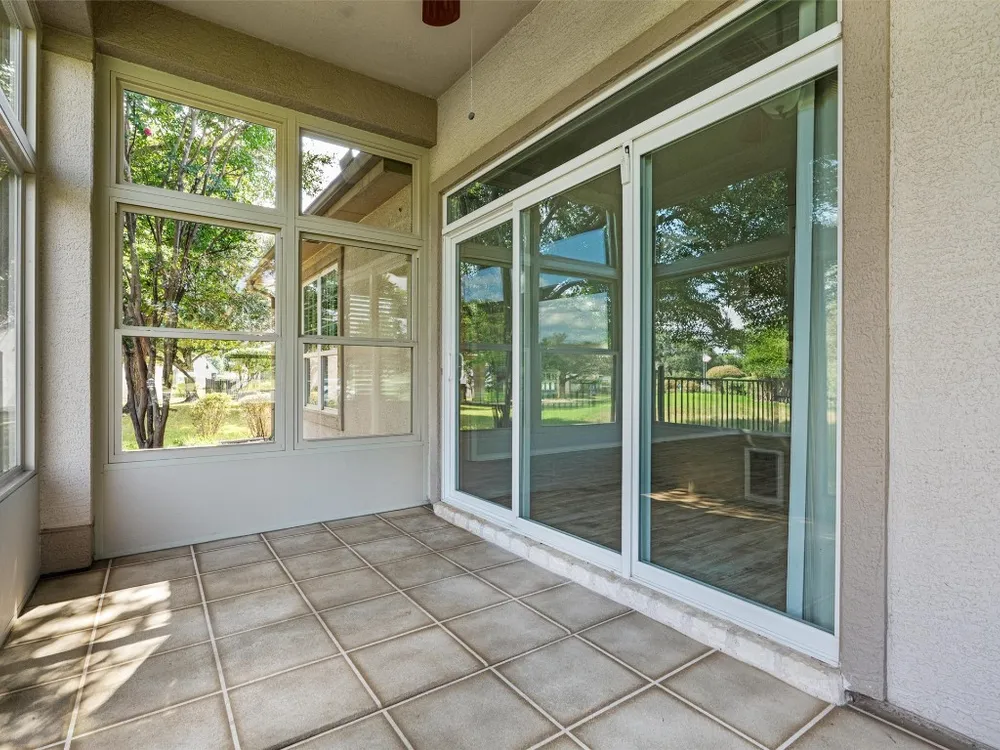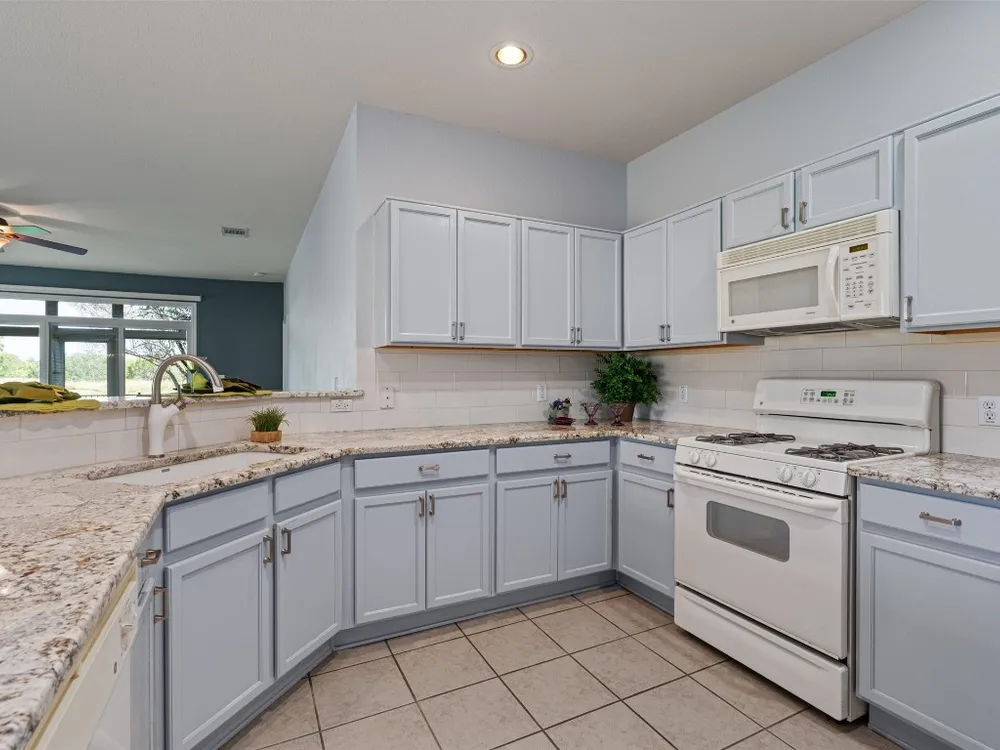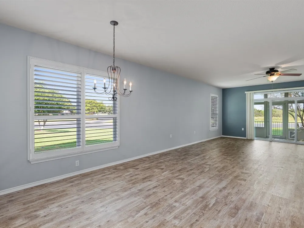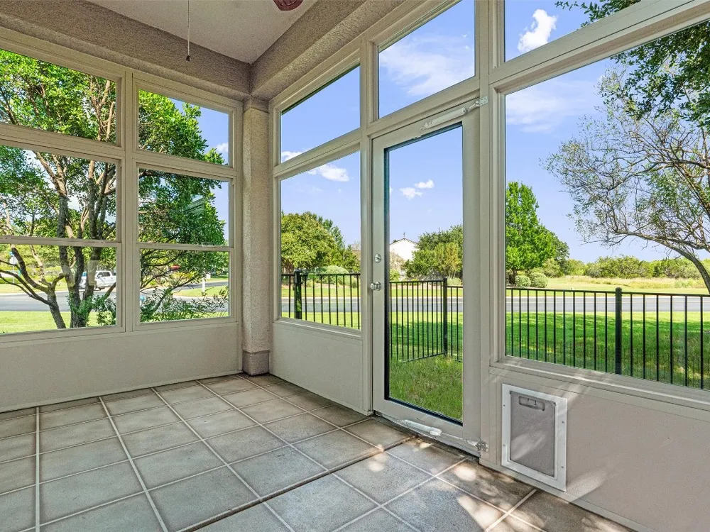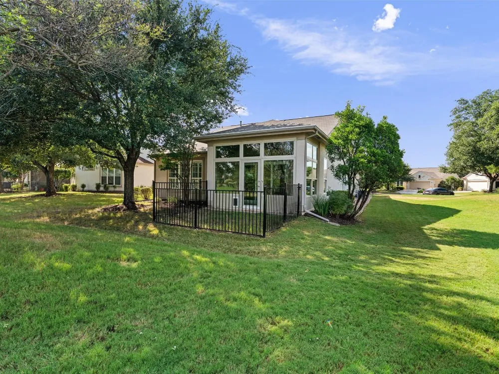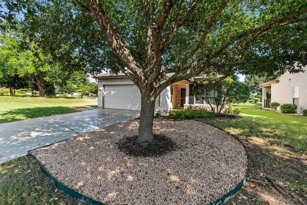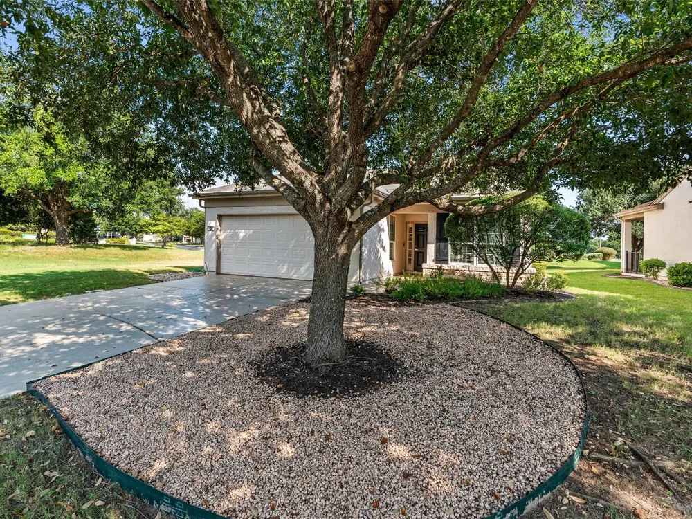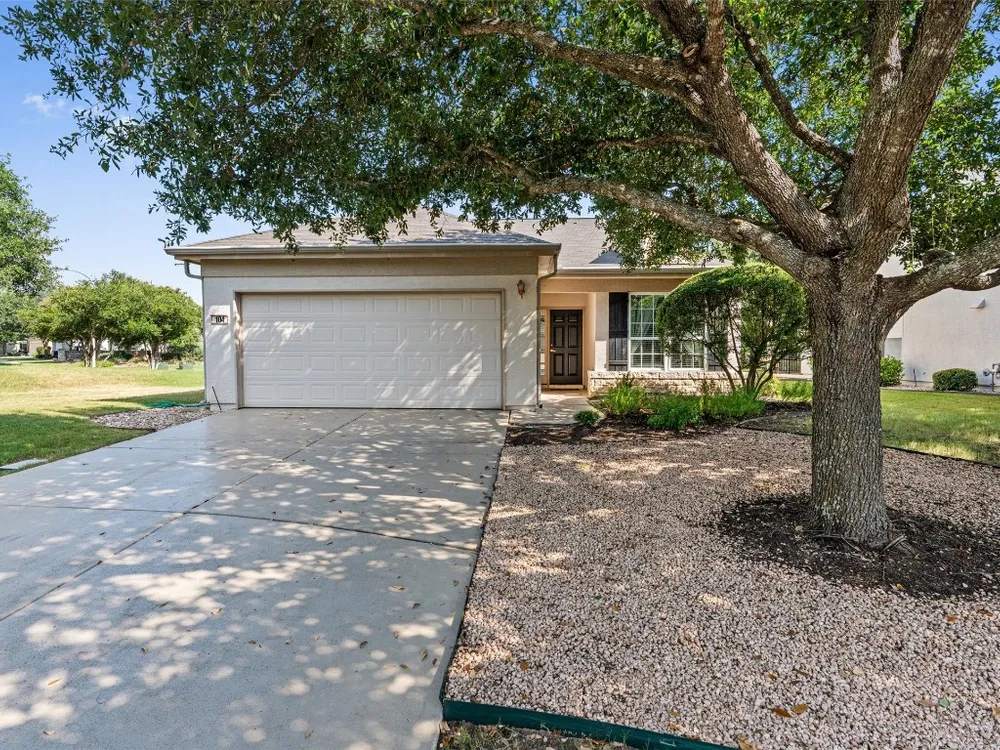 Perched prettily on a treed cul-de-sac adjacent to a greenbelt, this Sun City Texas Magnolia Garden Home features welcoming upgrades, the minute you enter. Off the Gallery Foyer, a Study/Computer Room with breezy fan creates a perfect Office-at-Home, where upgraded vinyl planks add the the timeless look of wood floors. This good look blankets most of the floors. Plantation shutters treat the large window viewing the wide side yard of the Study and those same shutters repeat themselves throughout much of the home. Rich granite counters circle the delightful Open Kitchen designed in a perfect work triangle, while classic white appliances include a refrigerator and gas cooking. Tony cabinet color adds a fresh look at this friendly Open Kitchen complete with Pantry Closet. Nearby, the Dining portion of the sizable Great Room offers more shuttered windows with their greenbelt view. The outsized Great Room offers triple full-view glass doors opening onto the sparkling Sun Room. There, another door leads to the small fenced area, ideal for little Fido. At the rear of the home, the roomy Primary Bedroom hosts a triple-window view of the landscaped back yard and adjacent greenbelt area. The en suite Primary Bath touts dual vanities, a seated shower and Two Walk-In Closets! A high transom window provides natural lighting at the space. Meanwhile, at the front of the home, a Guest Bedroom offers twin windows viewing the landscaped front yard and park-like cul-de-sac. A full Guest Bath is flanked by the front Guest Bedroom, and a smaller Bedroom that can be used as a Hobby Room. A well-placed Laundry Room with washer & dryer is convenient to the Two Guest Bedrooms. Year-around lawn care is included in the stated annual dues, so enjoy life at this active-adult resort and leave the yard work for others. Near first-class amenities including Pickle Ball, Softball and even community gardening, this location and floorplan are important to see and consider.
