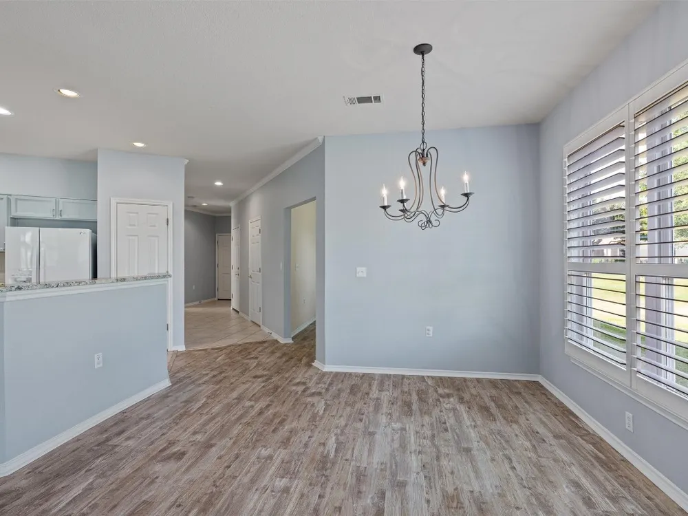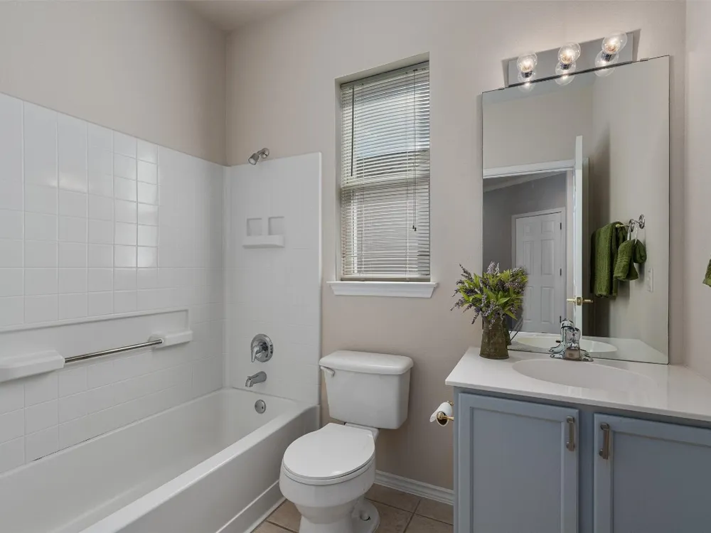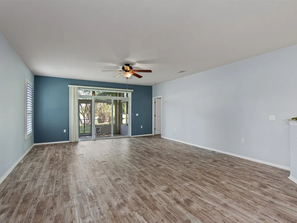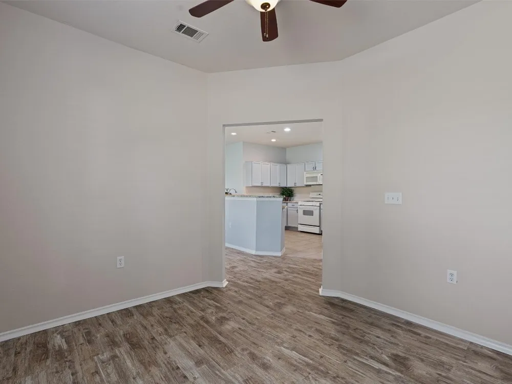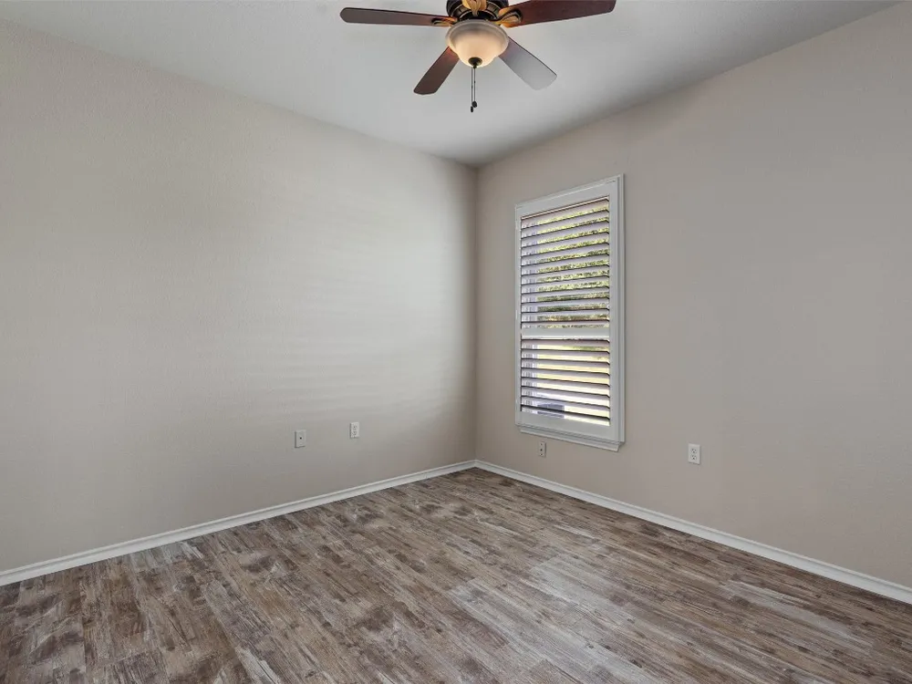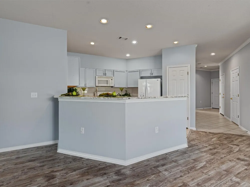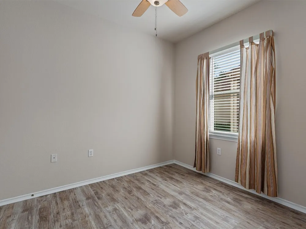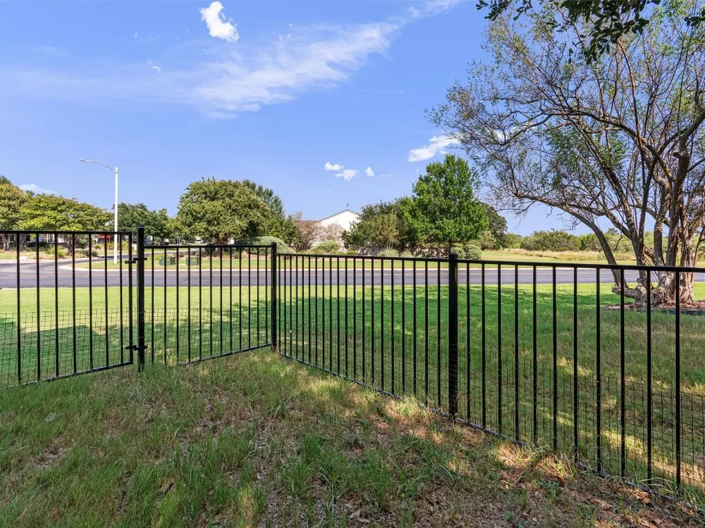 Perched prettily on a treed cul-de-sac adjacent to a greenbelt, this Sun City Texas Magnolia Garden Home features welcoming upgrades, the minute you enter. Off the Gallery Foyer, a Study/Computer Room with breezy fan creates a perfect Office-at-Home, where upgraded vinyl planks add the the timeless look of wood floors. This good look blankets most of the floors. Plantation shutters treat the large window viewing the wide side yard of the Study and those same shutters repeat themselves throughout much of the home. Rich granite counters circle the delightful Open Kitchen designed in a perfect work triangle, while classic white appliances include a refrigerator and gas cooking. Tony cabinet color adds a fresh look at this friendly Open Kitchen complete with Pantry Closet. Nearby, the Dining portion of the sizable Great Room offers more shuttered windows with their greenbelt view. The outsized Great Room offers triple full-view glass doors opening onto the sparkling Sun Room. There, another door leads to the small fenced area, ideal for little Fido. At the rear of the home, the roomy Primary Bedroom hosts a triple-window view of the landscaped back yard and adjacent greenbelt area. The en suite Primary Bath touts dual vanities, a seated shower and Two Walk-In Closets! A high transom window provides natural lighting at the space. Meanwhile, at the front of the home, a Guest Bedroom offers twin windows viewing the landscaped front yard and park-like cul-de-sac. A full Guest Bath is flanked by the front Guest Bedroom, and a smaller Bedroom that can be used as a Hobby Room. A well-placed Laundry Room with washer & dryer is convenient to the Two Guest Bedrooms. Year-around lawn care is included in the stated annual dues, so enjoy life at this active-adult resort and leave the yard work for others. Near first-class amenities including Pickle Ball, Softball and even community gardening, this location and floorplan are important to see and consider.