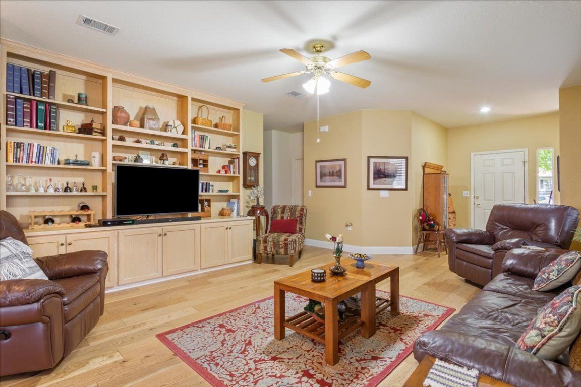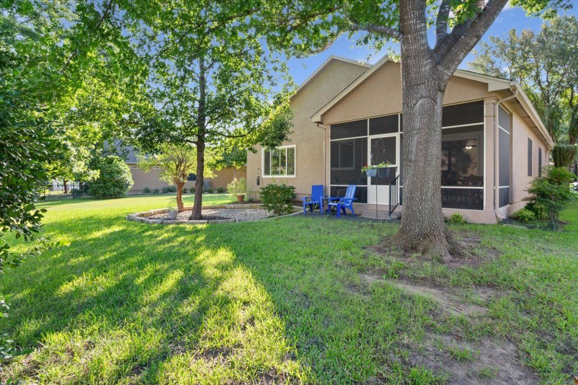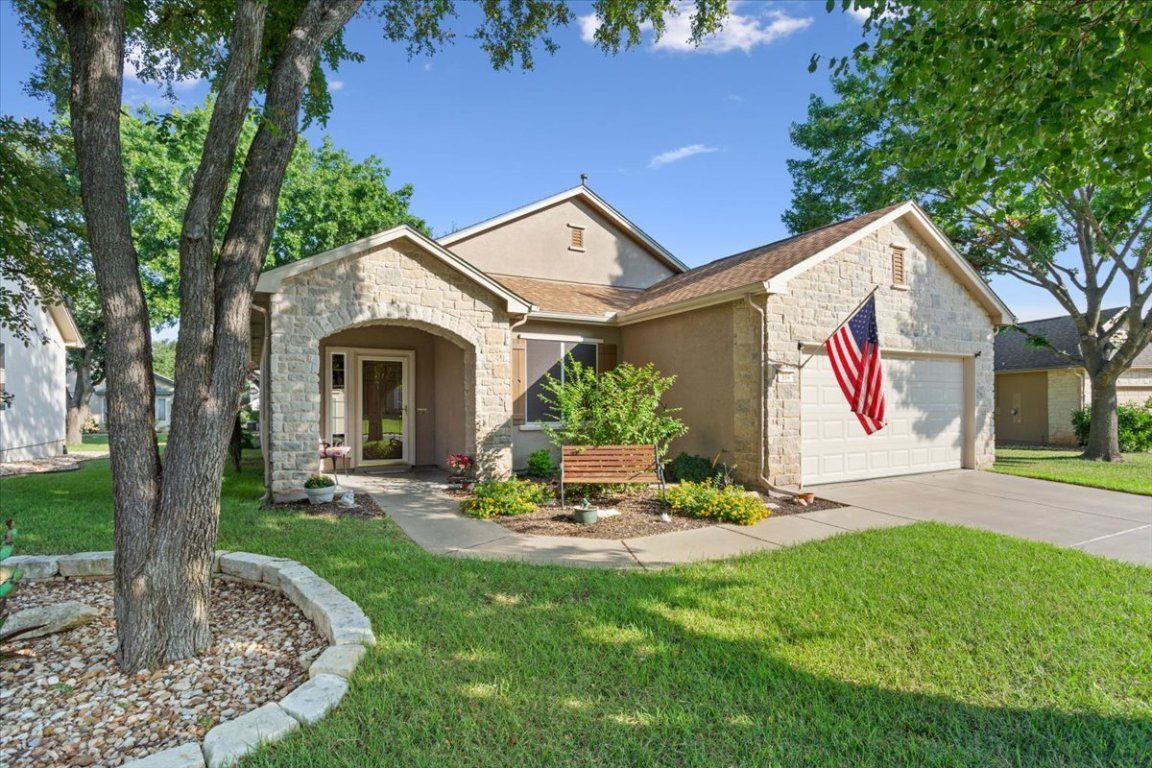 This charming Del Webb Lamar floor plan 3 bedrooms and 2 full bath (central location) in a quiet cul-de-sac. Plantation Shutters thru out the house. Step out back to screened in Patio. Has wood floors thru out house except kitchen and bathrooms are tile. The Living room has built-in bookcase. Primary Bathroom has new shower, and the laundry room includes handy shelf and a wash basin. Bonus updates include: 2023 new water heater, AC replaced in 2016. Water softener installed. Attic is floored for Storage. All this PLUS, located with super easy access to Sun City's Texas Drive Amenity Center, Woodshop, Pickleball, and 8 in door and outside swimming pool with Spa’s. Tennis Courts and THREE 18-hole golf courses!