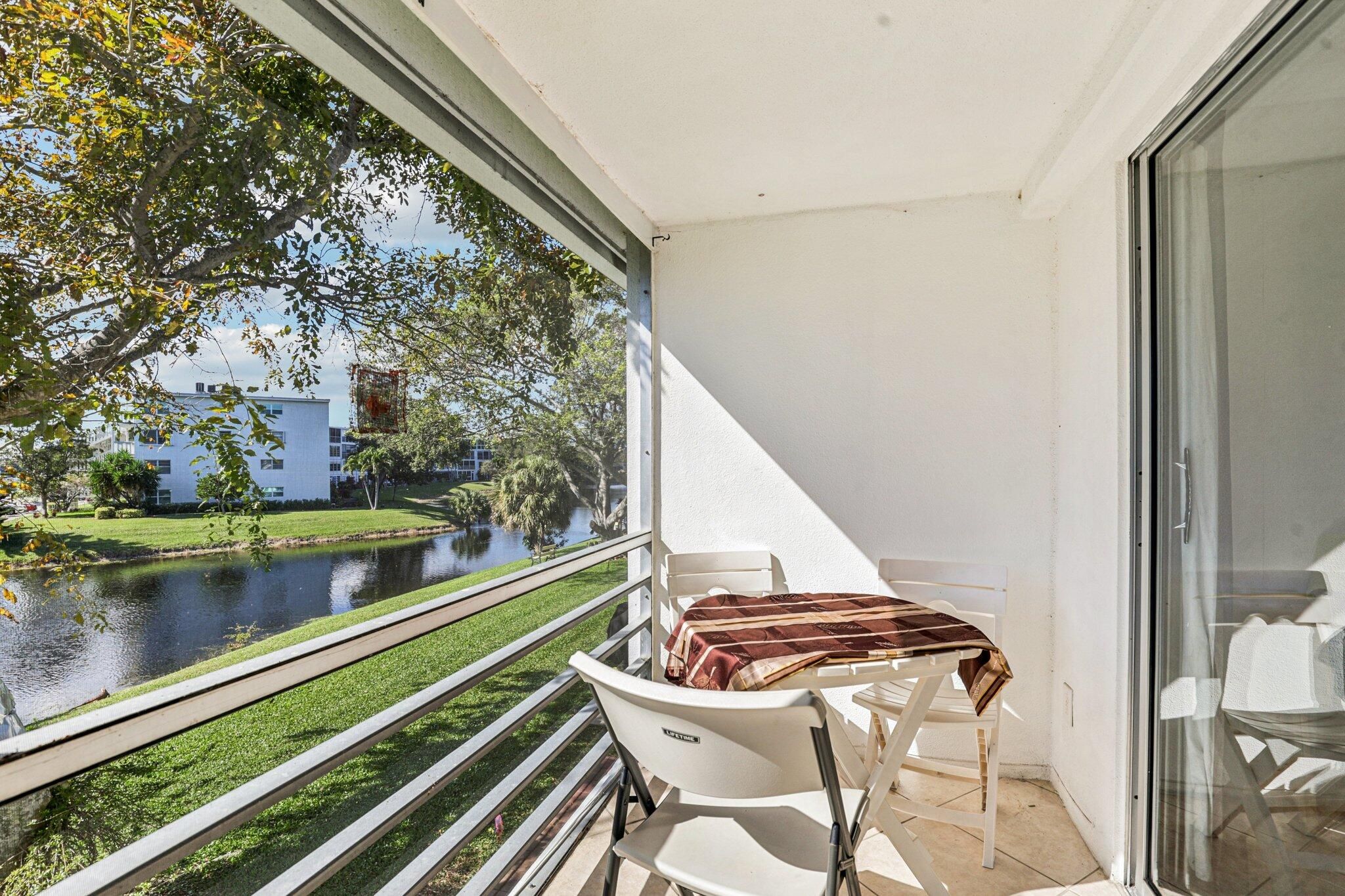 Corner, 2nd floor, walk up unit with a Balcony overlooking Water Views with Central A/C. This adorable condo is a Turn Key. Fully Furnished, Everything is included!. Title floors throughout the home. Steps to a beautiful tropical pool. The building is on a quiet Cul-De-Sac. Century Village is a Gated, Resort Style 55+ Community. Amenities including 12 tennis courts,pickleball, pools, state-of-the-art clubhouse, fitness center, bus service theater. 3 miles to the beach. Lots of shopping near by. Must See!