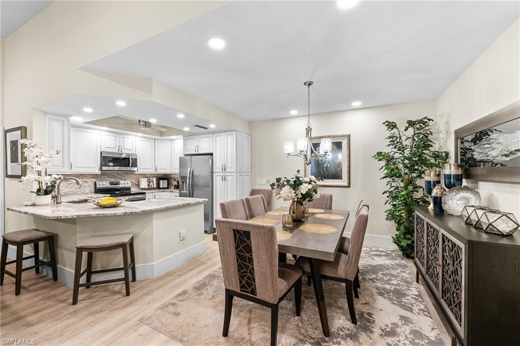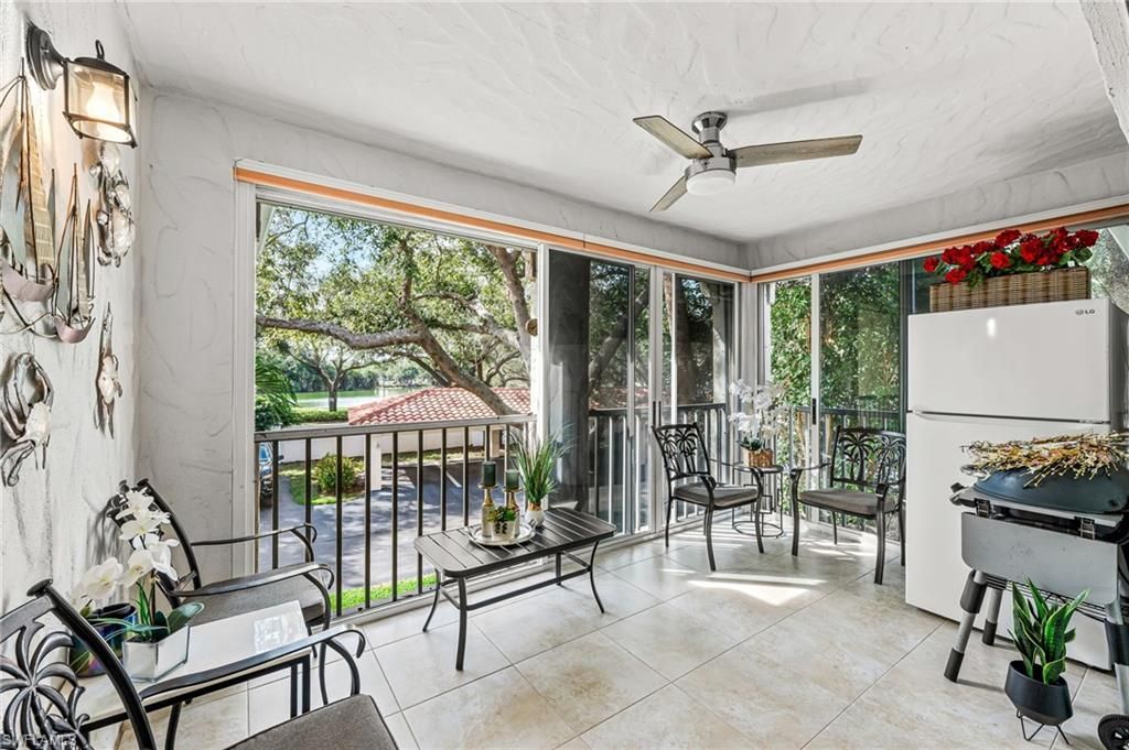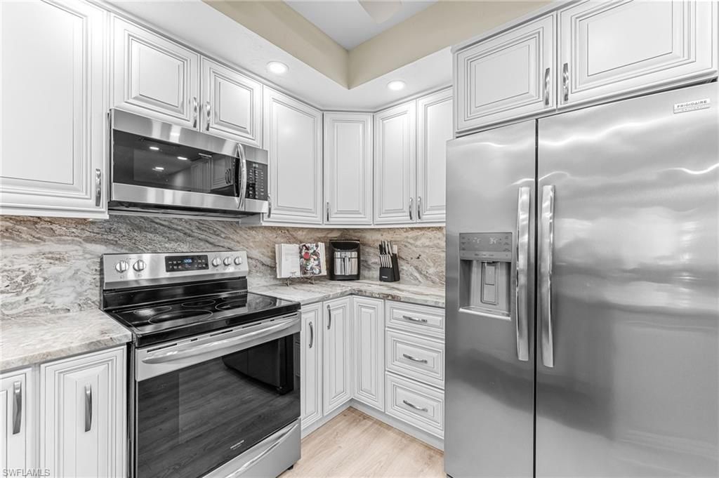 This fully renovated, move-in-ready condo is exactly what you’ve been waiting for. Step inside this bright and inviting unit and immediately notice the new laminate flooring throughout, 9-inch baseboards, crown molding, and recessed lighting that create a clean, modern feel. The living room is anchored by a recessed, wall-mounted electric fireplace—remote-controlled with multi-color flame settings—making it both a stunning focal point and a cozy feature.The home is being offered fully furnished with high-quality pieces from Ashley, City, and Kane’s. The leather sofa includes four electric recliners, providing comfort and convenience from day one.The beautifully renovated kitchen is both stylish and functional. Granite countertops and a matching backsplash provide a sleek, timeless look, while the white soft-close cabinetry includes two lazy Susan corner cabinets and two slide-out rack drawers. A built-in pantry with pull-out shelving offers ample storage. The kitchen is equipped with a new sink, touch-sensor faucet, garbage disposal, and new Frigidaire Gallery appliances.The spacious primary suite features large, sun-filled windows and a generous walk-in closet. The primary bathroom is truly a showstopper, renovated from top to bottom with marble countertops, built-in lighting, defogging mirrors, and a glass-enclosed shower. A dedicated bathroom vent and fan were also added for extra comfort.The guest bedroom is generously sized and includes its own walk-in closet and crown molding. The guest bathroom has also been updated with a new vanity and a beautifully finished shower with a glass door.Step outside to the screened-in patio—spacious, clean, and the perfect place to relax while enjoying sunset views. The community offers beautifully maintained grounds, a serene pond, and surrounding sidewalks ideal for evening walks. Each unit includes one designated covered carport parking space. Additional updates include a new water heater (2024), an AC system replaced in 2018 and regularly maintained, and a tile roof replaced in 2019.Located in the highly desirable Tuscany community, this condo is just a short walk to a Publix plaza and a community park, with quick access to the hospital and interstate. Don’t miss this incredible opportunity—schedule your private showing today!