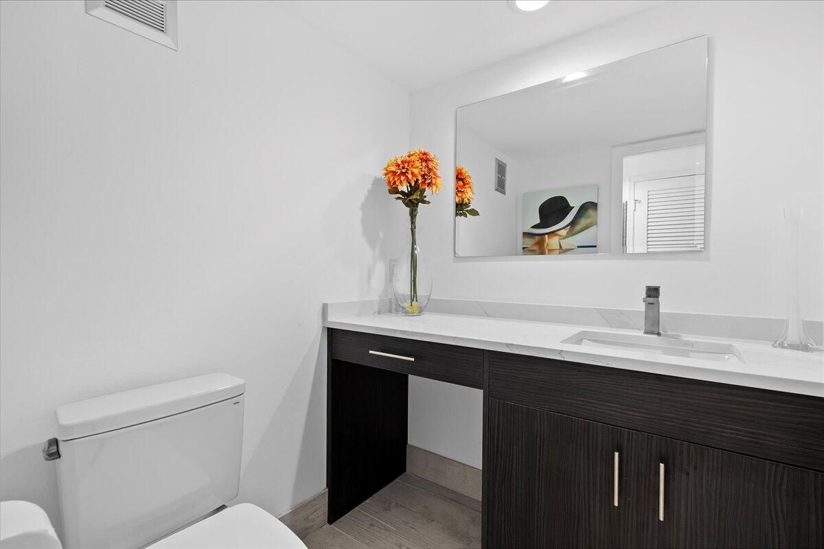 Come see this totally renovated, extra large, lakefront condo with 912 total square feet with 1-bedroom, 1.5-baths, located in one of Century Village's most sought-after luxury buildings in beautiful West Palm Beach. Beautifully redesigned space and sweeping water views, this residence exudes quality, comfort, and modern sophistication at every turn. Step inside to discover a stunning, completely reimagined interior-no detail has been overlooked. The designer kitchen is a true showpiece, featuring sleek white custom cabinetry, elegant Quartz countertops, and stainless appliances (approx. one year old and oven and dishwasher have never been used. The spacious primary suite is a private retreat, offering tranquil lake views, direct lanai access two closets including a generous walk-in,