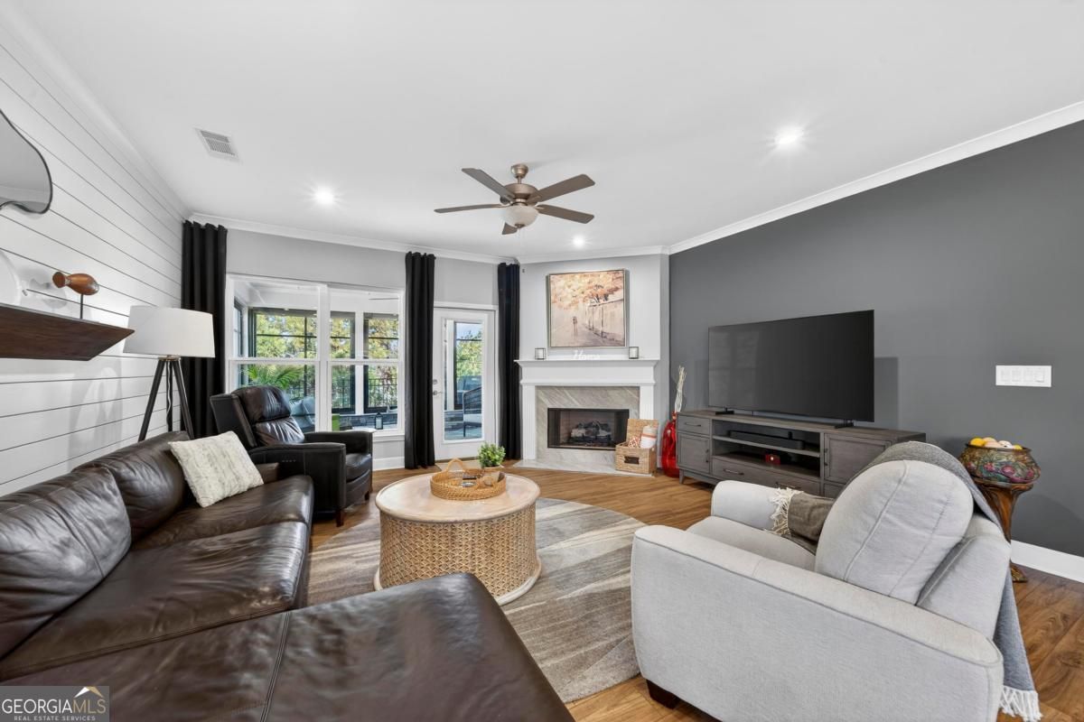 Don't miss this rare opportunity to live in a former model home in sought-after Del Webb! Featuring the community's most popular floor plan the Martin Ray this beautifully maintained residence showcases the builder's best finishes and thoughtful upgrades and is truly turnkey ready. The gourmet kitchen with stainless steel appliances flows seamlessly into the main living and dining areas, highlighted by shiplap accents, designer lighting, and custom window treatments. The spacious primary suite continues the elevated design touches, creating a relaxing retreat. Enjoy year-round living in the all-weather porch featuring custom flagstone and an additional outdoor patio for grilling and entertaining, plus a fenced in backyard. Additional standout features include a walk-up staircase to attic storage with custom built-ins, epoxy flooring in the garage, whole-house Sonos sound system, water softener, fresh interior paint, and a brand-new HVAC system for peace of mind. A one-year home warranty is also included. Stylish, upgraded, and move-in ready - this exceptional home is ready for its next owner to start enjoying the Del Webb lifestyle.