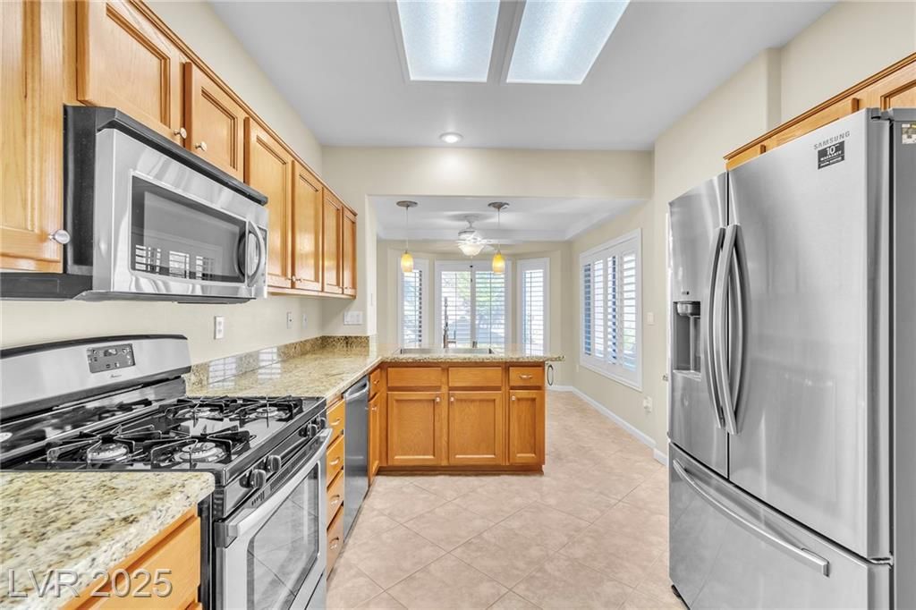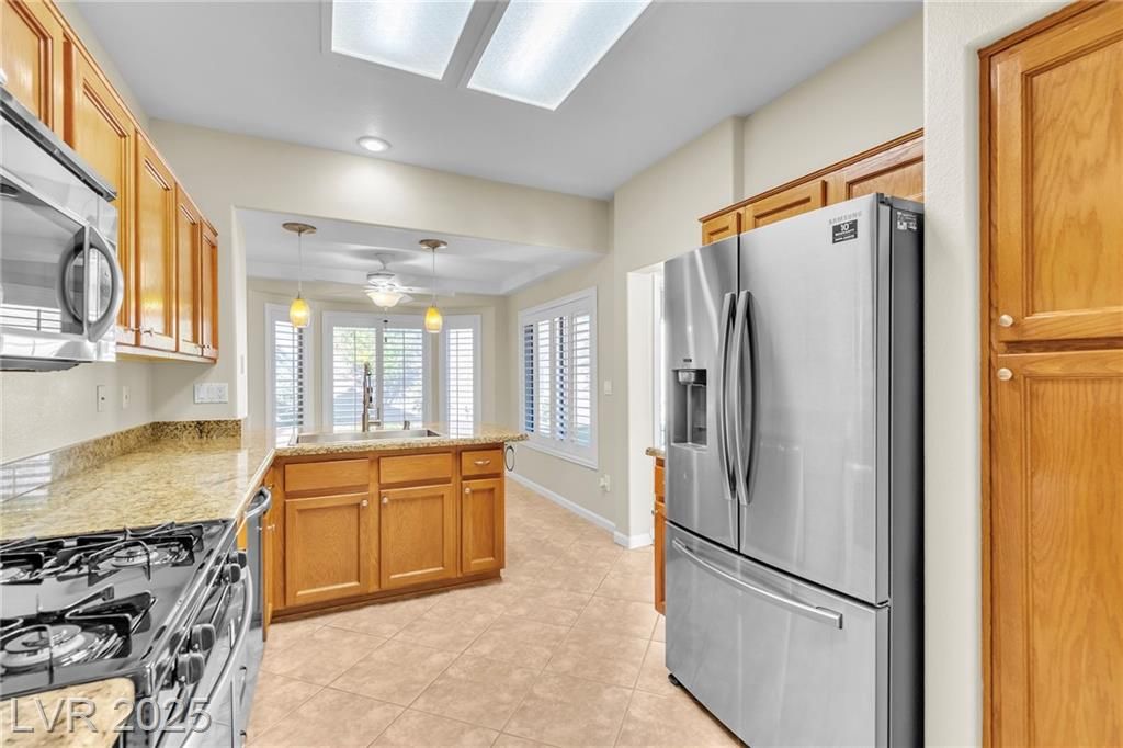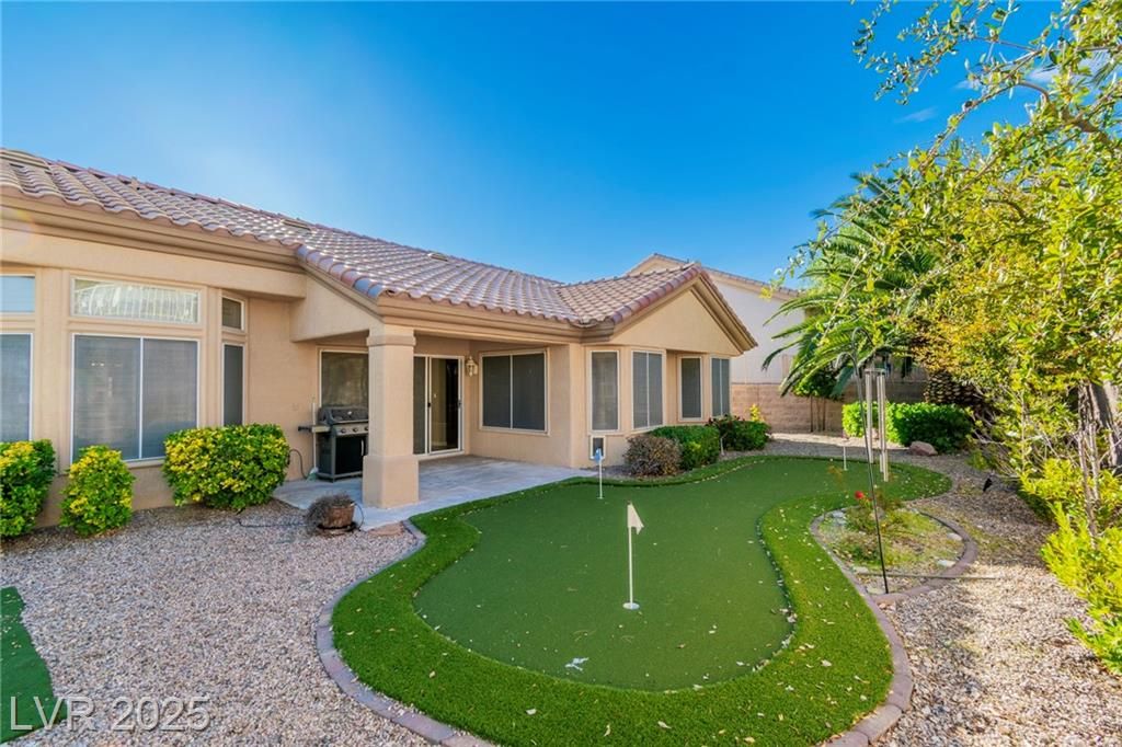 Welcome to this beautiful home in the desirable 55+ Sun City Summerlin community. This open-concept 2-bed, 2-bath home features a split floor plan with vaulted ceilings and abundant natural light. The kitchen offers granite countertops, a breakfast bar, and sunny nook, opening to spacious living and dining areas. The private primary suite includes a walk-in closet and walk-in shower. Shutters throughout. Enjoy the backyard with a covered patio and a fun mini-golf putting area, perfect for relaxing or entertaining. The 2-car garage includes golf cart space and built-in storage. All appliances are included. Sun City Summerlin offers golf, clubhouses, pools, fitness centers, tennis, restaurants, and countless activities, just minutes from Downtown Summerlin shopping and dining.