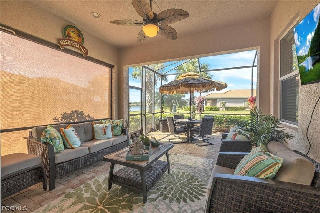 Welcome to this stunning home in Pelican Preserve. This home is impeccably maintained and shows like a model. The spacious lanai with no-see-um screens offers a serene setting to enjoy the expansive view and privacy of the large yard (with room for a pool). Watching the sunsets from the lanai while sipping on your favorite beverage will make every evening special after a full day of activities. Rest assured, the air conditioning and water heater are both new, and all windows are equipped with storm protection. The lanai and entry feature remote storm smart technology for added convenience. The guest bedroom is equipped with a Queen Murphy bed system for flexibility when guests are not present. Luxury vinyl plank flooring in the bedrooms and den, along with plantation shutters and upgraded lighting, enhance the beauty of this home. Closets are have built-ins. The garage even boasts epoxy flooring. Furniture is negotiable, allowing for a seamless transition into this lovely home. Pelican Preserve is a 55+ award-winning community with a plethora of amenities including walking trails, pools, restaurants, pickleball, tennis, fitness facilities, an amphitheater, indoor theater, spa, dog parks, card rooms, and more. Golf is available with memberships offered. Don't miss the opportunity to own this charming home in Pelican Preserve and start living the dream.