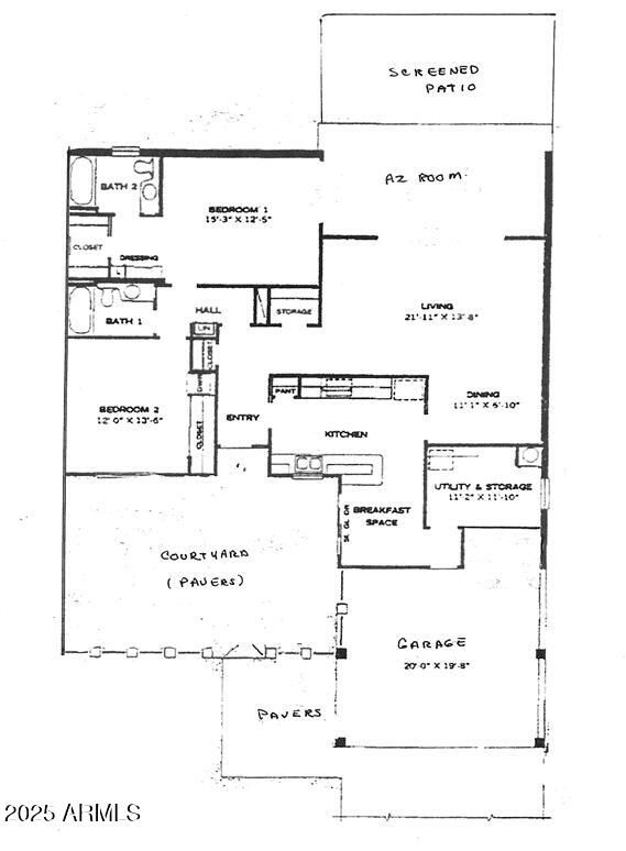 Beautiful front courtyard with pavers welcomes you inside to a remodeled Gemini. Luxury wood-look flooring throughout, large neutral tile in the kitchen and baths. and a remodeled kitchen featuring white cabinetry, stainless steel appliances, quartz counters, and a tiled backsplash. The spacious Great Room and dining area showcase a stained-glass window and flow seamlessly into the large Arizona Room overlooking the screened patio and backyard. The primary bath has been completely remodeled (see photos), while the primary bedroom—currently used as a media room—offers flexible use. Guest bath includes a refinished tub/shower. Newer dual-pane windows throughout. Sewer line updated. This property is move-in ready. Floor Plan in Photos