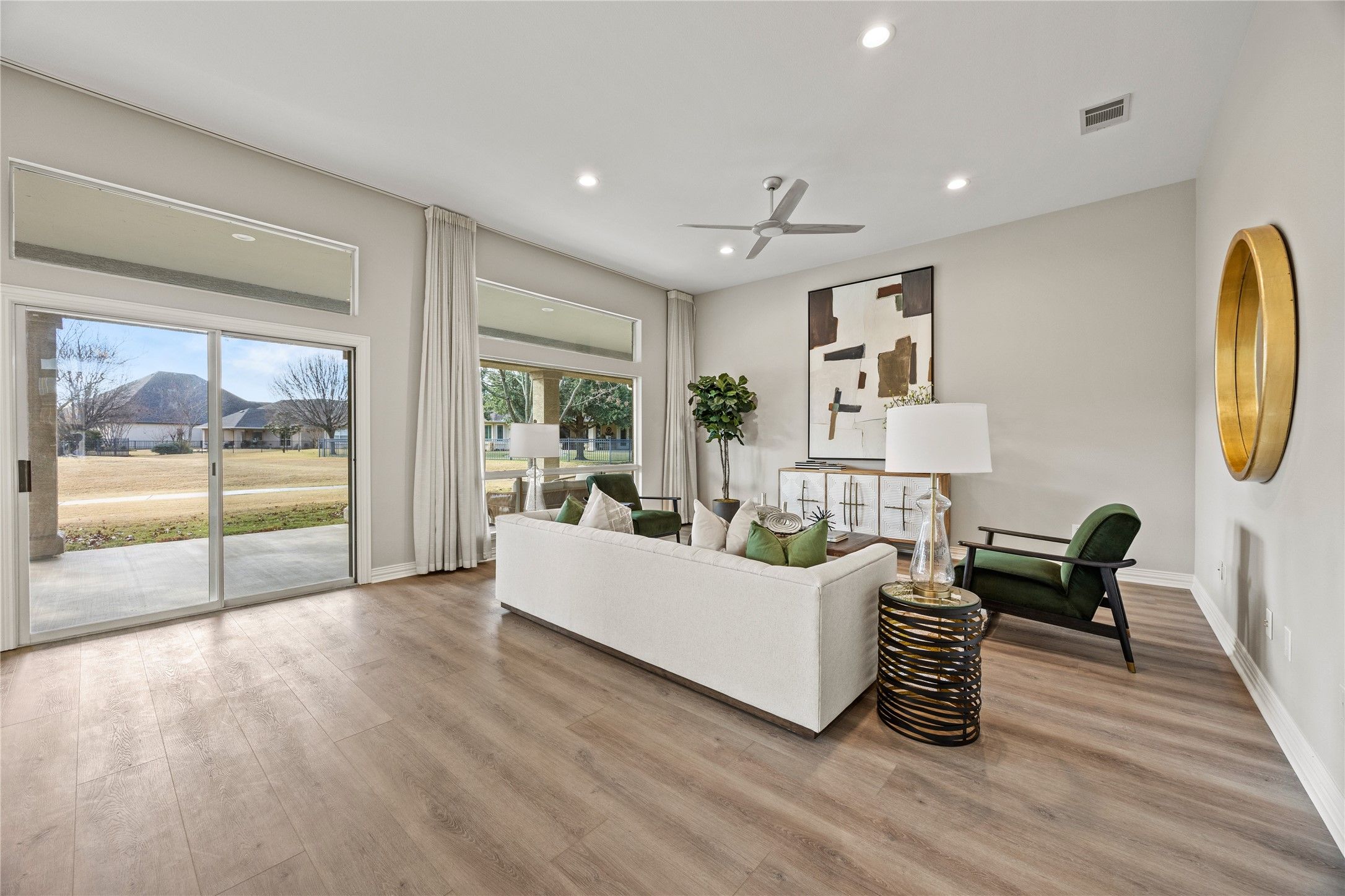 Move right in and enjoy this exceptional, beautifully remodeled Marbella floor plan, perfectly situated along a lush greenbelt with direct walking path access. This spacious home offers a bright, open layout with fresh paint throughout, Luxury Vinyl Plank flooring, new carpet in both bedrooms, and porcelain tile in the baths and utility room. Granite countertops extend throughout the kitchen, baths, and utility area. Additional upgrades include all-new sinks and faucets in the kitchen, bathrooms, and laundry, plus smart home features such as connected light switches, thermostats, door locks, and irrigation control, making this a perfect lock-and-leave property. Additionally, enjoy efficient heating and cooling as both HVAC units were replaced in July 2025. The updated kitchen shines with new stainless steel appliances, granite counters, and a striking ledger stone backsplash. Abundant cabinetry, generous counter space, and a large island make it ideal for meal prep and entertaining. A cheerful breakfast area overlooks the greenbelt, while the open, formal living and dining spaces, with soaring ceilings, provide an inviting atmosphere for gatherings of both large and small groups. The private primary suite offers a garden tub, oversized shower, dual vanities, and a spacious walk-in closet. A versatile hobby room with extensive built-in cabinetry is perfect for crafts or projects. The laundry room features a sink, abundant cabinet storage, and space for a freezer. Additional highlights include a 3-car garage with epoxy flooring. Located in the highly sought-after Robson Ranch 55+ community, residents enjoy resort-style amenities, a resort-style pool, clubhouse, on-site restaurant, golf, social clubs, and the security of a gated neighborhood. This beautifully updated home combines low-maintenance living with exceptional comfort in one of North Texas’s most desirable active adult communities.