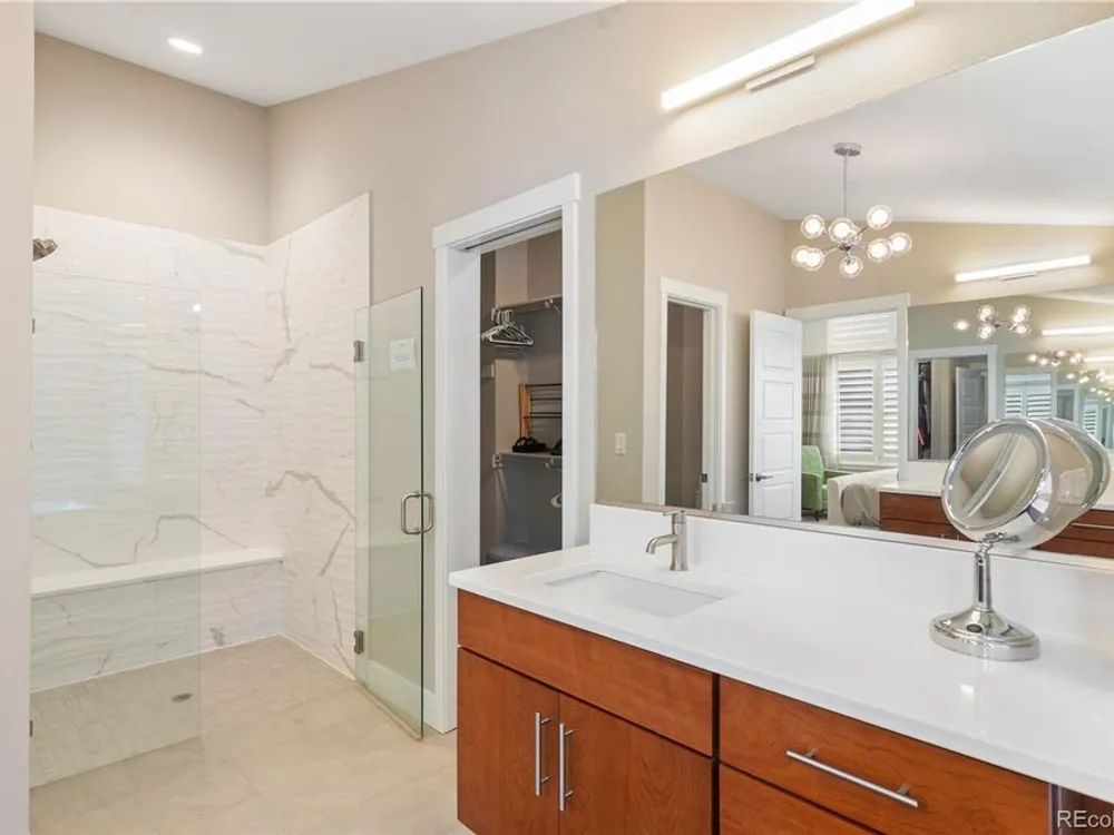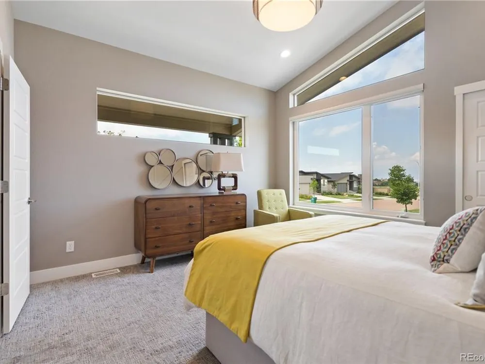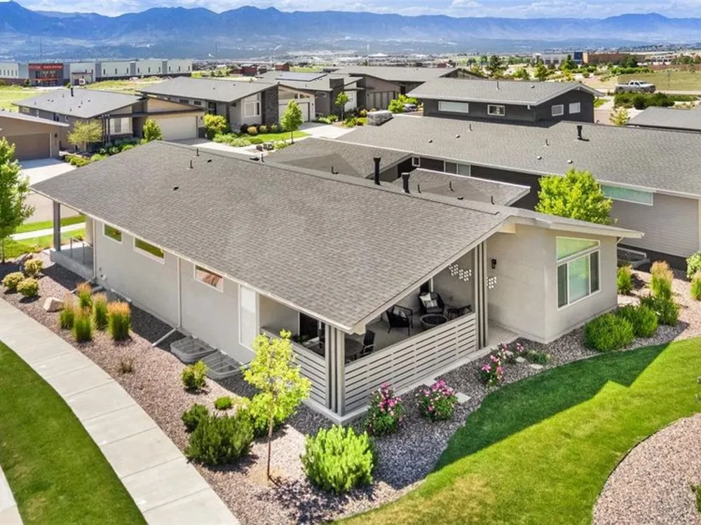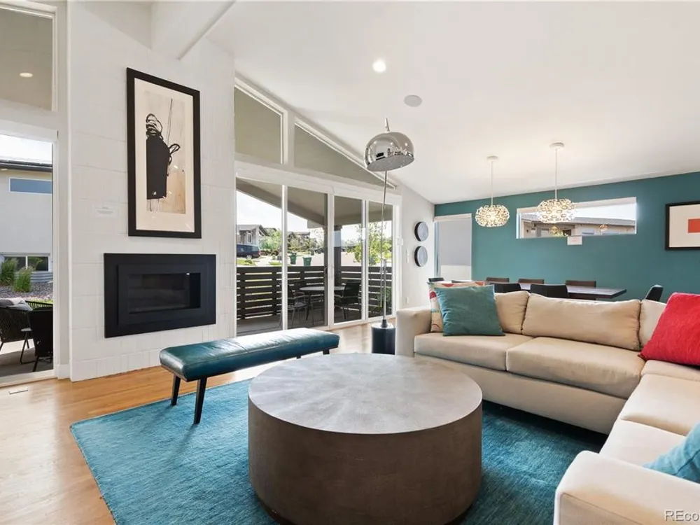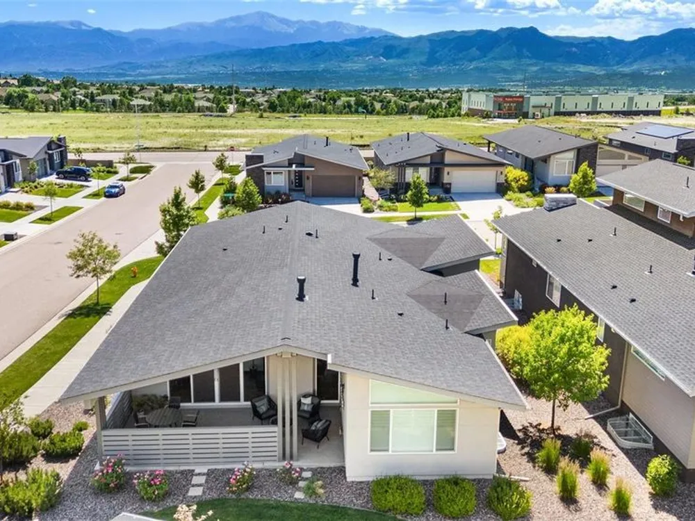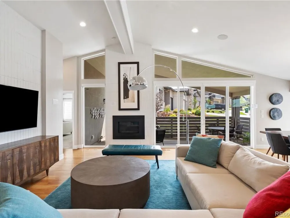 Welcome to this stunning 4-bedroom, 5-bath, 3-car garage ranch-style home in the highly sought-after Élan section of Cordera. Formerly a model and Parade of Homes showcase, this mid-century modern gem is filled with high-end designer upgrades and custom finishes throughout—including custom window treatments throughout the home. Step inside to an open-concept floorplan that seamlessly connects the kitchen, living, and dining areas—perfect for both daily living and entertaining. The great room features a dramatic 12-foot brick fireplace wall, while the entry makes a statement with a custom wood accent wall. The gourmet kitchen impresses with quartz countertops, a striking herringbone backsplash, upgraded appliances, and a unique display cabinet on the island. The main level includes a luxurious primary suite with an upgraded bathroom, a second bedroom with its own ensuite full bath, a stylish powder bath for guests, and a conveniently located laundry room. The fully finished lower level is designed for versatility and comfort, offering a spacious family room with a gas fireplace, wet bar, a yoga room with a mirrored wall, an additional bedroom, two more bathrooms, and an oversized storage room—ideal for a future bedroom, home theater, or fitness studio. Step outside to enjoy the expansive covered concrete patio, complete with a gas line for a firepit, ambient lighting, outdoor speakers, and a privacy wall—an ideal space for relaxing or entertaining. Take in beautiful Front Range views from the front porch, and enjoy the convenience of a 3-car garage with professionally coated floors for easy cleaning and durability. Located close to top-rated schools, shopping, restaurants, hospitals, and Powers Boulevard, this low-maintenance community includes lawn care, irrigation system maintenance, and snow removal—perfect for those who travel often or prefer easy living. All furniture in the home is available for purchase, making this an exceptional turnkey opportunity.