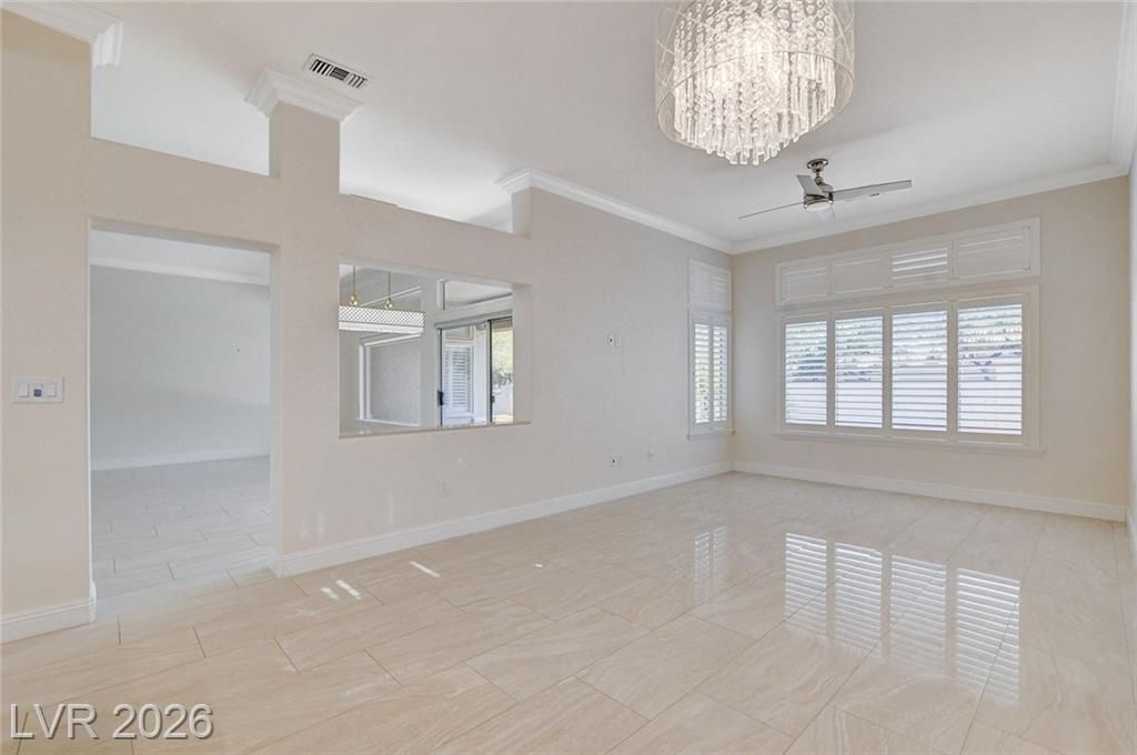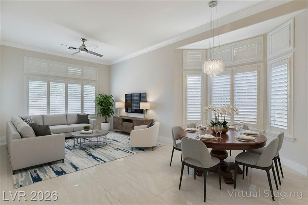 Beautifully Remodeled Hancock Model in Sun City Summerlin! The transom windows throughout fill the house with light. Open floor plan, shutters throughout and16x32” polished porcelain tile. Two bedrooms plus a den, the layout provides comfort and flexibility. The remodeled kitchen has quartz countertops, a backspace, hooded oven, built in wine rack, white cabinets, and stainless-steel appliances. Both bedrooms have luxury vinyl plank flooring. The primary suite includes a bay window, dual sinks, makeup table, separate tub/shower, and a large walk-in closet. Lots of storage cabinets throughout the home. Step outside to a large, covered patio. The 2-car garage includes golf cart parking. Located in the premier 55+ Sun City Summerlin community, you’ll enjoy 3 golf courses, indoor & outdoor pools, fitness centers, pickleball courts, and endless social activities. Just minutes from Downtown Summerlin shopping, dining, and entertainment. This home has an assumable loan at 2.375%!
