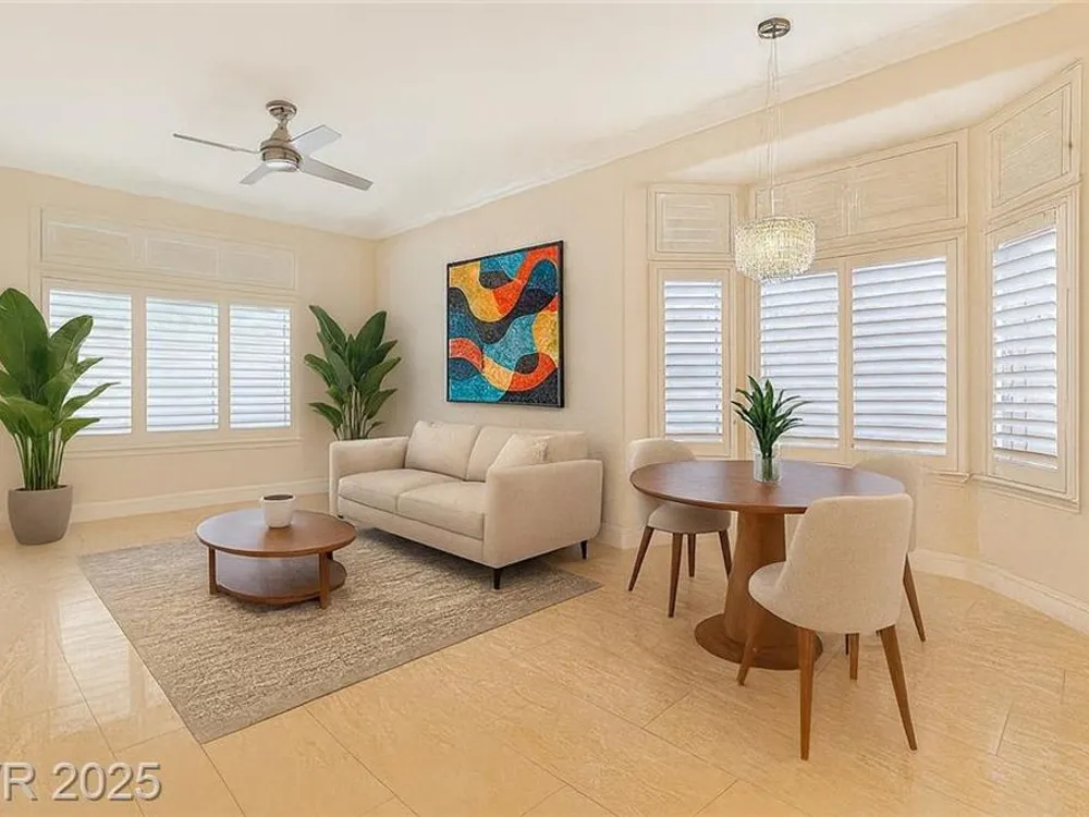 Beautifully Remodeled Hancock Model in Sun City Summerlin! This light-filled home features an open floor plan with shutters throughout and striking high-gloss 16x32” polished porcelain tile. Two bedrooms plus a den, the layout provides comfort and flexibility. The remodeled kitchen has quartz countertops, a backspace, hooded oven, built in wine rack, white cabinets, and stainless-steel appliances. Both bedrooms have luxury vinyl plank flooring. The primary suite includes a bay window, dual sinks, makeup table, separate tub/shower, and a large walk-in closet. Lots of storage cabinets throughout the home. Step outside to a large, covered patio. The 2-car garage includes golf cart parking. Located in the premier 55+ Sun City Summerlin community, you’ll enjoy 3 golf courses, indoor & outdoor pools, fitness centers, pickleball courts, and endless social activities. Just minutes from Downtown Summerlin shopping, dining, and entertainment. This home has an assumable loan at 2.375%!