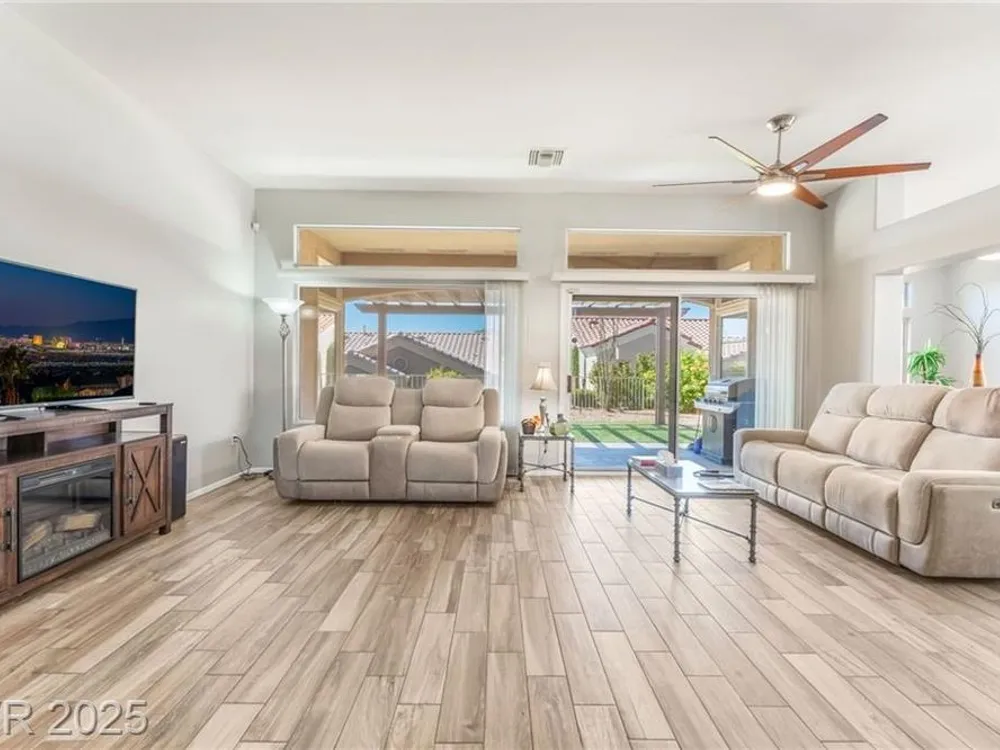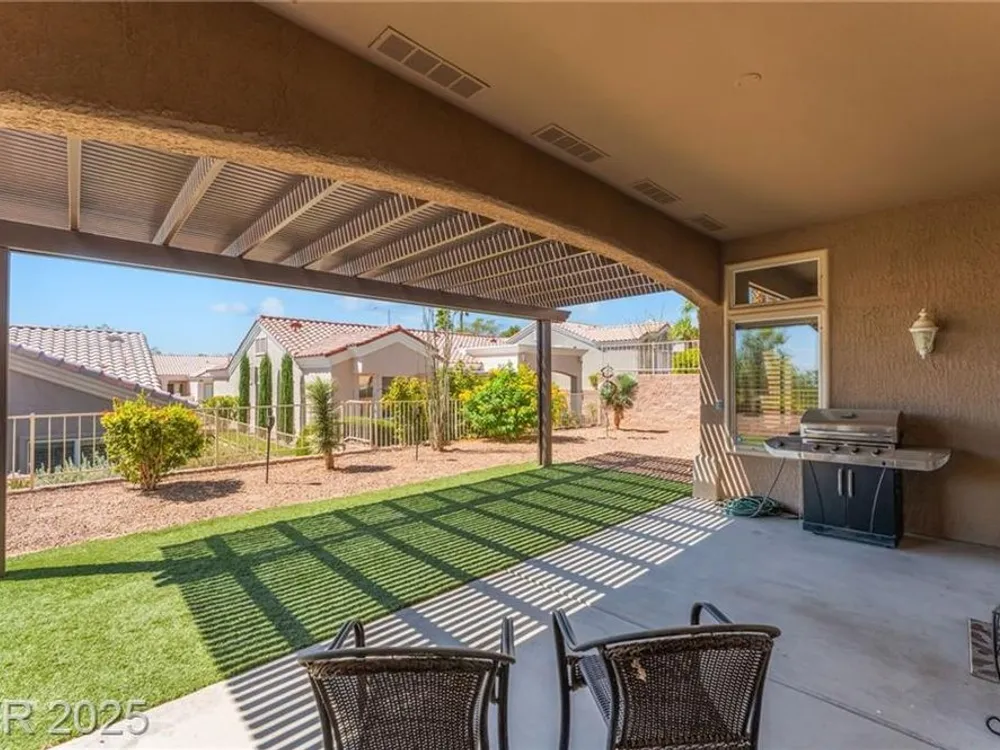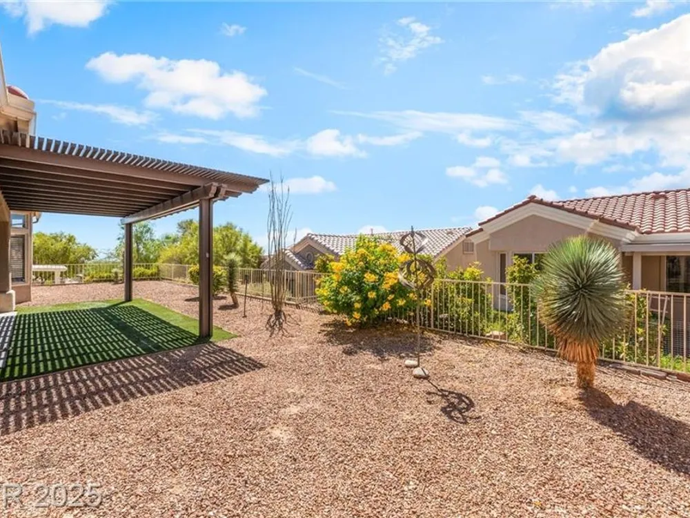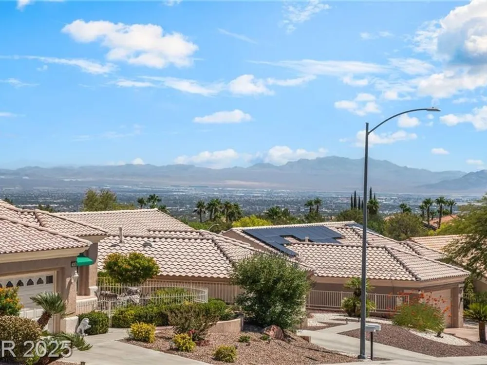 Stunning Hancock Model – Immaculate Inside & Out! Bright & open floor plan. This beautifully upgraded home features 2 bedrooms plus a versatile office/den and a fully fenced backyard is a PLUS! City/strip & mountain views from the front yard. Inside, you'll find elegant porcelain plank tile, granite countertops, and refaced cabinetry. The chef’s kitchen is a dream, boasting high-end appliances including a top-of-the-line LG stainless steel smart refrigerator, double ovens, dishwasher, and a Wolf gas cooktop. Additional upgrades include a remodeled primary bath offers multi head walk in shower, dual sinks with granite counters. Dual closets in Primary. Premium SpringWell water softener system. Enjoy outdoor living under the extended patio cover surrounded by professionally landscaped front and back yards.Amenities include access to the Summit Restaurant, Starlight Theater, and Eagle Crest Golf Course. Close to Summerlin Parkway, the 215 & DTS. TURN KEY!!