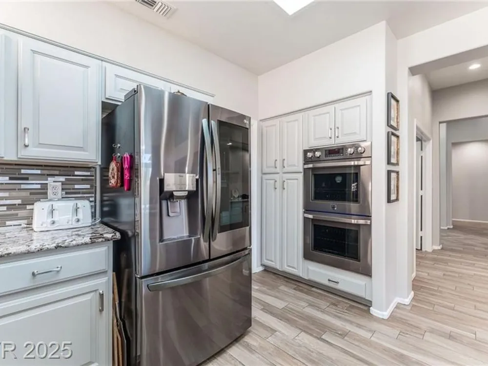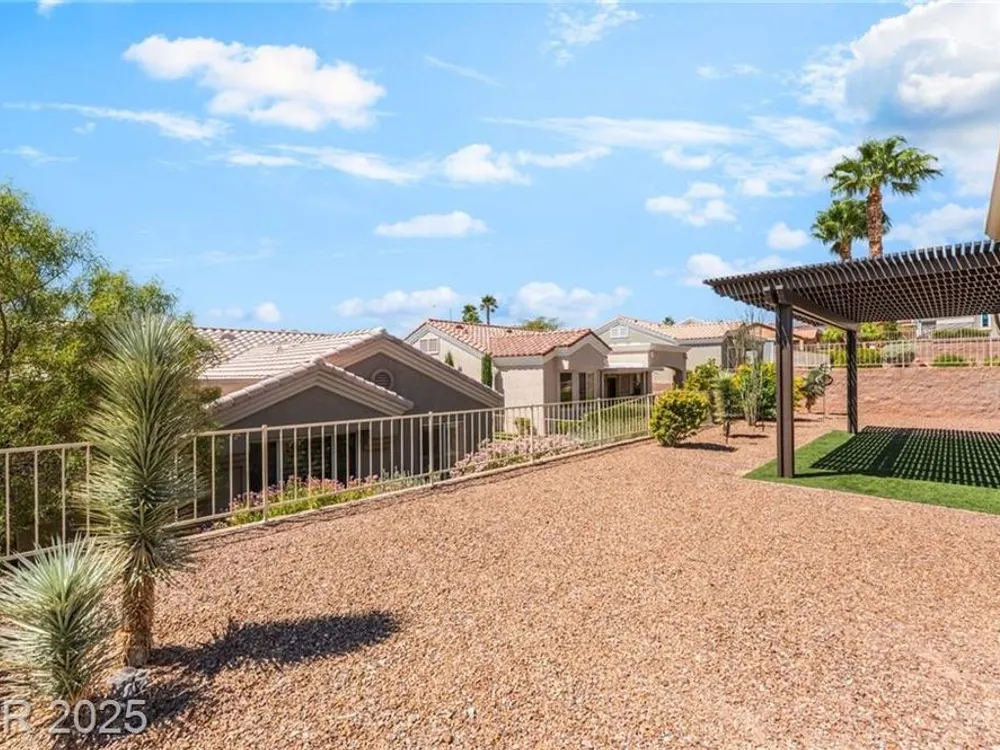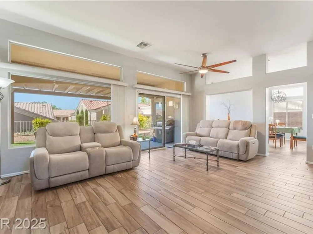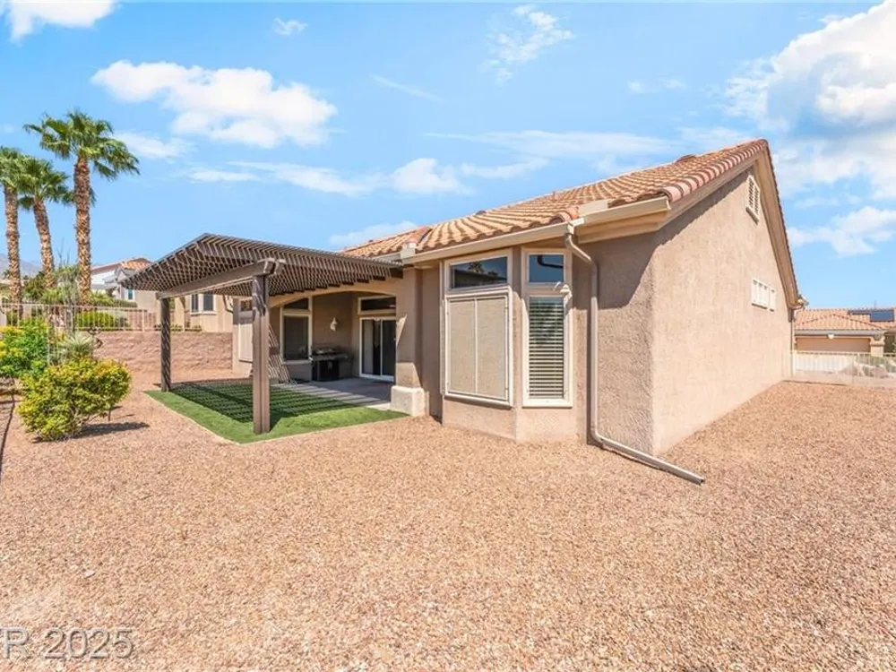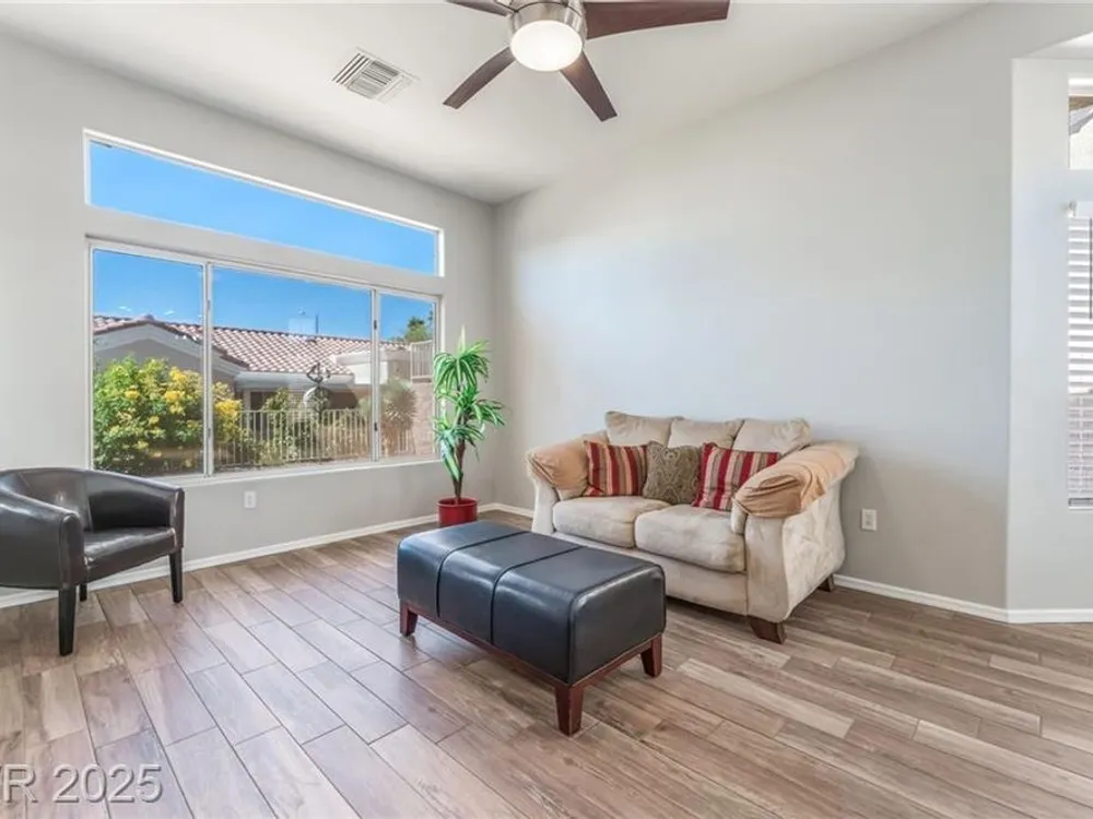 Stunning Hancock Model – Immaculate Inside & Out! Bright & open floor plan. This beautifully upgraded home features 2 bedrooms plus a versatile office/den and a fully fenced backyard is a PLUS! City/strip & mountain views from the front yard. Inside, you'll find elegant porcelain plank tile, granite countertops, and refaced cabinetry. The chef’s kitchen is a dream, boasting high-end appliances including a top-of-the-line LG stainless steel smart refrigerator, double ovens, dishwasher, and a Wolf gas cooktop. Additional upgrades include a remodeled primary bath offers multi head walk in shower, dual sinks with granite counters. Dual closets in Primary. Premium SpringWell water softener system. Enjoy outdoor living under the extended patio cover surrounded by professionally landscaped front and back yards.Amenities include access to the Summit Restaurant, Starlight Theater, and Eagle Crest Golf Course. Close to Summerlin Parkway, the 215 & DTS. TURN KEY!!