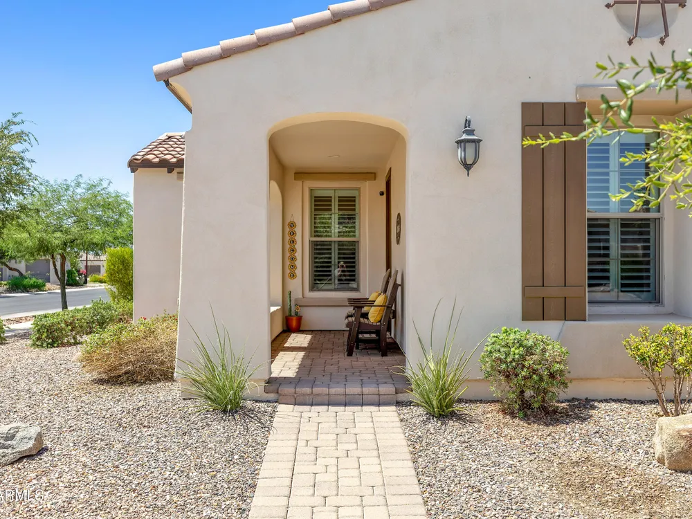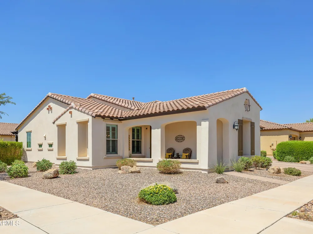 Encore active adult living at its best in this well-designed London, great rm plan which offers 2,005 square feet of living space with 2bed/2 baths, a dining rm/flex rm, & a den with dble doors, providing versatile living options. The kitchen features white cabinets with pullouts, granite countertops, a designer backsplash, & a lg island. SS appliances-including a gas stove-& a W-I pantry with door caddy enhance the culinary experience. Additional highlights include a custom entertainment center with storage & a custom desk at key drop and the laundry rm, with upper & lower cabinets. You'll love the many extras: custom shutters, eight-foot doors, 5.25-inch baseboards, & wood-look tile T/O except bdrms. The easy maintenance oversized, premium corner lot provides ample outdoor space...... , while the custom features create a comfortable and functional ...living environment. The 2-car garage includes built-in cabinets & overhead storage. Enjoy all that Encore offers, with pickle ball, tennis, bocce ball, walking paths, & expansive green space. The clubhouse features a workout facility, movement room, billiards room, craft room with two kilns, meeting spaces, and the Proving Ground Café. This is a must see!!!