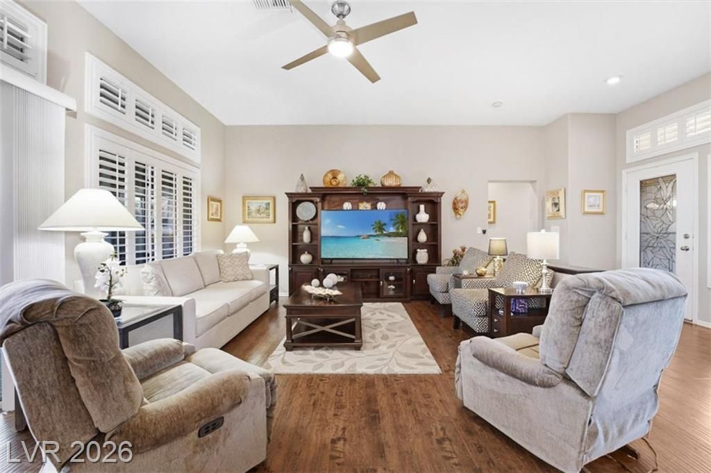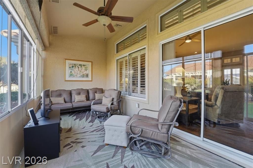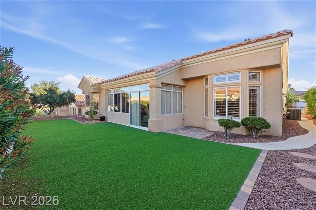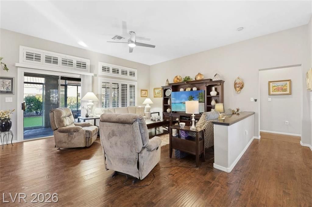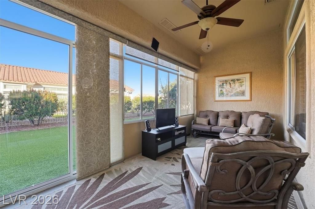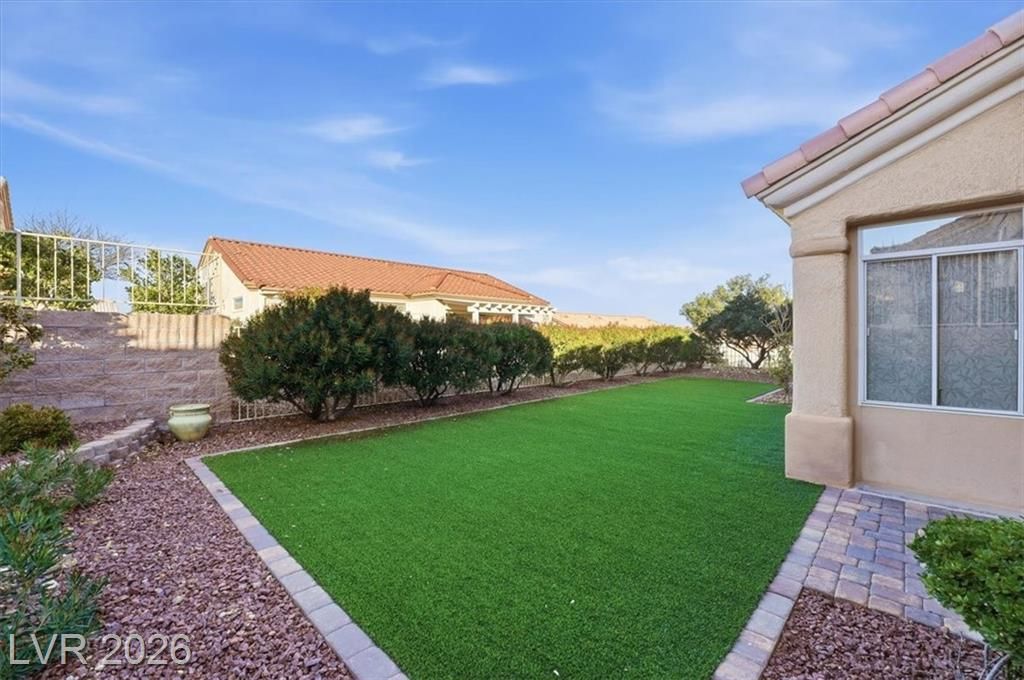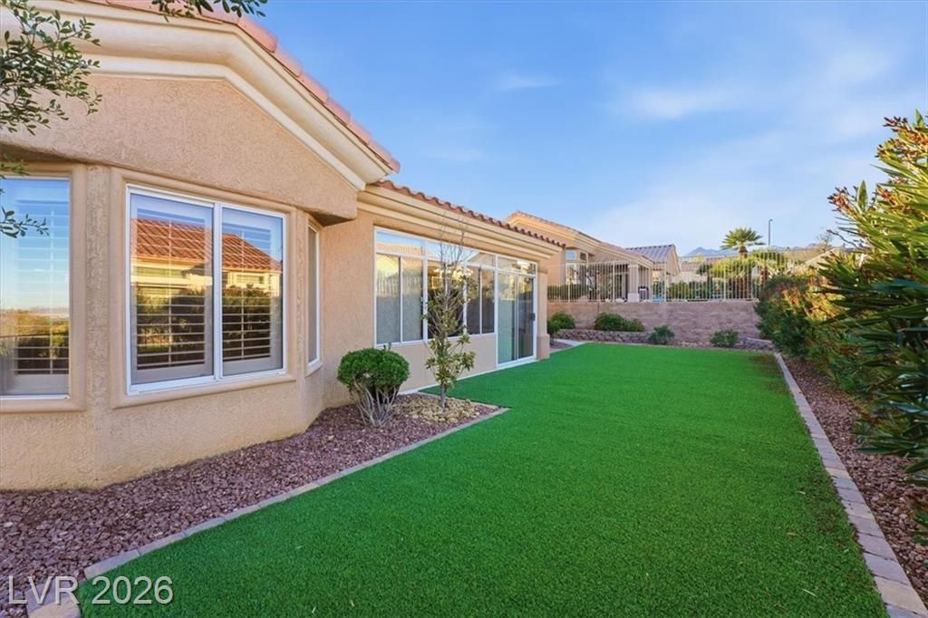 Updated 2-bedroom home in the highly desirable Sun City Summerlin, offering comfortable, low-maintenance living. Laminate wood floors run throughout this move-in ready home. The kitchen features stainless steel appliances, granite counters, breakfast bar, and a nook. The living room opens to a formal dining area and an enclosed sunroom, ideal for relaxing or entertaining. The primary bedroom offers vaulted ceilings while the fully renovated primary bathroom includes new cabinets, counters, flooring, and a tiled shower surround. The fully fenced yard features synthetic turf for pet-friendly living. Energy costs can be exceptionally low with a Tesla 3.7kW solar system that covers nearly all of the current owner’s monthly usage. The 2-car garage includes storage cabinets and space for a golf cart. Residents enjoy access to Sun City’s clubhouses, pools, fitness centers, social clubs, walking trails, and golf courses, all conveniently located near shopping, dining, and medical services.