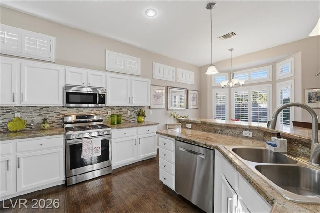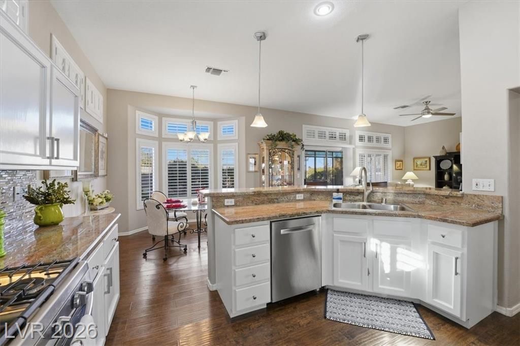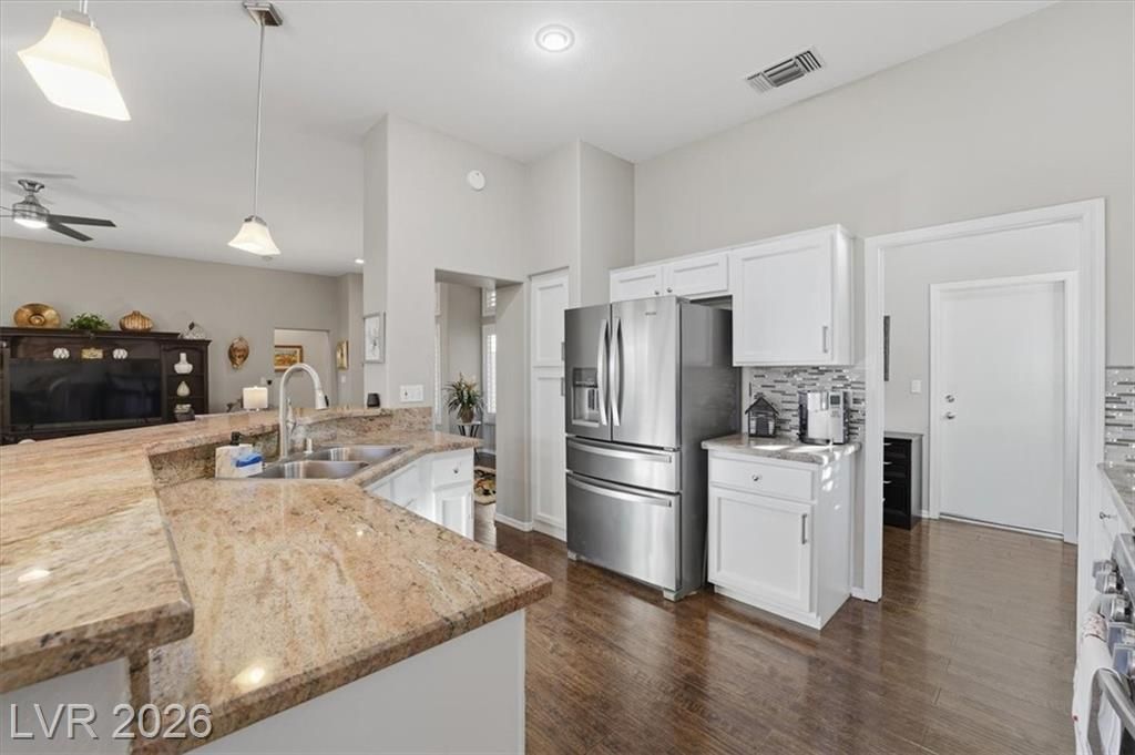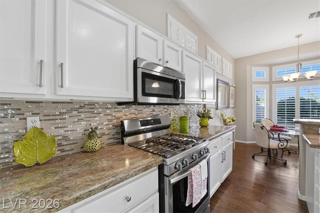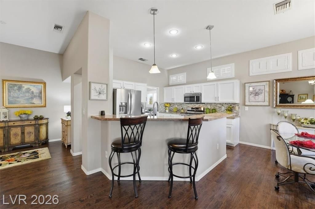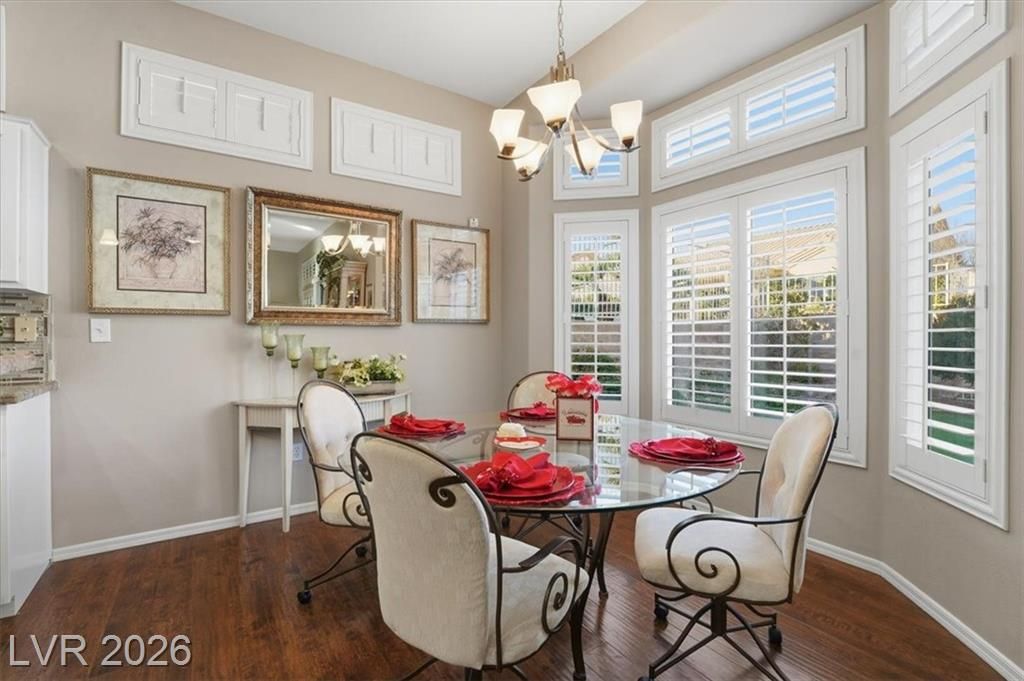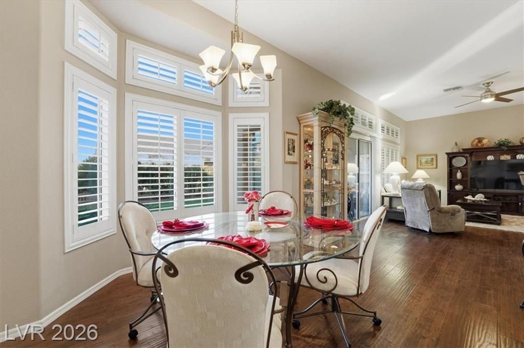 Updated 2-bedroom home in the highly desirable Sun City Summerlin, offering comfortable, low-maintenance living. Laminate wood floors run throughout this move-in ready home. The kitchen features stainless steel appliances, granite counters, breakfast bar, and a nook. The living room opens to a formal dining area and an enclosed sunroom, ideal for relaxing or entertaining. The primary bedroom offers vaulted ceilings while the fully renovated primary bathroom includes new cabinets, counters, flooring, and a tiled shower surround. The fully fenced yard features synthetic turf for pet-friendly living. Energy costs can be exceptionally low with a Tesla 3.7kW solar system that covers nearly all of the current owner’s monthly usage. The 2-car garage includes storage cabinets and space for a golf cart. Residents enjoy access to Sun City’s clubhouses, pools, fitness centers, social clubs, walking trails, and golf courses, all conveniently located near shopping, dining, and medical services.