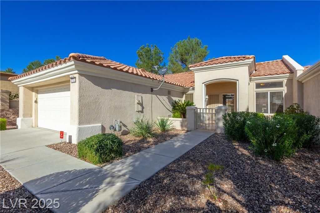 Pristine, upgraded, ready to move in and enjoy! Gated courtyard and covered back patio w/ barbeque stub for outdoor living. Beautiful quartz countertops in the kitchen w/ all appliances, including built in microwave. Primary bath has double sinks and custom tiled shower. Relaxing secondary bath has custom bowl sink and newly installed walk in bathtub w/ all the bells and whistles! Washer and Dryer stay in the separate laundry room off of the oversized 2 car garage w/ golf cart parking and locking built in cabinets. This well maintained home has it all, must see to believe! Just move in and start enjoying the esteemed community of Sun City Summerlin and all it's amenities!