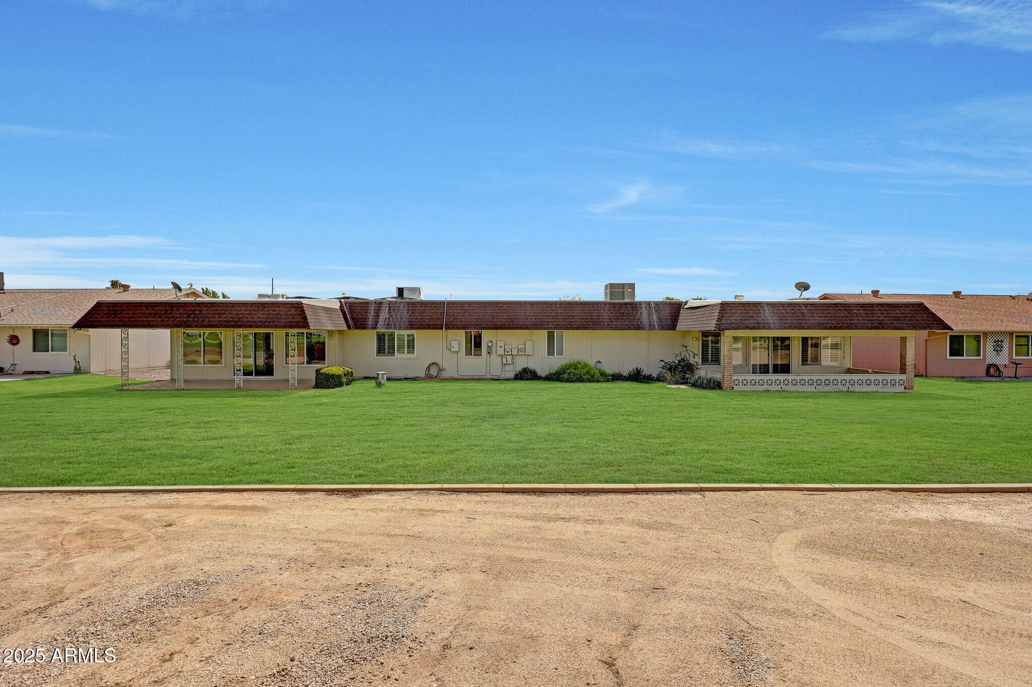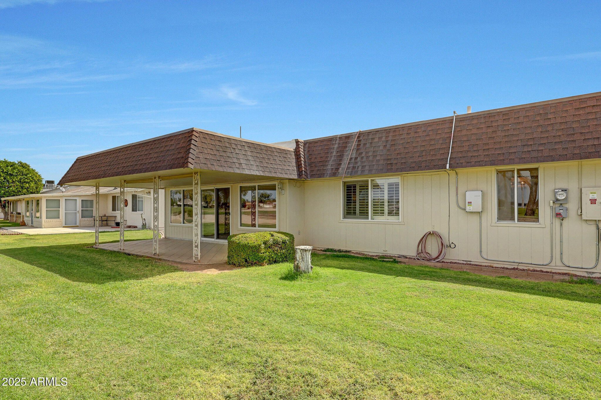 This is the ONE! Overlooking the 16th hole at Lakes East, this beautifully updated D35 Model featuring 2 bed/2 bath offers a bright, OPEN and EXPANDED layout designed for easy living and entertaining. The UPDATED kitchen features premium cabinetry, granite countertops, and stainless-steel appliances. Start your day in the Arizona room with sweeping GOLF COURSE VIEWS, then retreat to the spacious primary suite—also showcasing views of the green. A large laundry room provides excellent storage. Solar helps keep APS bills low. RENTALS ALLOWED. Unbeatable location: minutes to Sundial Rec Center, shopping and dining; just a quick trip to Arrowhead and the P83 Entertainment District. Whether you're seeking a year-round haven or a sunny winter retreat, this home delivers it all. Priced to SELL