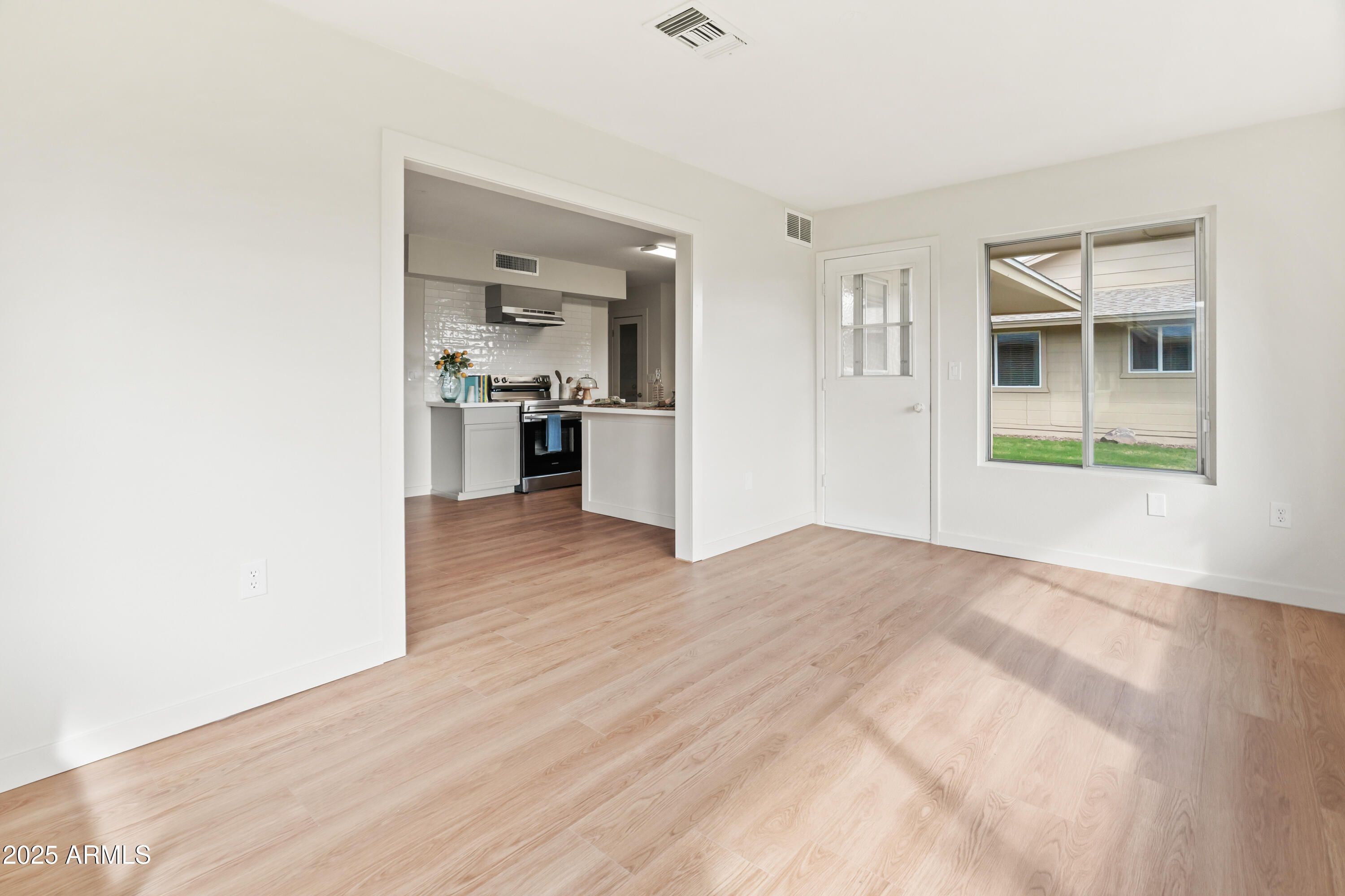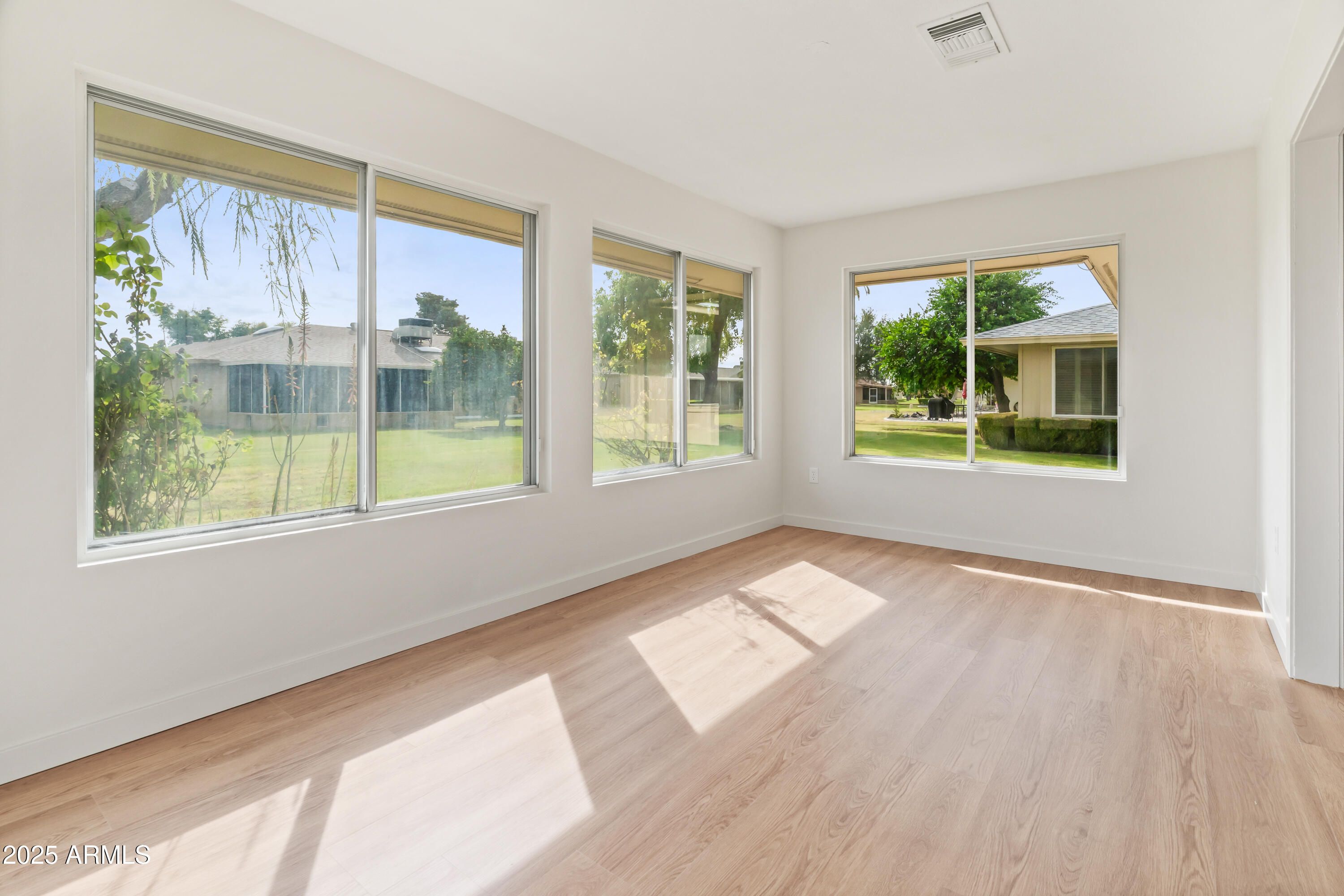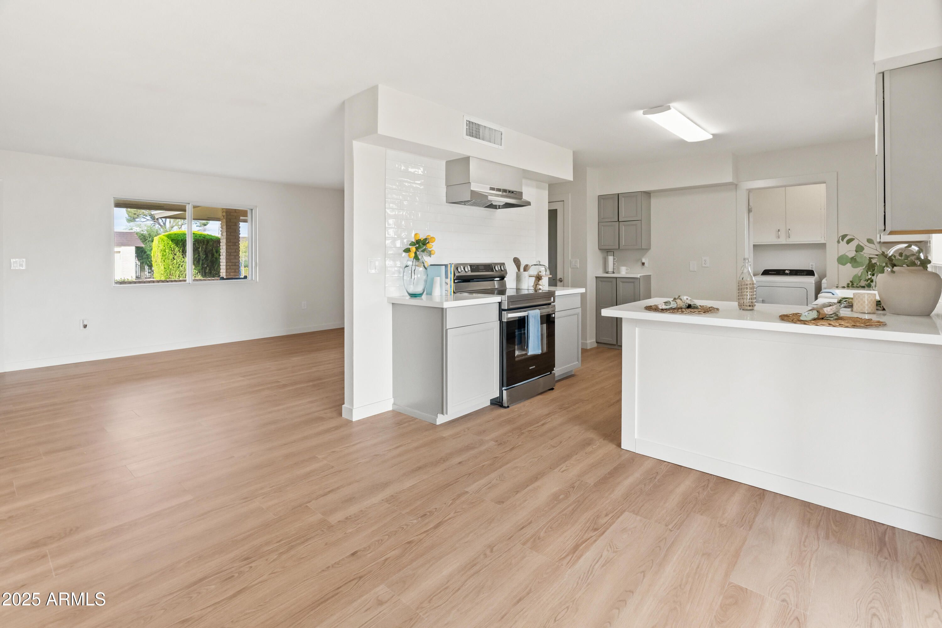 Fresh, bright and updated, this 2BD/2BA Gemini home in Sun City is filled with soft natural light and peaceful greenbelt views from the Arizona room. New luxury LVP floors, 4'' baseboards, fresh paint, and a custom entertainment wall for up to an 85'' TV. Kitchen has new cabinets, quartz counters, an island, apron sink, Samsung appliances, custom backsplash, and glass pantry/laundry doors.Both bathrooms have new vanities and toilets. Washer & dryer included! New water heater and upgraded electrical. Newer Trane HVAC and roof for added peace of mind. Move in and enjoy the Sun City lifestyle: golf mornings, rec centers, endless clubs, pools, and an active-adult community where neighbors become friends. Beautifully updated and easy to love!
