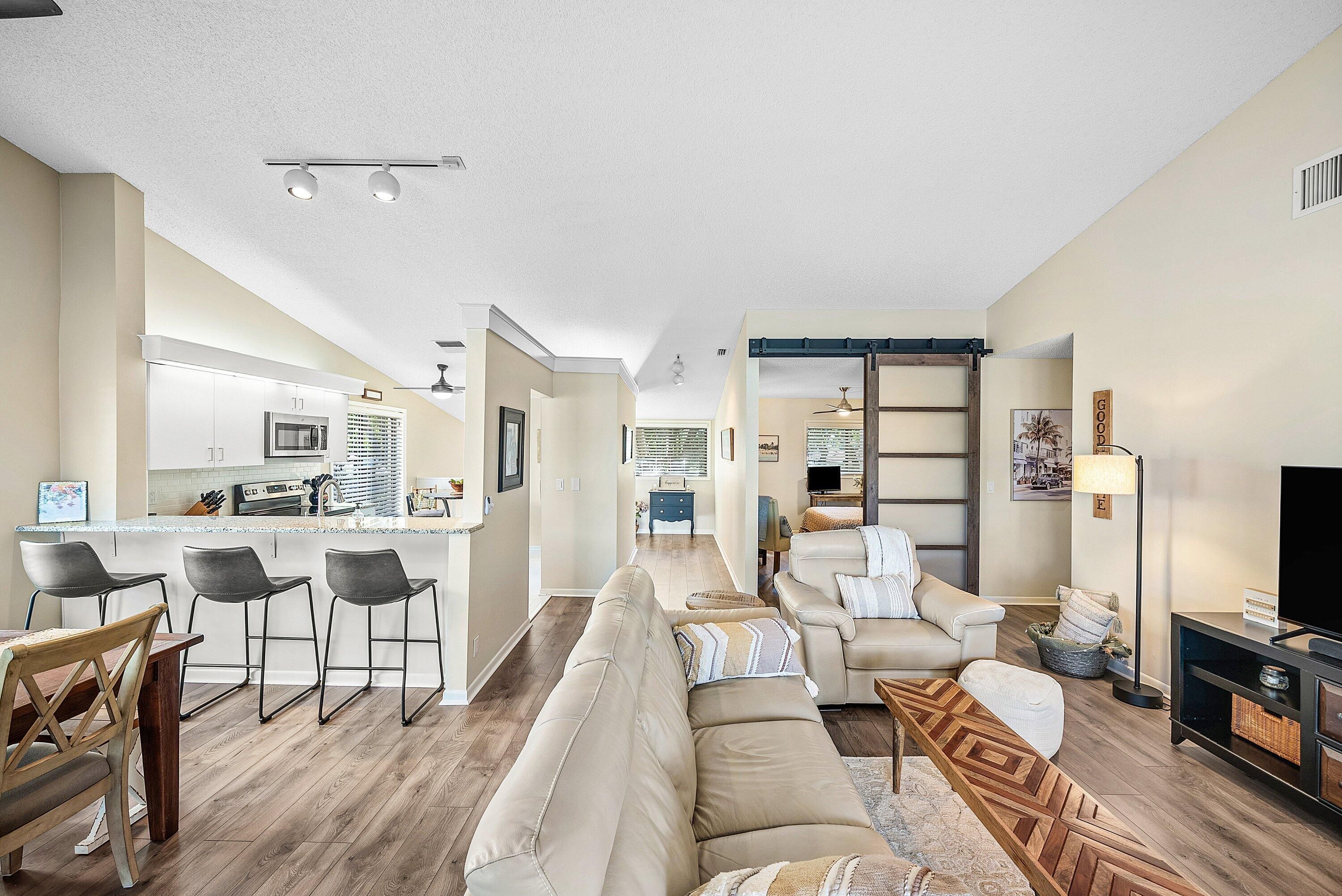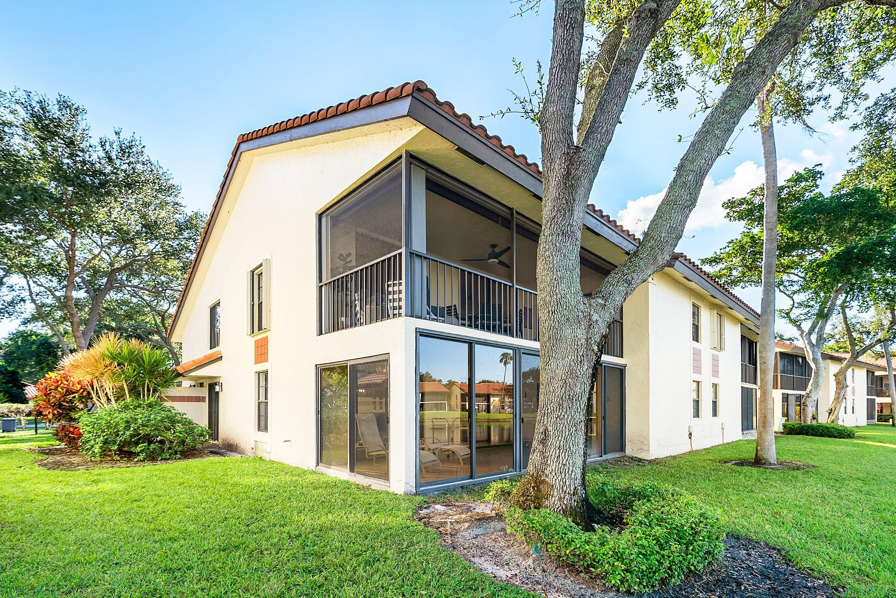 Lovely lakefront REMODELED corner unit in desirable 55+ Palm Chase Lakes. Steps to amenities and a SHORT walk to worship makes this one a must see! Move-in ready. Light, bright and open is what you immediately feel with the soaring ceilings and premium LAKE VIEW. Wood plank laminate flooring throughout - no carpet! Kitchen has been thoughtfully upgraded with subway tile backsplash, granite counter tops, porcelain tile floors, newer appliances and BRAND NEW dishwasher. Eat-in breakfast area is the perfect place for coffee in the morning. Great room is open to the kitchen and dining area allowing perfect entertaining flow. Enjoy the large screened-in lanai w/ remote, retractable blinds overlooking the glistening lake. Accordian shutters protect the lanai. Natural breezes flow from this vantage point. Primary bedroom is tucked away and includes a large walk-in closet, 2nd closet, sliders to the patio and a remodeled bathroom. 2nd bedroom is private w/ adjacent remodeled bathroom. 3rd bedroom has custom barn doors providing privacy for guests or a quiet office/den space. Full-size washer and BRAND NEW dryer | 2022 AC | 2021 Water Heater | Storage will never be an issue here w/ 1st floor walk-in utility closet & attic space. Palm Chase Lakes is a double gated community (El Clair Ranch & Boynton Beach Blvd) in Boynton Beach perfectly located close to shopping, worship, restaurants and convenient to medical services. Sprouts, Whole Foods, Publix, Aldi & KC Market only minutes away. Amenity-rich community offers an active lifestyle including large pool & spa, tennis, pickleball, shuffleboard, billiards, game/card room, social calendar w/ entertainment, fitness center, steam room, sauna, and walking/jogging paths. You can have a full social calendar or enjoy tranquil solace - all to your individual liking! Small pet friendly. CONDO FEE INCLUDES - building insurance, roof maintenance, water, trash, sewer, pest control, ADT security, internet, basic cable, lawn care, painting, reserve funds for future projects and more!