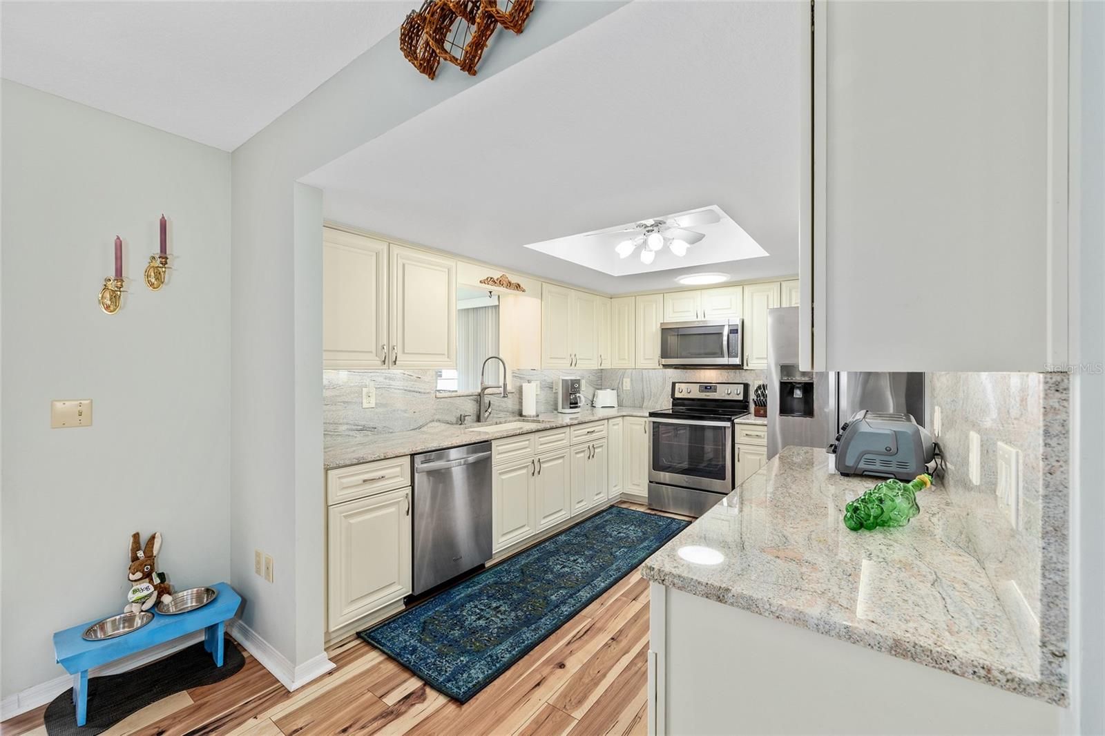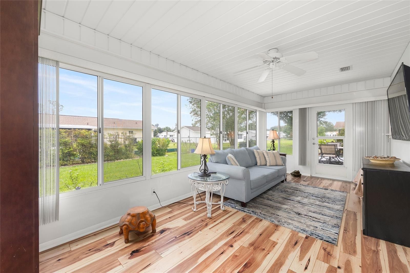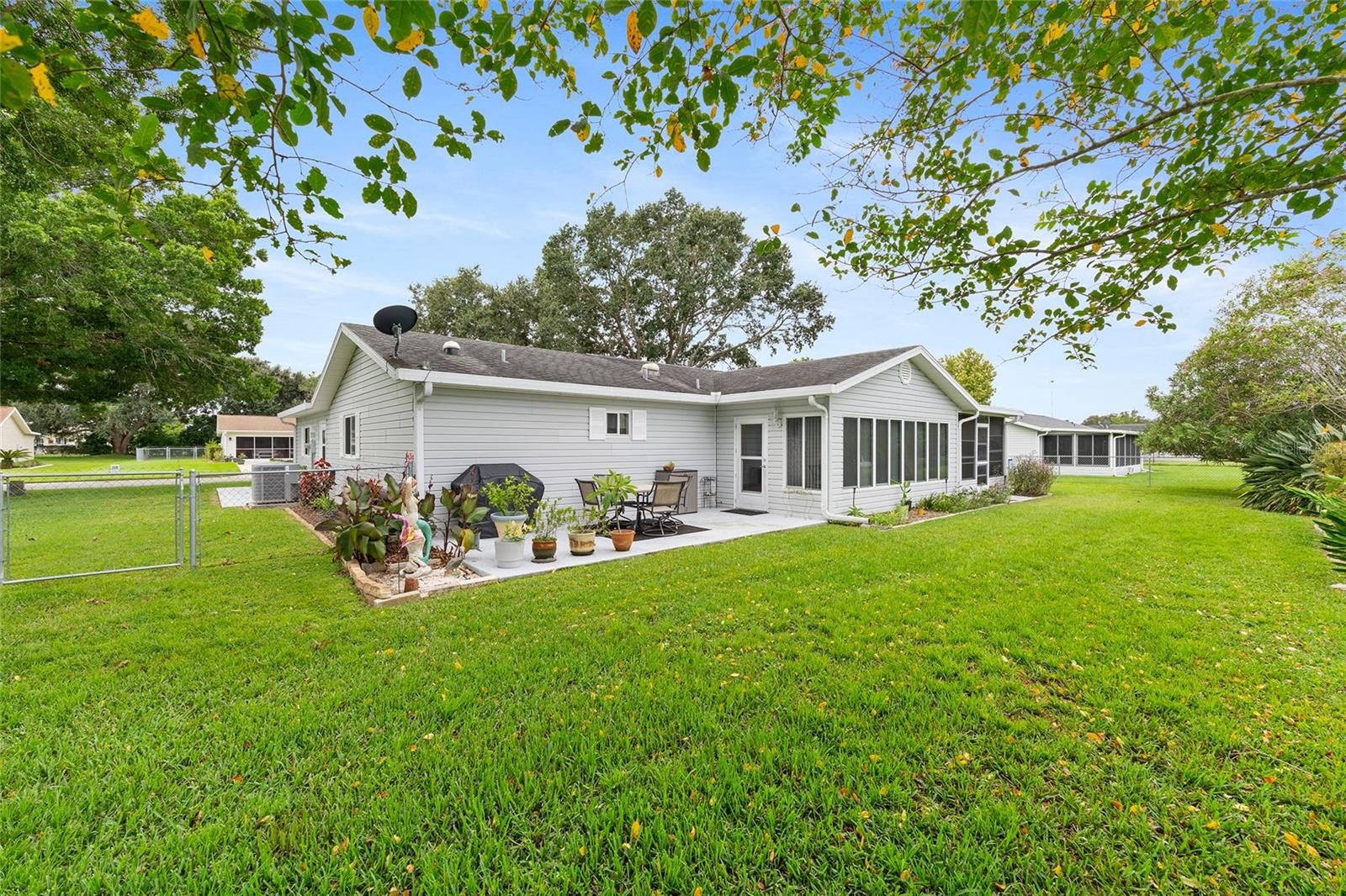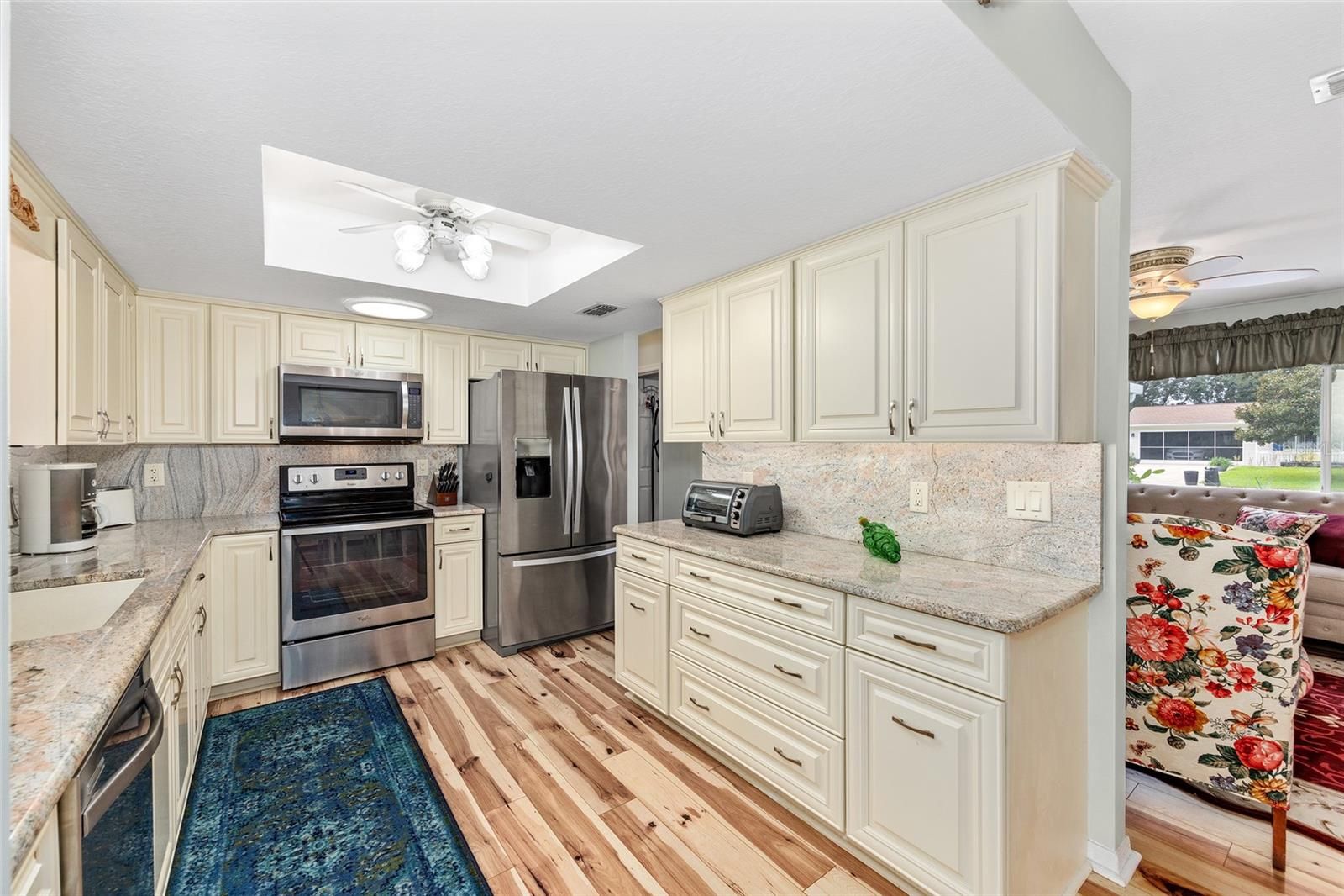 Welcome to this Beautifully Updated 3 Bedroom, 2 Bath Holly Model in the desirable 55+ Gated Golf Community of Spruce Creek South. This Well-Maintained home features 1,650 sq ft of living space under Heat & Air, 2-Car Garage, plus a Florida Room (21Ft x 10Ft), ENCLOSED Rear Screened Porch, Rear Painted Concrete Patio, EXPANDED Painted Concrete Driveway (24Ft Wide), FENCED BACKYARD and WHOLE HOUSE WATER FILTRATION SYSTEM! -- The REMODELED KITCHEN (2019) features GRANITE Countertops with Bullnose Edge, GRANITE Backsplash, Bisque SOFT CLOSE Cabinets with Crown Molding, Pull-outs, Pull-out Trash Receptacle, Under Cabinet Lighting, and Whirlpool STAINLESS STEEL Appliances. A spacious Living Room flows into the Dining Room—perfect for entertaining. The SPLIT Bedroom Floorplan provides privacy, with the Owner’s Suite offering a large Walk-in Closet with Solar Tube, En-suite Bath with Walk-in Shower & Bench Seat, 6 Ft GRANITE TOPPED VANITY with Dual Undermounted Sinks, Cabinet Linen Closet, and Comfort Height Commode! The Guest Wing features a Linen Closet, both Guest Bedrooms with Ceiling Fans/Lights & Built-in Closets. The Guest Bath has a GRANITE TOPPED VANITY with Undermount Sink, Tile Backsplash, Tub/Shower Combo with Tiled Walls & Ceiling, Window, and Comfort Height Commode. The INSIDE Laundry Room with a Pantry, has a SOLAR TUBE, Wall-mounted Cabinets, Maytag Bravos XL Steam Washer, Whirlpool Accu-Dry Sensor Dryer & HVAC Cabinet. The Enclosed Rear Screened Porch has Vinyl Windows, Ceiling Fan, and Exterior Door to Back Yard. The 2 Car Garage has a Painted Concrete Floor, HIDEAWAY Garage Screen Door, Insulated Garage Door, Keyless Entry, Pull-down Access to Attic, Utility Sink, Wire Shelving, Door to Side Yard, TWO WORK STATIONS WITH BASE & WALL MOUNTED CABINETS, and Smart Garage Door Opener with HomeLink. WATER HEATER: 2024, HVAC: 2013, ROOF: 2006, All Window Screens Replaced 07/2024. Gutters with Leaf Guard & Downspouts, Irrigation System, WHOLE HOUSE NOVA WATER FILTRATION SYSTEM with Warranty thru 4/9/2028. Don’t Miss Out on this GREAT Home, Schedule your Showing TODAY!!