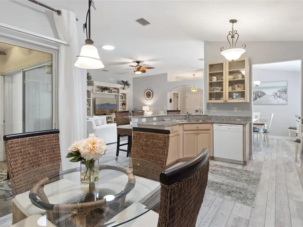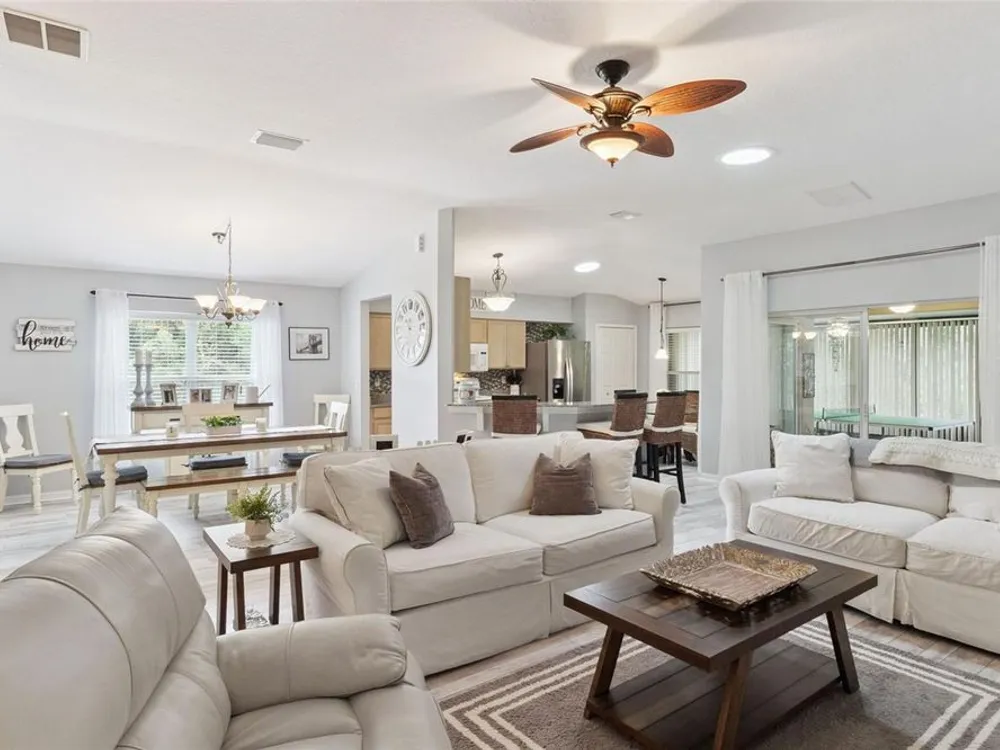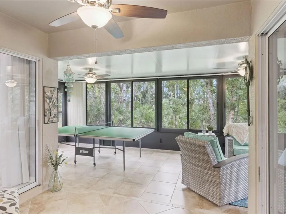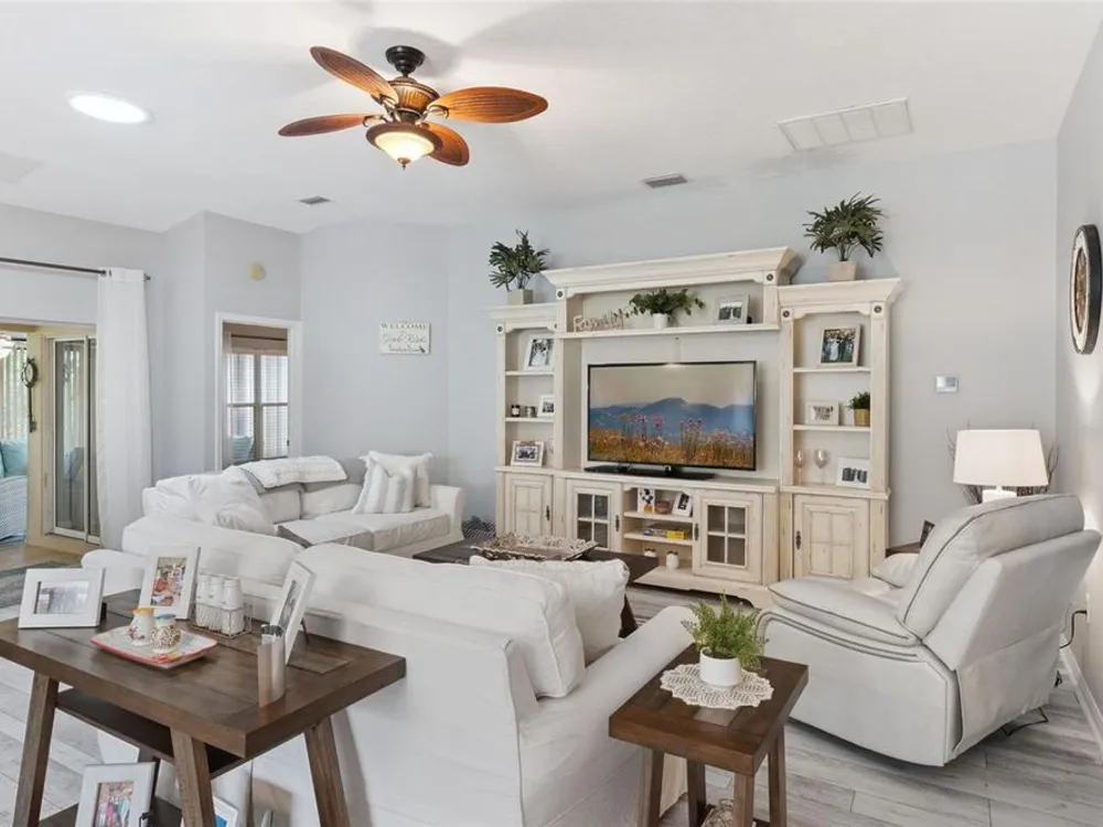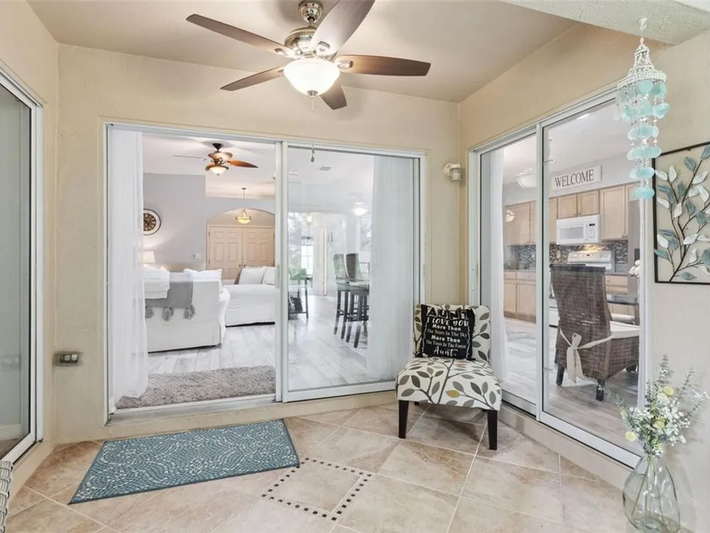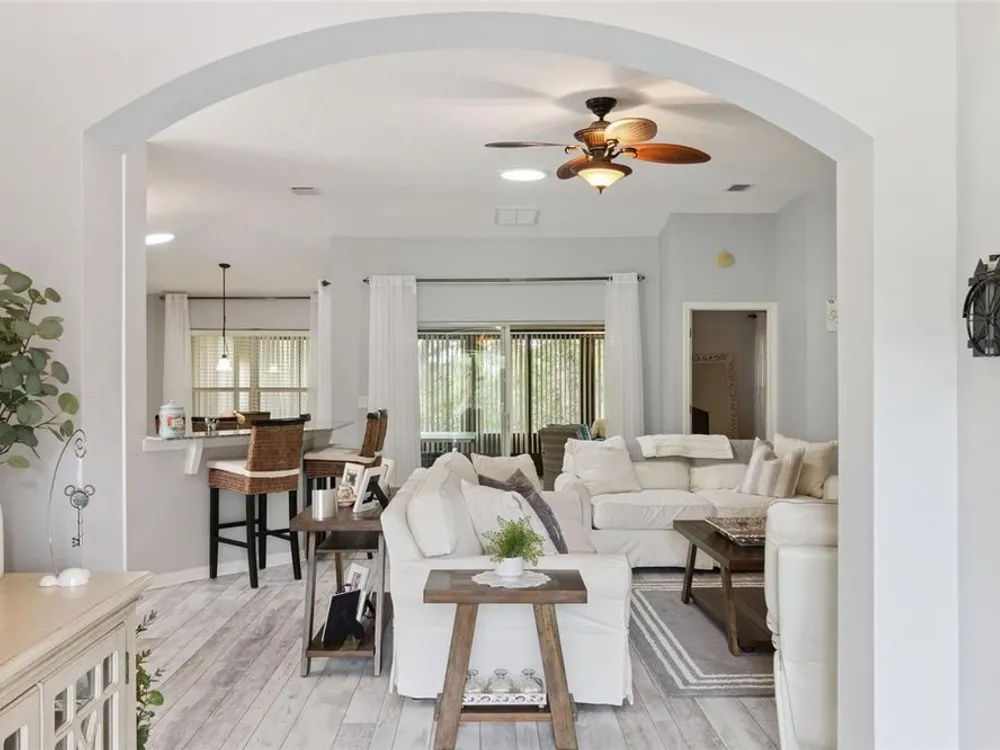 Welcome to the carefree Florida lifestyle in the exclusive 55+ enclave of Sandhill Dunes, a quiet neighborhood of just 80 maintenance-free villa homes within the sought-after Tampa Bay Golf and Country Club. Perfectly designed for active retirees, this beautifully upgraded 2-bedroom, 2-bathroom villa offers a serene setting overlooking the 17th green and a lush conservation area. From the moment you arrive, the swaying palms and professional landscaping with concrete curbing create a welcoming atmosphere. Step inside through a double glass storm door into a spacious foyer, leading into the arched entry and open-concept great room and dining area—ideal for relaxed entertaining. Enjoy year-round comfort in the enclosed, air-conditioned Florida room, which adds an additional 350 square feet of living space and features ceramic tile flooring and sliding windows that invite the outdoors in. The private backyard offers peaceful golf course views, while the master suite at the rear of the home provides a tranquil retreat with dual closets, dual sinks, a dedicated vanity area, and sliding doors that open to the lanai. A charming guest bedroom with a bay window and a full guest bath are thoughtfully positioned at the front of the home, offering comfort and privacy for visitors. This gated, manned community provides a strong sense of security and connection, with countless opportunities for social engagement, classes, and group activities. The pet-friendly environment—complete with dog parks—makes it a welcoming place for your furry companions as well. Homeowners enjoy a low-maintenance lifestyle with the HOA taking care of many communal responsibilities, allowing more time to enjoy the wide range of resort-style amenities. Whether it's a round of golf on one of the two courses, relaxing by one of the pools, enjoying a meal at the full-service restaurant and bar, or joining in on planned excursions and onsite entertainment, this is a community that truly offers it all. Experience the best of active, resort-style living in sunny Florida—your next chapter begins here.