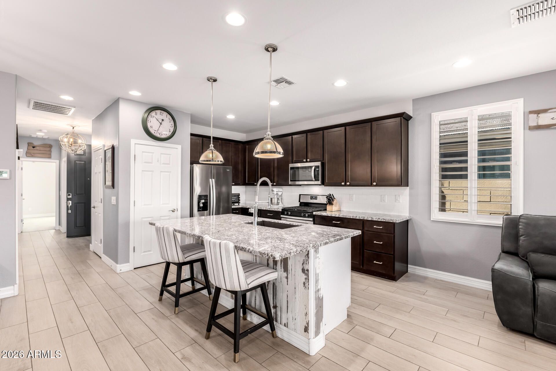 Welcome to active adult living at its finest in the vibrant community of Encore at Eastmark. This bright and spacious home offers over 1,330 square feet of thoughtfully designed living space, featuring 2 bedrooms, 2 bathrooms, plus a versatile den/office. Beautiful plank tile flooring enhances the main living areas, while elegant window shutters add style throughout. Step into a welcoming Great Room with soaring ceilings and neutral color tones that create an inviting atmosphere. The open-concept kitchen boasts rich cabinetry, granite countertops, sleek stainless steel appliances, a large pantry, and a quaint dining nook, perfect for everyday living or entertaining. The generous primary bedroom showcases a custom wall accent and charming window pop out, along with an en suite bathroom featuring a dual vanity and walk-in closet. Step outside to a serene covered patio with custom pavers and low maintenance landscaping, including artificial turf, all backing to natural open space for added privacy. Ideally located just around the corner from the Encore resort style community center, residents enjoy access to a full recreation center, pool, spa, tennis and pickleball courts, and more!