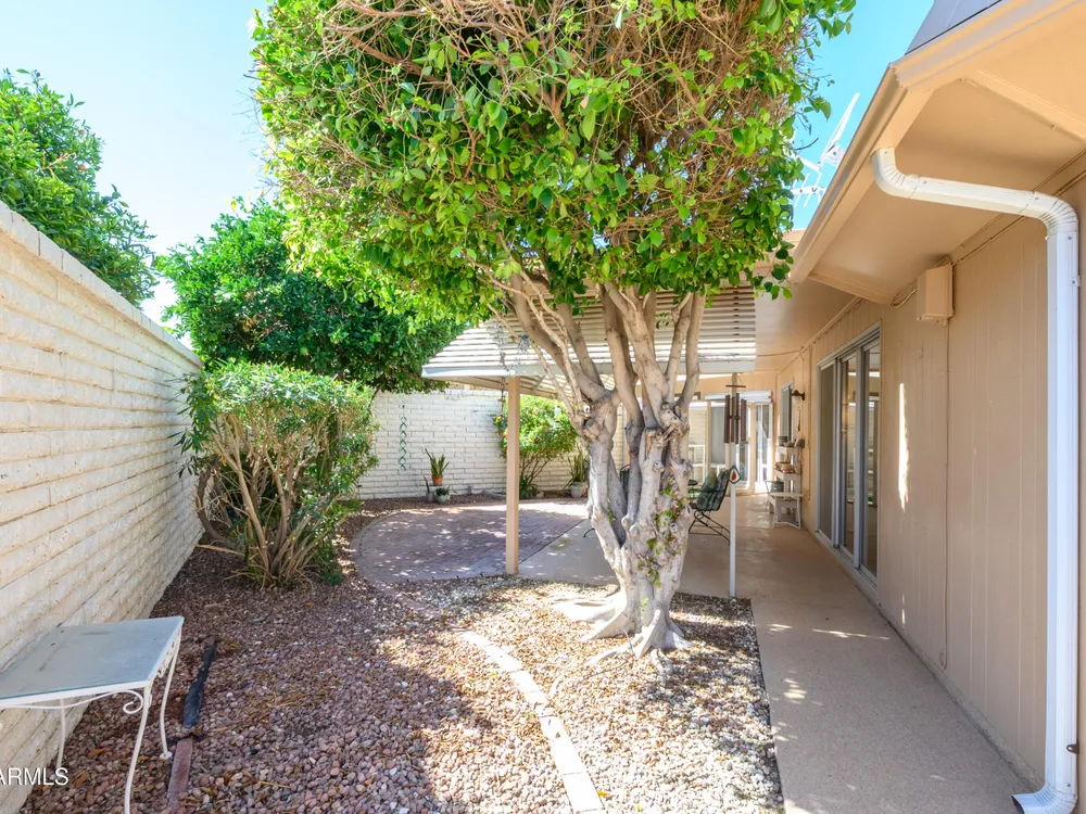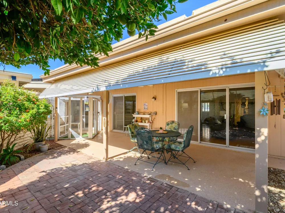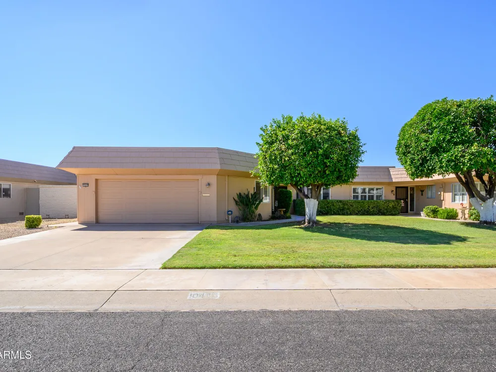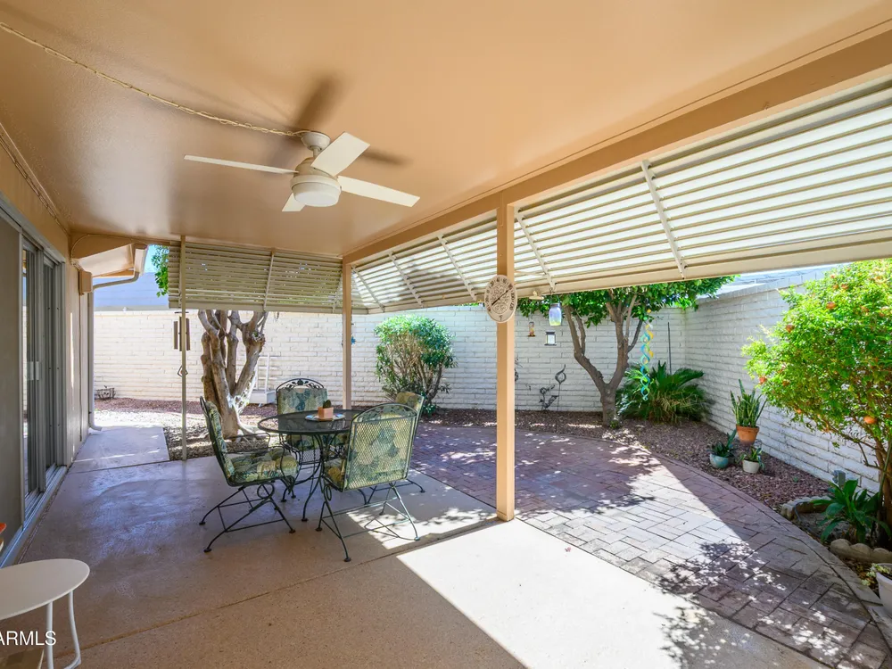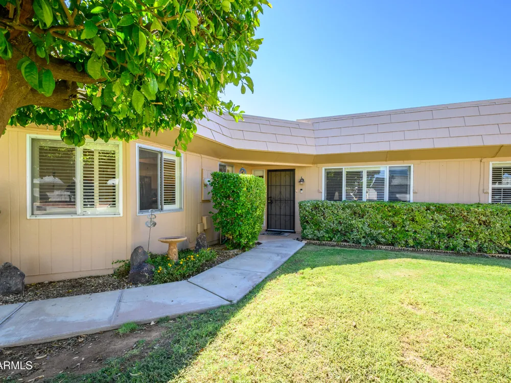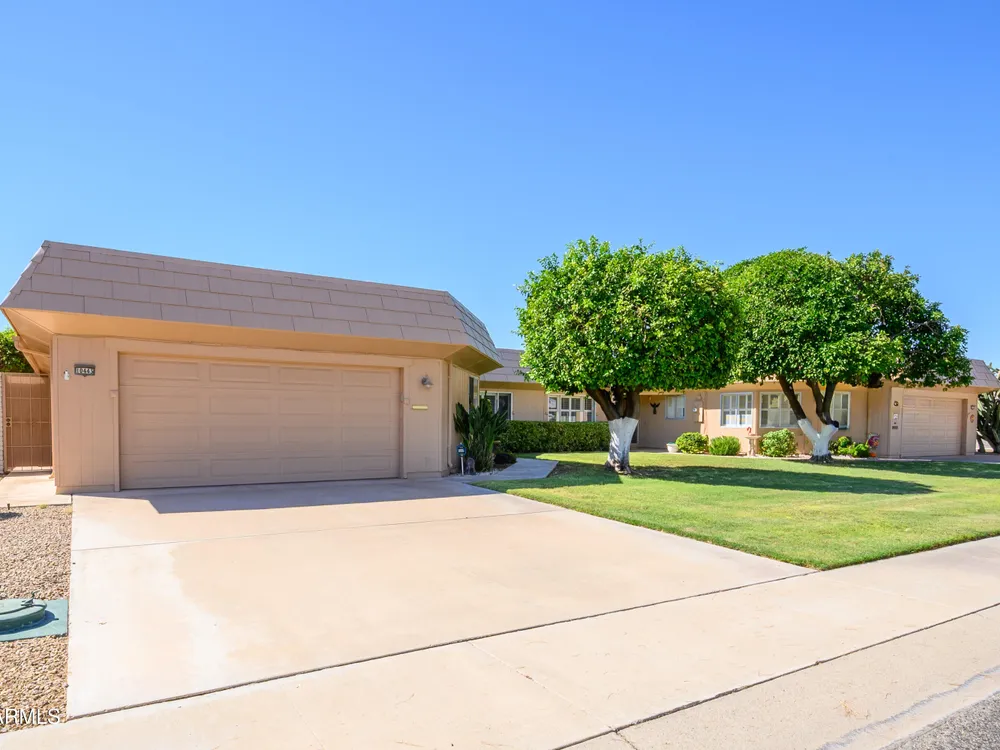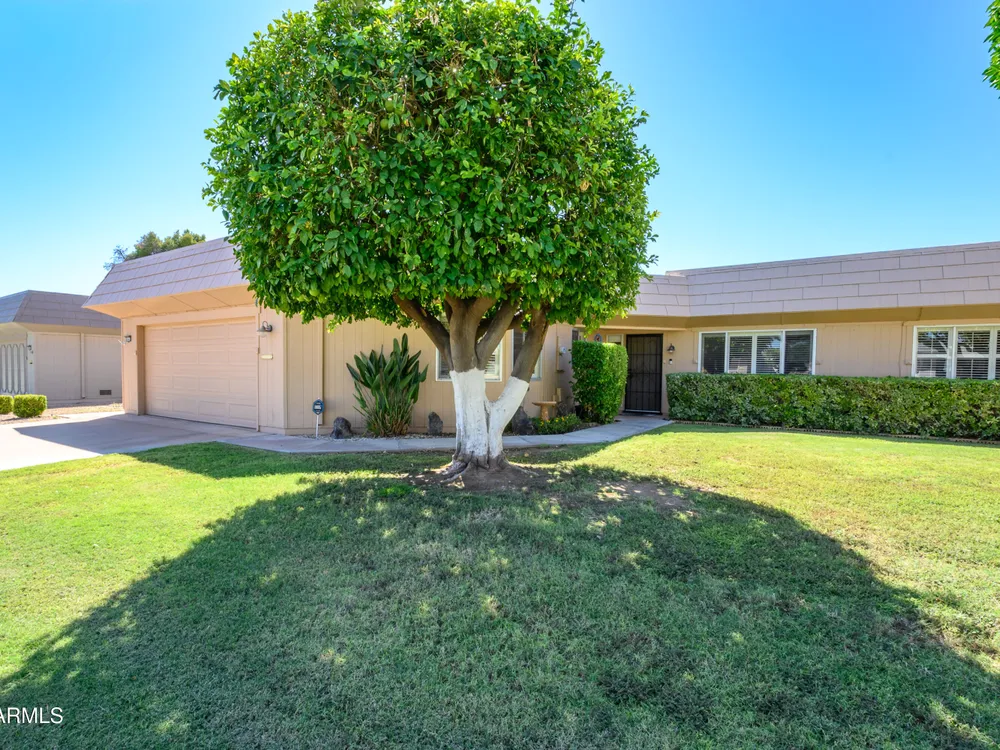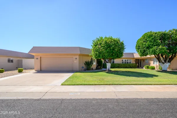 Fantastic 2 bed, 2 bath condo in beautiful Sun City! BRAND NEW HVAC, Aug 2025. Hot water heater replaced 2024. North/South facing lot w/mature citrus trees, ample shade, and an oversized 2 car garage w/built-in cabinets. Captivating interior boasts plantation shutters, wide hallways and a separate living room great for receiving guests. The family room enjoys a floor to ceiling mirrored wall & backyard access. The kitchen features white cabinets and newer (2024) stainless appliances. Spacious main bedroom has sliding doors to the back patio, a walk-in closet & a full bath. The private back patio is partially covered and is accessible from the second bedroom as well. The patio includes a ''catio'' area sure to keep your small pets safe from desert wildlife. Conveniently located near restaurants, groceries & shopping, and all the amenities offered as a resident of Sun City!