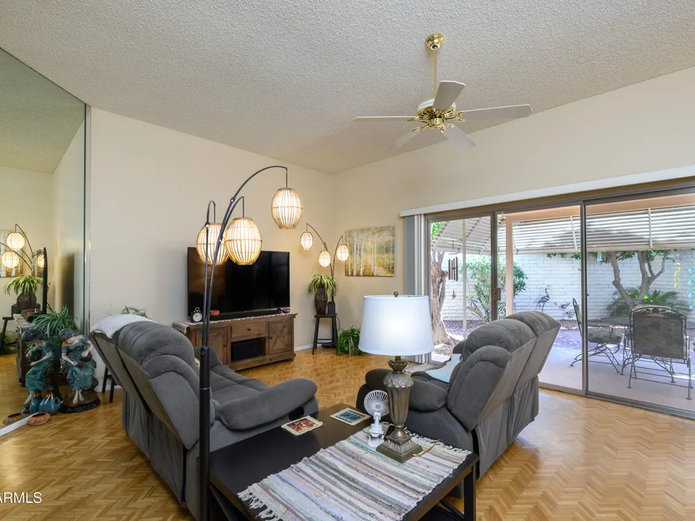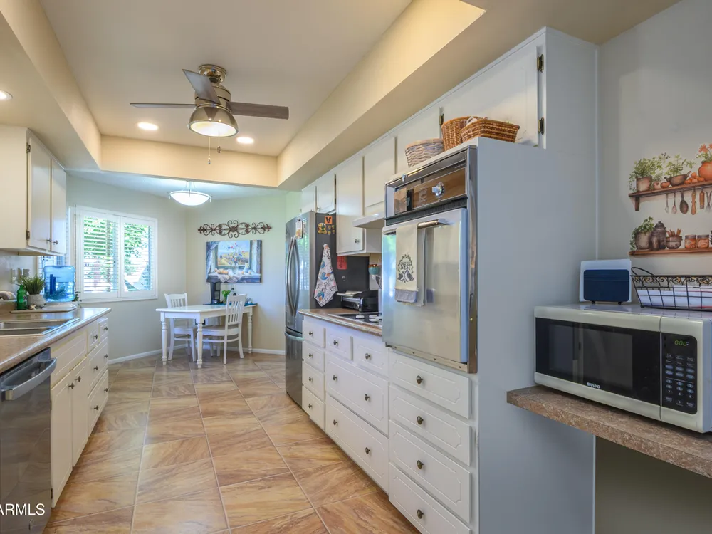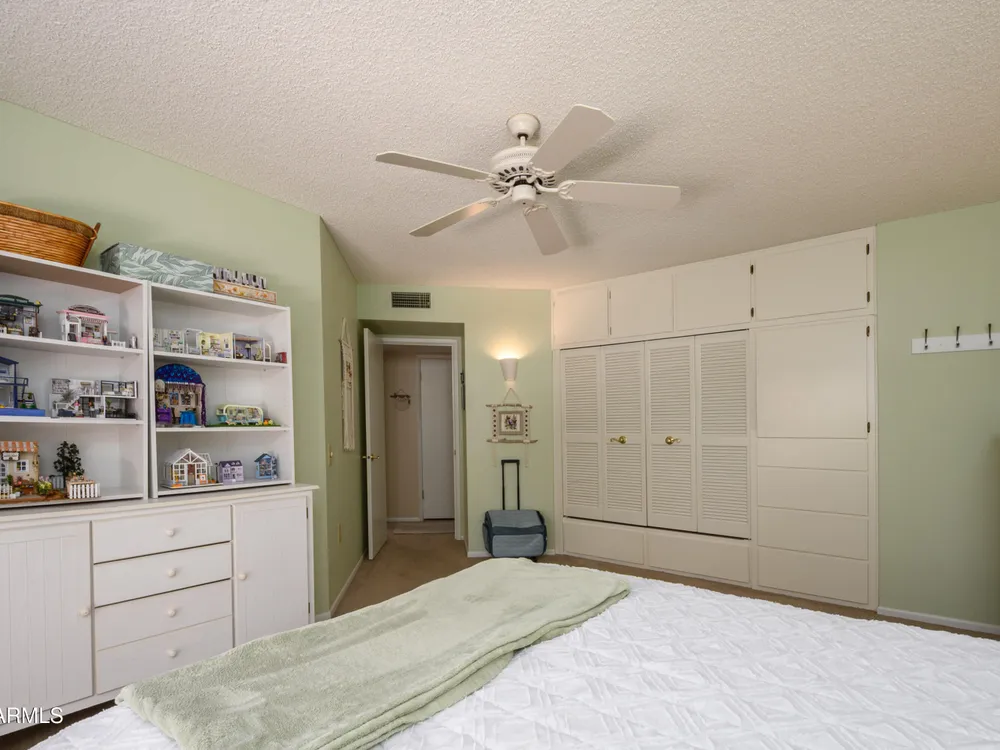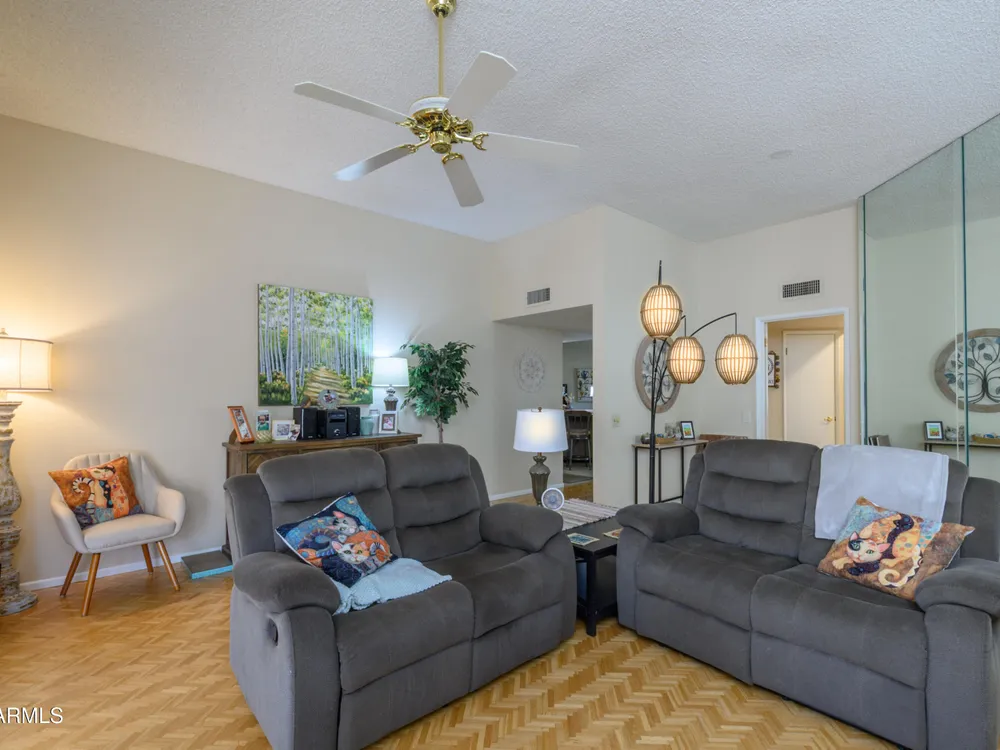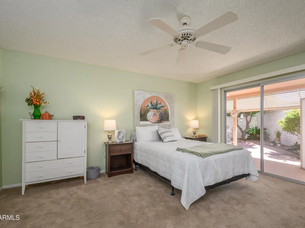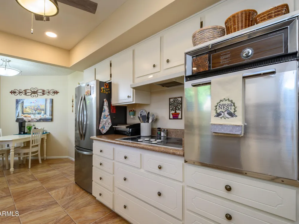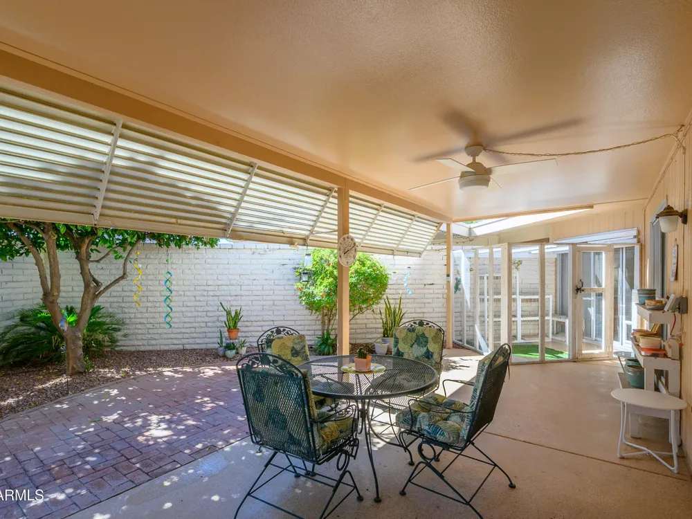 Fantastic 2 bed, 2 bath condo in beautiful Sun City! BRAND NEW HVAC, Aug 2025. Hot water heater replaced 2024. North/South facing lot w/mature citrus trees, ample shade, and an oversized 2 car garage w/built-in cabinets. Captivating interior boasts plantation shutters, wide hallways and a separate living room great for receiving guests. The family room enjoys a floor to ceiling mirrored wall & backyard access. The kitchen features white cabinets and newer (2024) stainless appliances. Spacious main bedroom has sliding doors to the back patio, a walk-in closet & a full bath. The private back patio is partially covered and is accessible from the second bedroom as well. The patio includes a ''catio'' area sure to keep your small pets safe from desert wildlife. Conveniently located near restaurants, groceries & shopping, and all the amenities offered as a resident of Sun City!