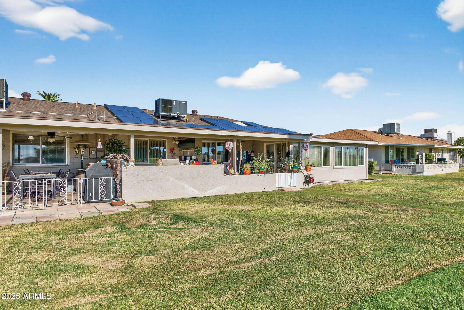 Don't miss this beautifully updated rare 3-bedroom, 2-bath Gemini home perfectly situated on the Lakes West Golf Course, offering breathtaking views of the pond and fountain. Major updates include a new roof (Feb 2021), A/C unit (Sept 2023), and partially owned solar with upgraded leased panels to keep energy costs low year-round. The original atrium has been enclosed, adding valuable additional living space, while the Arizona Room with mini-split A/C provides comfort. Enjoy Arizona living at its best with a partially enclosed back patio, complete with a built-in BBQ and firepit—perfect for entertaining or relaxing outdoors. It is conveniently located near the Sundial Recreation Center and all the wonderful Sun City amenities. This is a must-see home that truly stands out!
