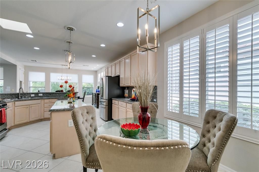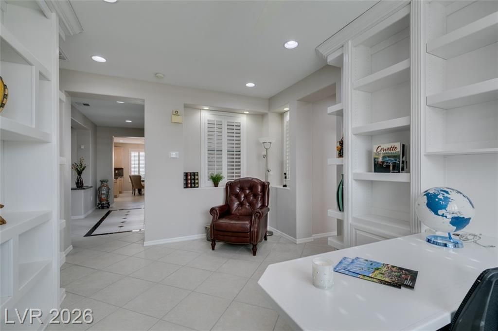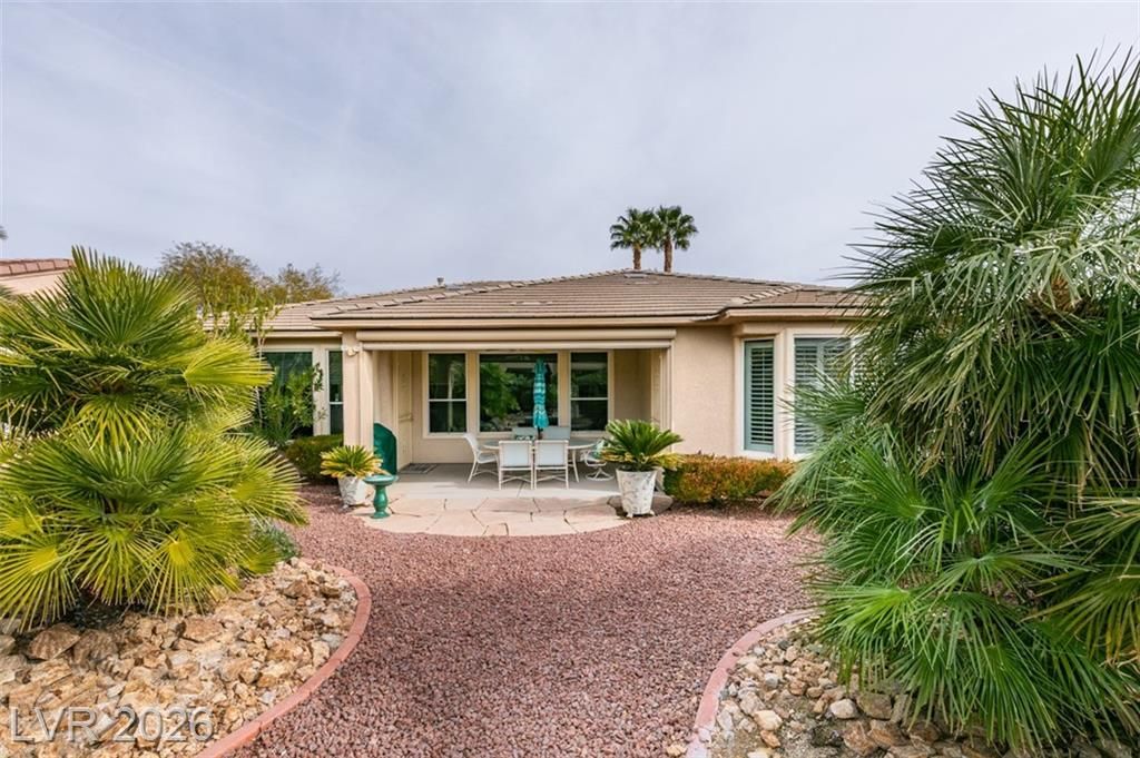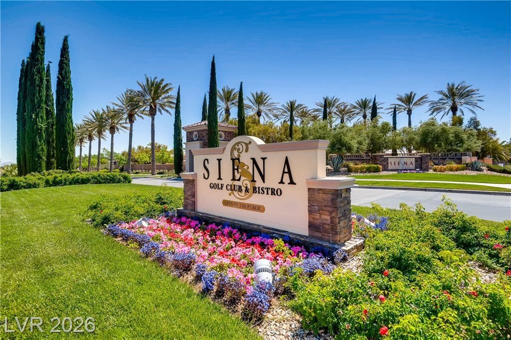 Large Cul D Sac Lot 11,326. Long Driveway. Security Gate Entry with Double Leaded Glass Doors. 2 Bdrms + 11x10 Sep Office, all in white, Built in Desk, Cabinets & Shelving. Freshly Painted interior, New: Light Fixtures& Faucets. All Tile Flooring, no Carpet. Kitchen Features Granite counters, Stainless Applncs, Center Island, Double Sinks, Skylite, Pantry, Breakfast Area, Desk area. Shutters & Ceiling Fans throughout. Lovely Formal Dining. Coffered Ceiling in Liv Rm, Surround Sound, Entertainment Cabinet. Primary Bedrm MTN View, Bay window, door to ext Patio, LG Walk in Closet, Linen Closet. Bathrm Has Sep Bathtub, 2 Sinks, Skylite Sep Laundry Rm, Washer, Dryer, Cabinets. Water Softener, Alarm. Large Covered Rear Patio, Lush Landscaping. See SIENA'S Community. Golf, Bistro, Pools, Spa's, Pickle Ball, Tennis Fitness Center. Event Calendar & MORE !! We are Featured in Best Senior Community in LAS Vegas