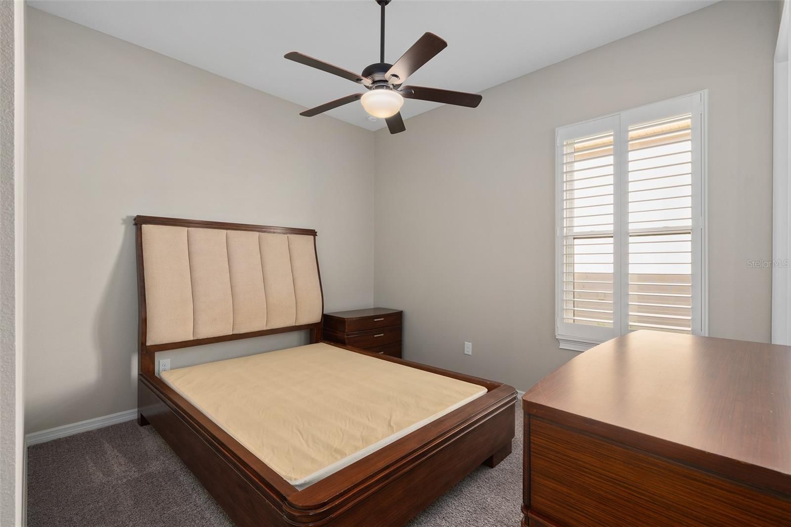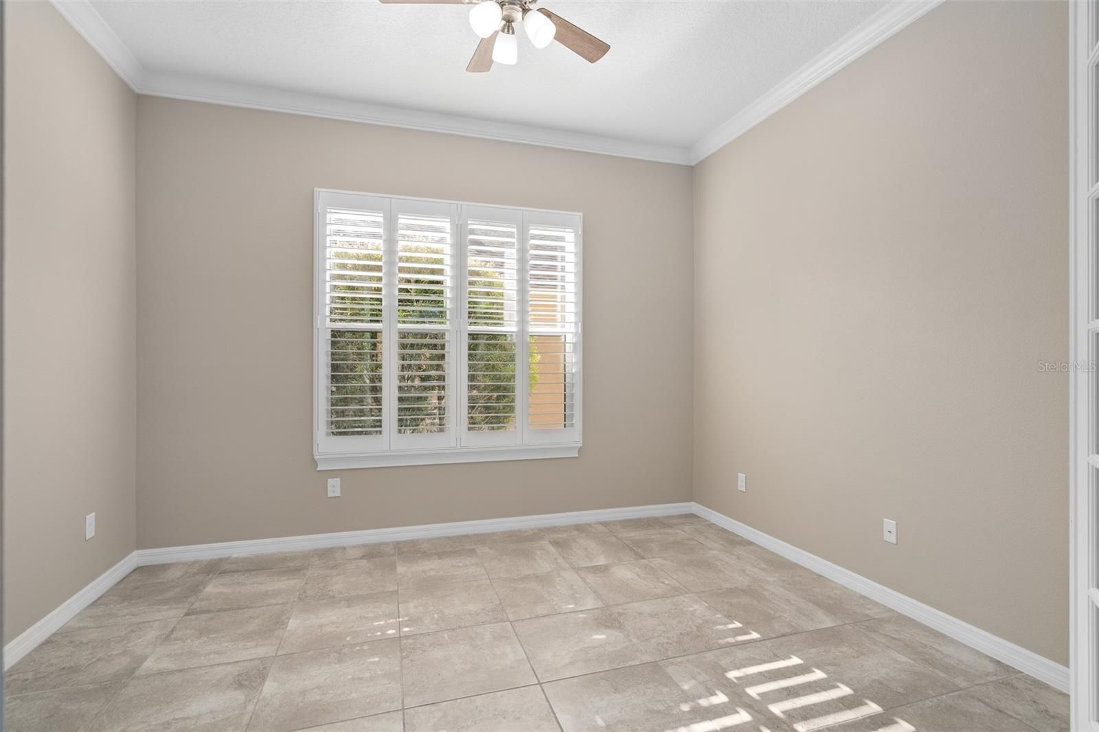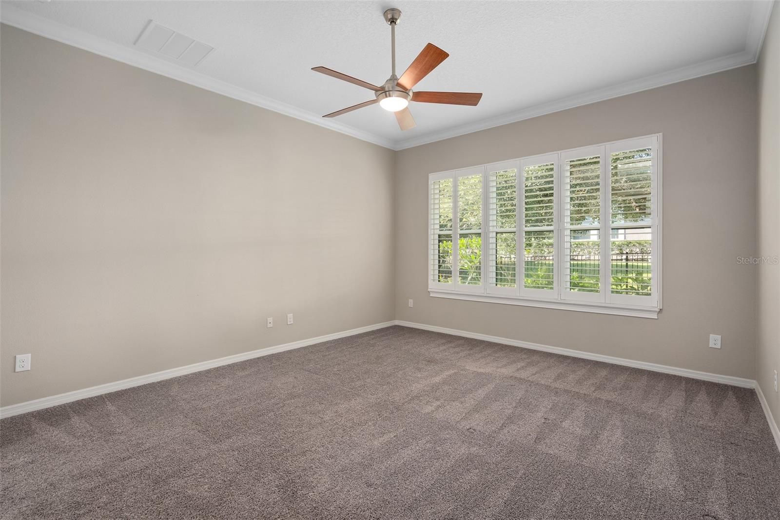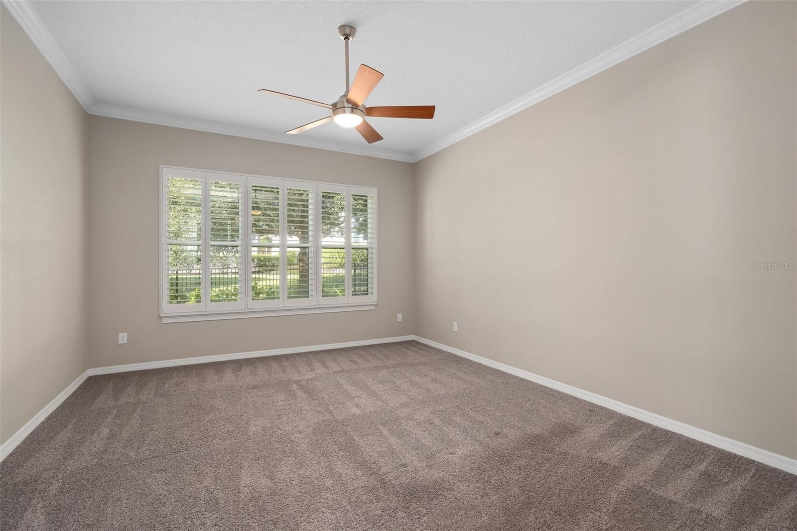 - Ceiling Fan(s), Crown Molding, Eat-in Kitchen, High Ceilings, Open Floorplan, Main Level Primary, Solid-Wood Cabinets, Split Bedrooms, Stone Counters, Thermostat, Walk-In Closet(s), Window Treatments