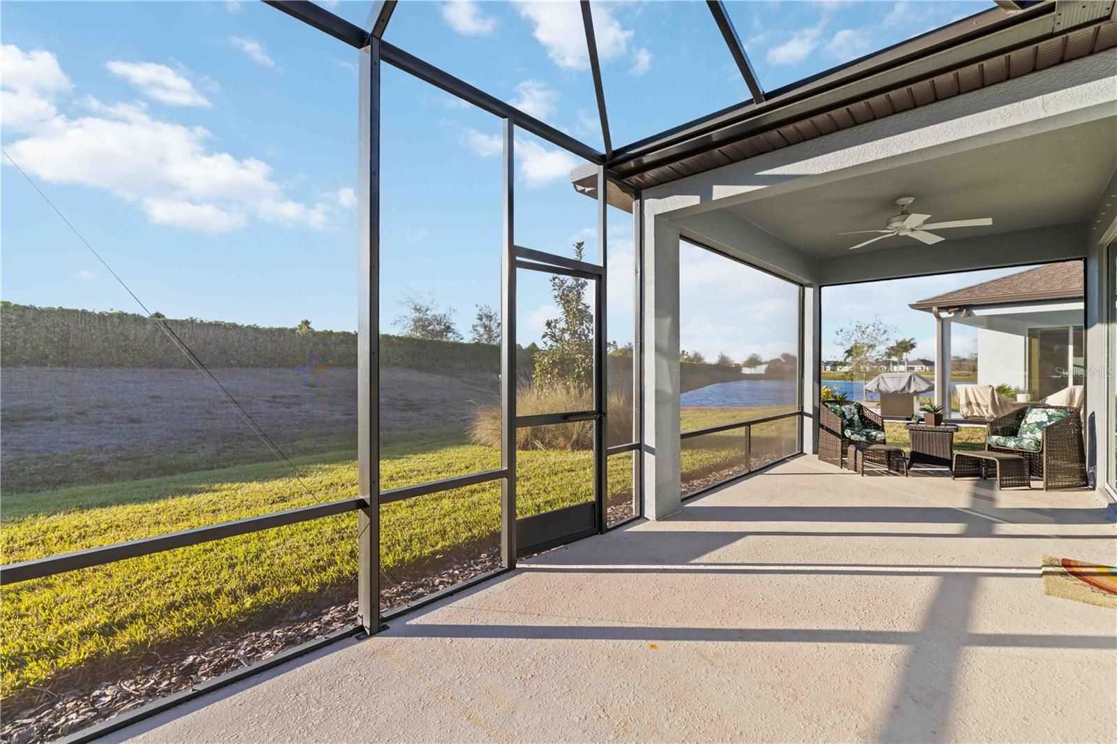 Welcome to Bayview, an exceptional 55+ gated & golf cart community where you can live everyday like you're on vacation Discover new friends, become involved in many social activities, enjoy state of the art amenities including a nearly 25,000 sqft amenity center, resort style pool with cabanas and resistance pool, our own restaurant the "Sailfish Grill" with full bar inside & out, flat screen tv's, billiard tables, bandshell area for live entertainment, dock on water with kayak launch, corn toss, bocce ball/pickleball/tennis/shuffleboard courts, hot tub, fire pit sitting area, walking trails, dog park, fitness center, garden center, garden club and much more. Step into this beautiful, light-filled home featuring 2 bedrooms, 2 bathrooms, and a versatile flex/office room with elegant double French doors. The open-concept floor plan is enhanced by an abundance of windows, creating a bright and inviting atmosphere throughout. The modern kitchen showcases stylish gray cabinetry, quartz countertops, brushed nickel hardware, natural gas, a closet pantry, Whirlpool stainless steel appliances, a mosaic tile backsplash, and pendant lighting over a large center island—perfect for cooking and entertaining. Additional features include 8-foot interior doors throughout and ceiling fans for added comfort. The spacious primary suite offers a spa-like bathroom with dual sinks, a large walk-in shower with seating, and convenient linen closet storage. The primary closet is thoughtfully designed with a built-in organizer for optimal functionality. Relax in the expansive gathering and living area that opens to an oversized screened lanai, where you’ll enjoy serene water views to the right. Unwind in the backyard and take in breathtaking sunset views—your perfect Florida retreat. HOA includes, shrubs, lawn, trimming, reclaimed water for irrigation, internet & cable, private roads, guard at gate, virtual gate after hours. The Sailfish Grill is 410.00 per year which you get to spend each year that amount free. With easy access to I-75, you're just a short drive from the Gulf of Mexico beaches, shopping, dining, and Tampa, St. Petersburg, Bradenton, and Sarasota. Experience the perfect blend of luxury and location in this pet-friendly oasis. Come see this beautiful home today.