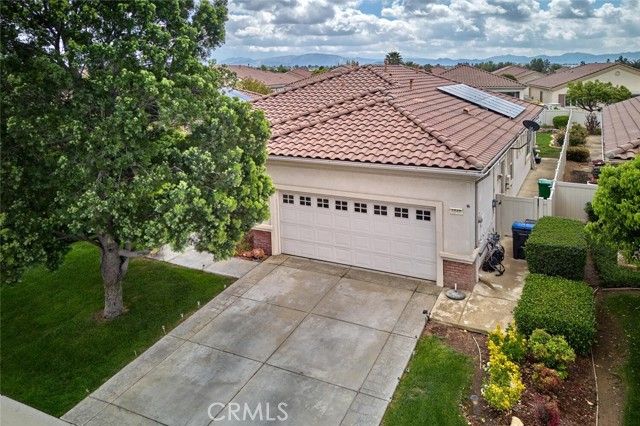 This charming single-story residence presents an exceptional opportunity for an enriched lifestyle within the highly desirable 55+ community of Solera in Beaumont. Perfectly situated on one of Solera's most picturesque streets. The interior features a well-appointed layout, including two comfortable bedrooms, two full bathrooms, and a versatile office/den. Tile and durable laminate flooring extend throughout the main living areas, while the bedrooms provide a cozy retreat with carpeting. At the heart of the home, the kitchen boasts beautifully stained cabinetry, providing ample storage. Step outside to discover a backyard that offers generous space for relaxation, gardening, and entertainment. Internet and basic cable TV are included and paid through the HOA. Home has solar (lease: $166.00 month). Newer air conditioner! Discover the vibrant, resort-style living at Solera. The centerpiece of the community is the clubhouse with a state-of-the -art fitness center, indoor walking tract, tennis and bocce ball courts, a pool and spa, billiards room, library, and versatile meeting/banquet spaces. Residents love the endless social scene: clubs, classes, events, and group activities. Positioned near the I-10, minutes from Cabazon Outlets, Morongo Casino, championship golf and the vibrant