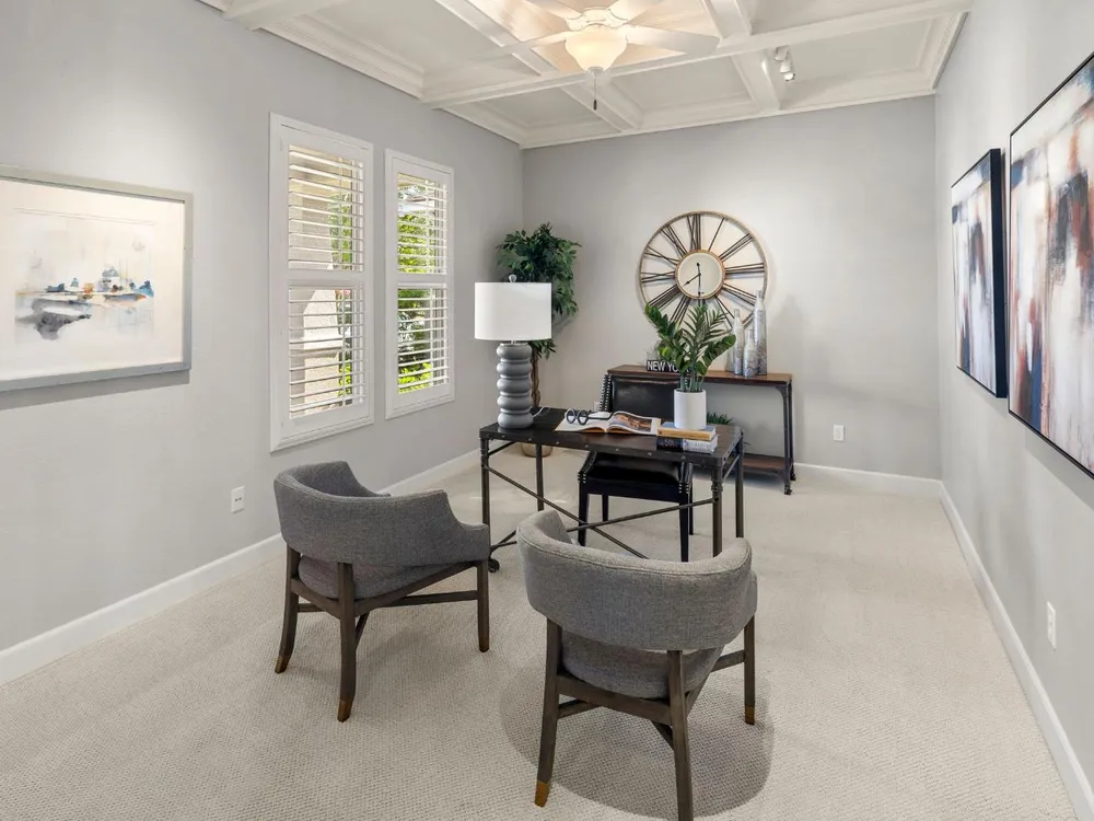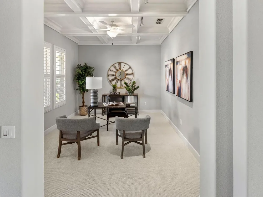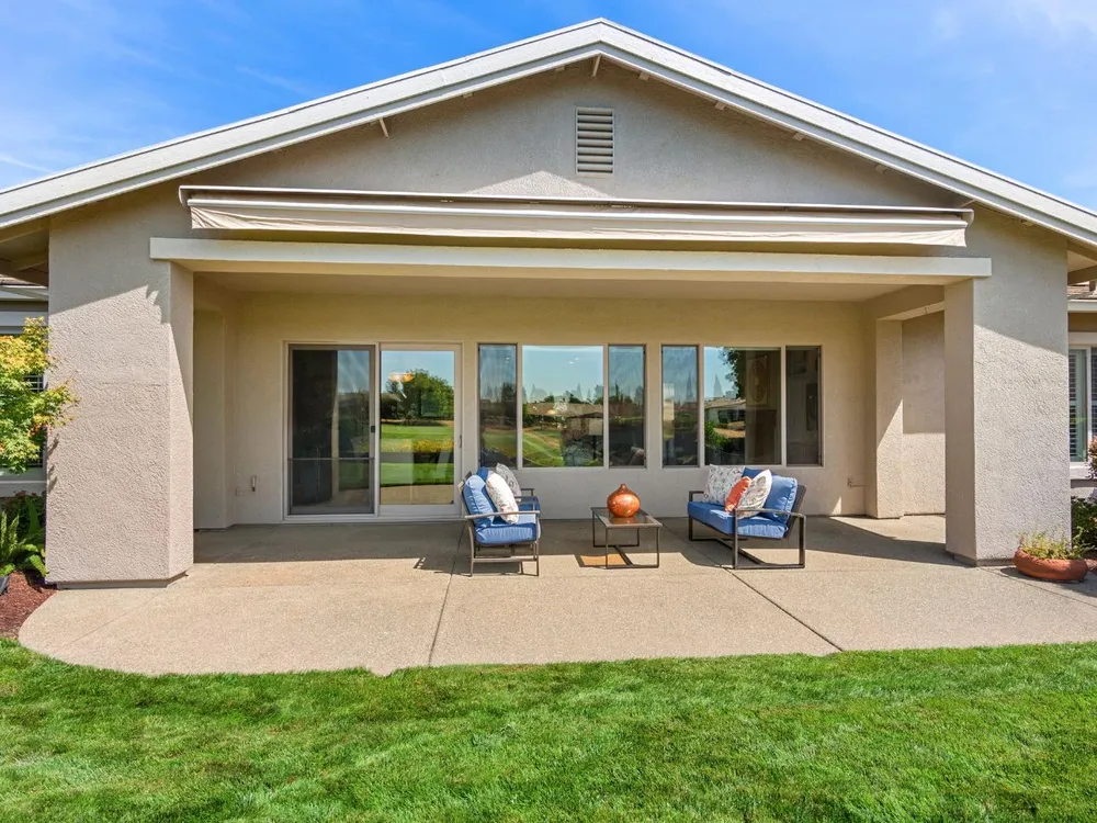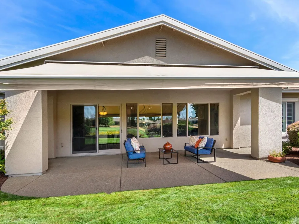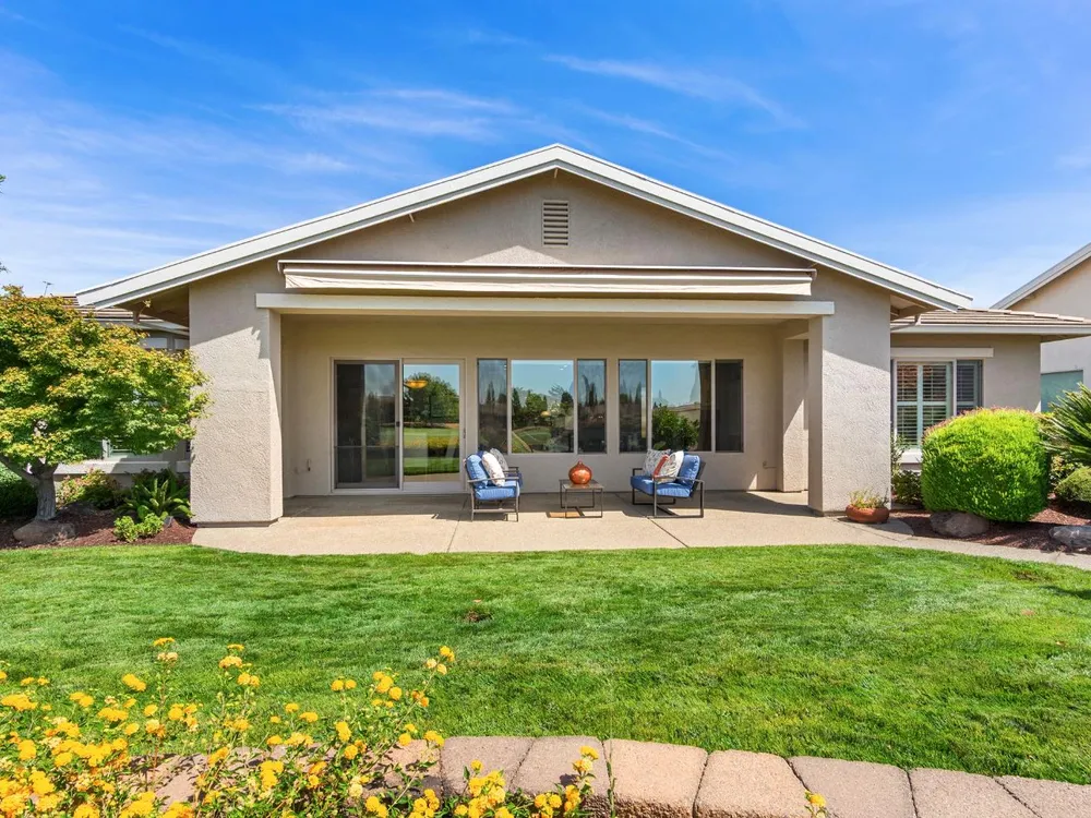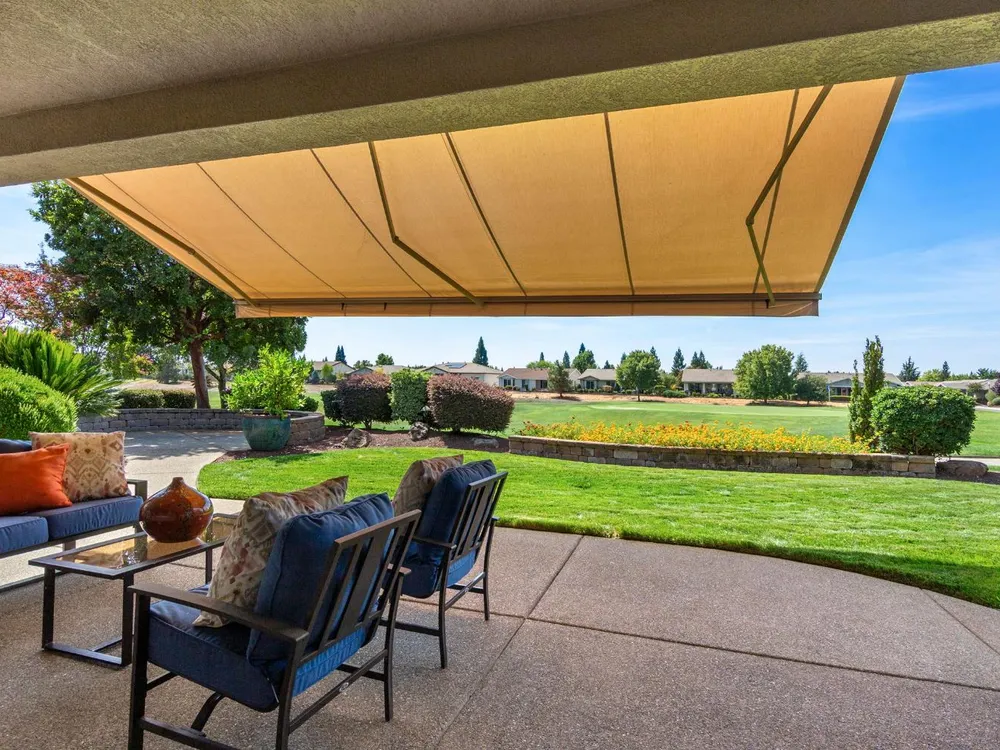 Welcome to the home you've been waiting for! This popular Napa model is perfectly situated on the 8th green of the Orchard Golf Course, offering a front-row seat to the slow, relaxing pace of golf from your back patio. Upon arrival, you'll be greeted by a shaded front courtyard. Inside, the oversized den/office features elegant coffered ceilings with lighting. The great room boasts engineered wood flooring and built-in white cabinets, providing ample space for a large TV. The master suite is located on the opposite side of the home from the guest bedroom for maximum privacy. It includes a spacious adjoining bathroom with dual sinks, a soaking tub, and a huge walk-in closet. The guest suite has its own full bathroom. The backyard is an entertainer's dream, complete with a covered patio, an extended remote awning for extra shade, and a dedicated space for an outdoor dining table and umbrella. The full-sized, three-car garage is fully finished and painted, with a utility sink and plenty of storage cabinets.