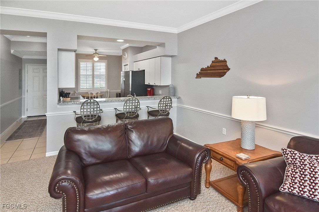 This nice 2 bedroom/ 2 bathroom first floor condo is priced to sell! You will enjoy the lake and golf course view from the lanai and primary bedroom. Kitchen has granite countertops with newer stainless-steel appliances. Crown molding in main living area and plantation shutters are a few highlights. Being offered furnished, it is move in ready! This unit comes with a personal storage unit and carport. AC was replaced in 2020. Building has new roof and recently painted. Only a short stroll to the Grill Room, fitness center, and pool. Heritage Palms Golf and Country Club has something for everyone. Two 18-hole golf courses, 8 tennis courts, fitness center, 9 pools, lots of social activities such as Bingo, live music, book clubs and more. Additional pickleball courts are being added and the new Tiki/Oasis poolside bar is scheduled to open soon! And if that is not enough, HP is conveniently located near entertainment like Top Golf, Pop Stroke, Twins & Red Sox training fields, great dining with the new Capital Grill, Coopers Hawk and short drive to FGCU and airport! Check out the virtual tour and schedule your showing today!