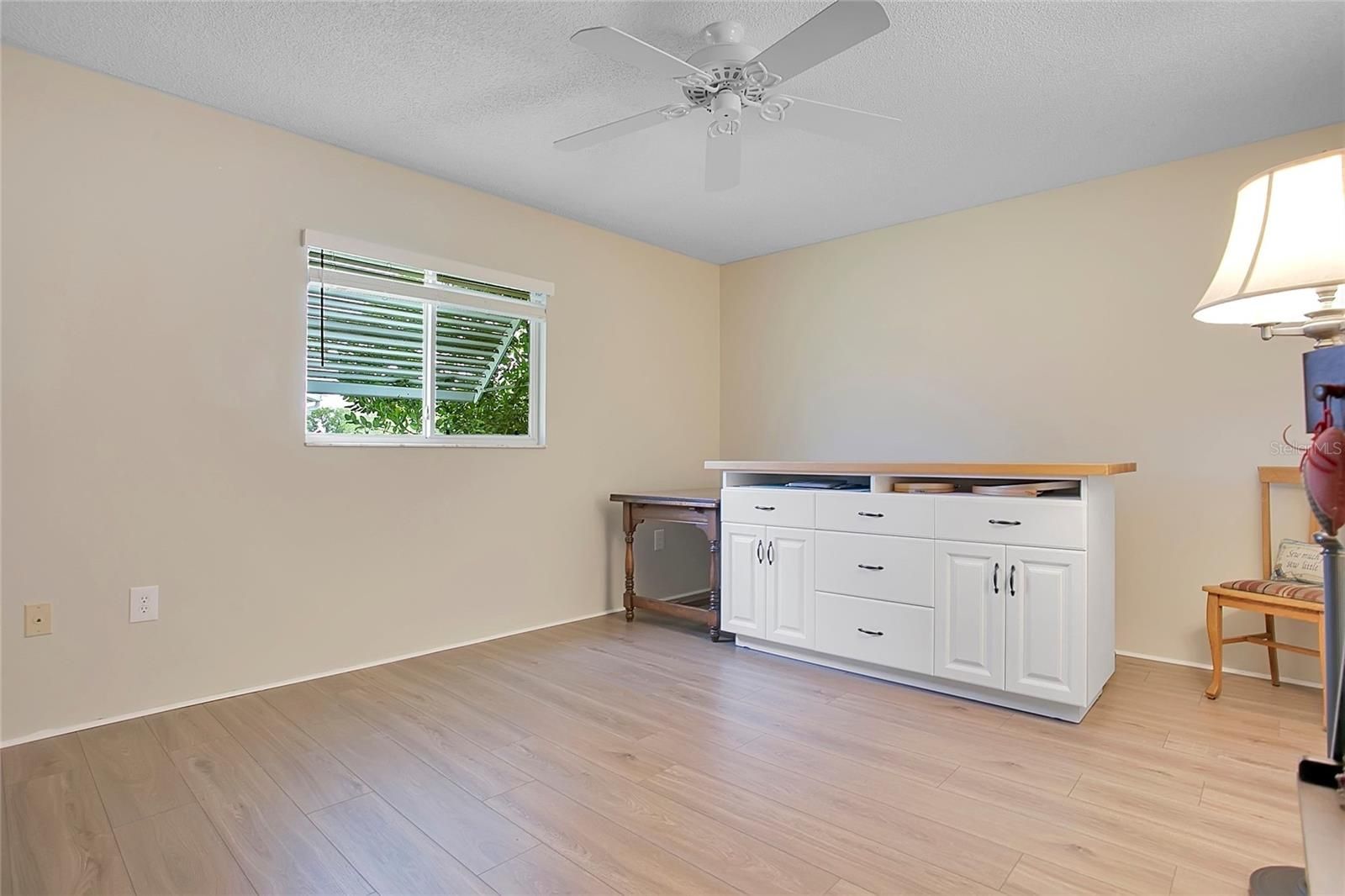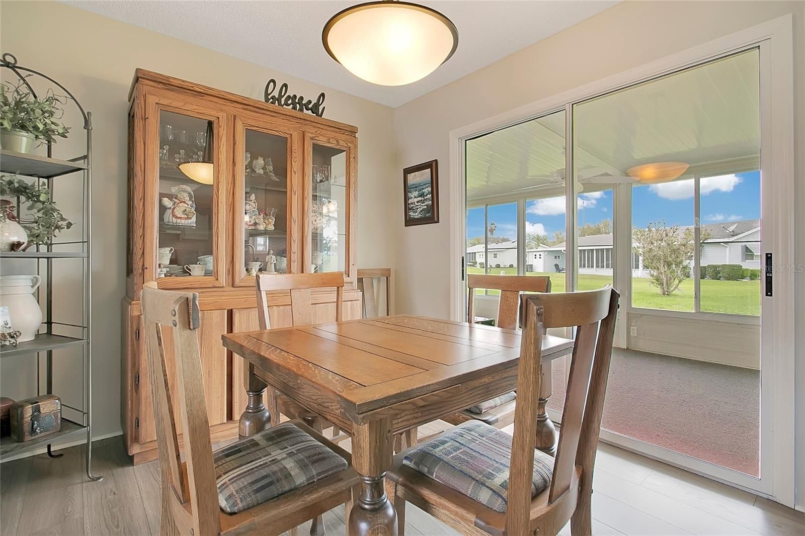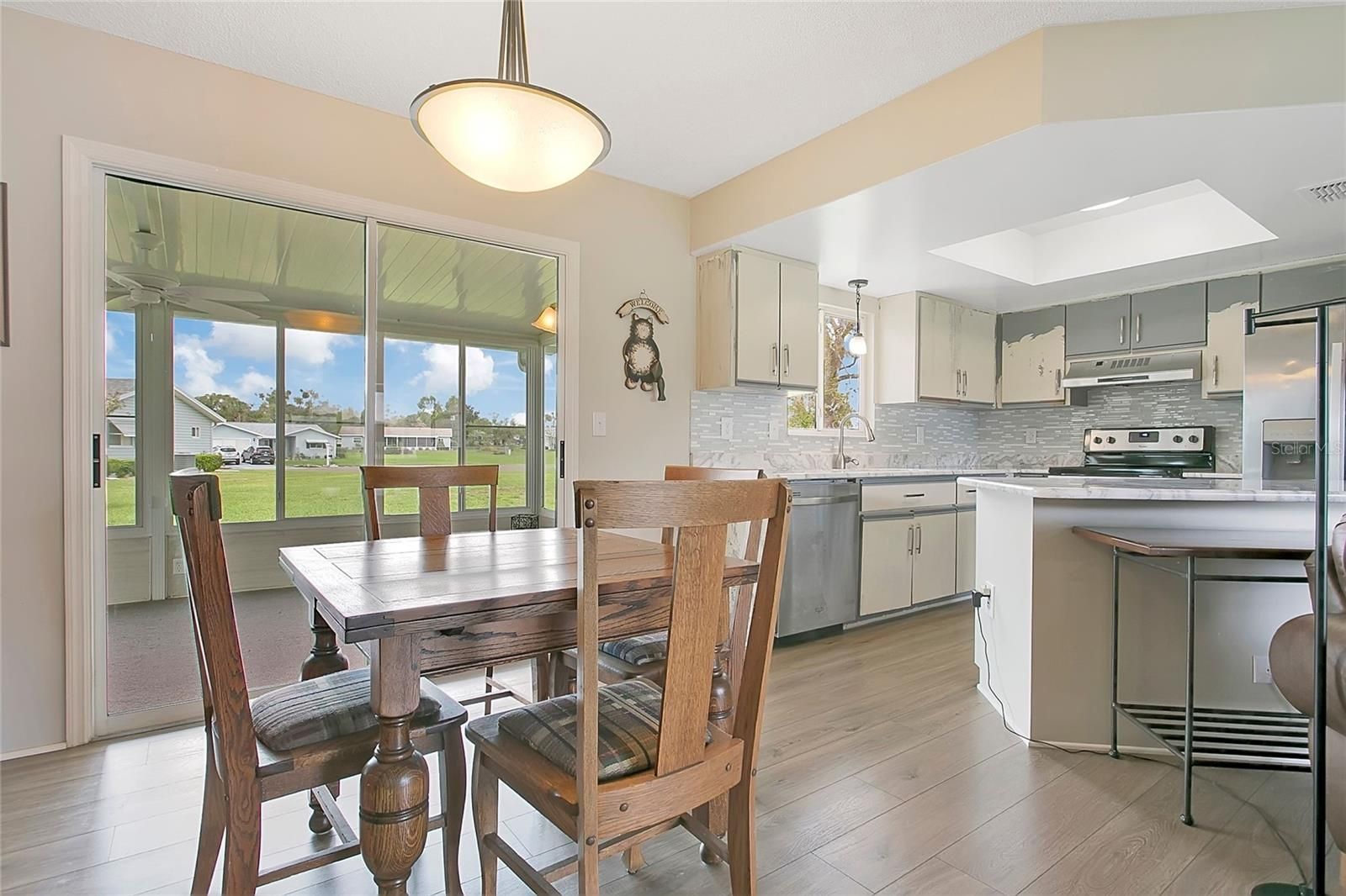 This 2-bedroom, 2-bath, 2-car garage Chestnut model is move-in ready and waiting for its new owners. Located in the highly desirable Spruce Creek South, a 55+ gated golf course community just 2 miles north of The Villages, residents enjoy golf cart access to shopping, medical offices, pharmacies, and restaurants. Situated on nearly half an acre, this property offers plenty of space to add a pool and features no direct rear neighbors, providing extra privacy. The popular Chestnut model offers a split-bedroom floor plan with luxurious waterproof wood based vinyl throughout for easy maintenance. Both bedrooms being generously sized and featuring spacious walk-in closets. The home shows true ownership pride with additional features and updates include: Shingle roof 3/15/2023, new Water Heater 2025, Germicidal UV Lights 2025, Fan/Light installed 2024. As you enter the home, you’re welcomed by a bright and inviting open floor plan. The updated kitchen features granite countertops, tile backsplash, a large stainless-steel sink, and newer stainless-steel appliances. Just off the dining area, the enclosed lanai offers sliding glass windows and leads to an enclosed patio area, perfect for grilling and relaxing outdoors.
