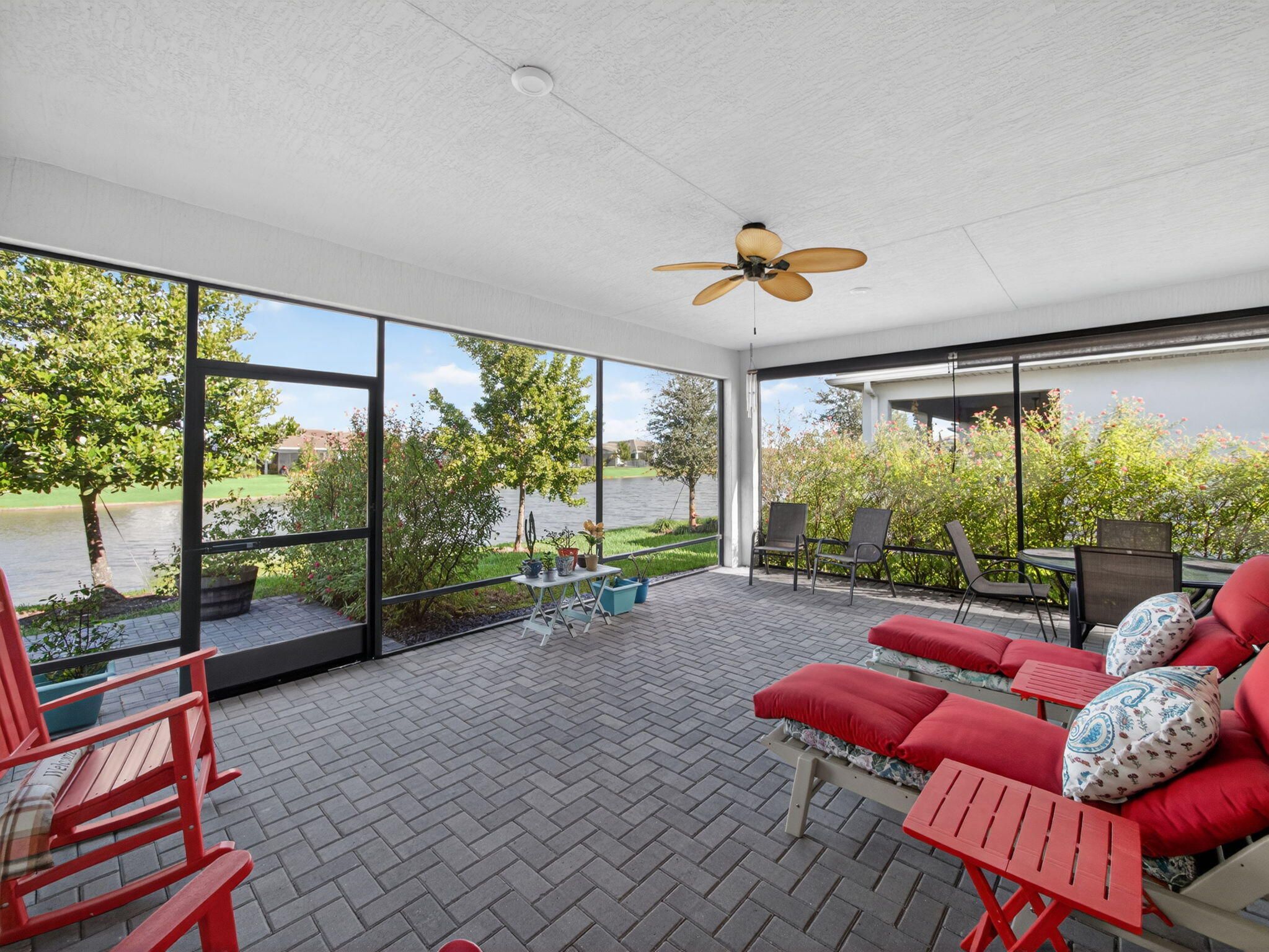 Situated on a premium lakefront lot with lush greenspace on one side, this impeccably upgraded residence located in Telaro at Tradition offers refined indoor-outdoor living and elevated design throughout. Thoughtfully curated enhancements blend luxury, comfort, and functionality in every space. The home features ceramic tile plank flooring throughout, creating a seamless, modern aesthetic. A gourmet kitchen anchors the living space, accented by designer pendant lighting and ideal for both entertaining and everyday living. The flex room has been transformed with a custom Closets by Design built-in office, providing a sophisticated and highly functional workspace.