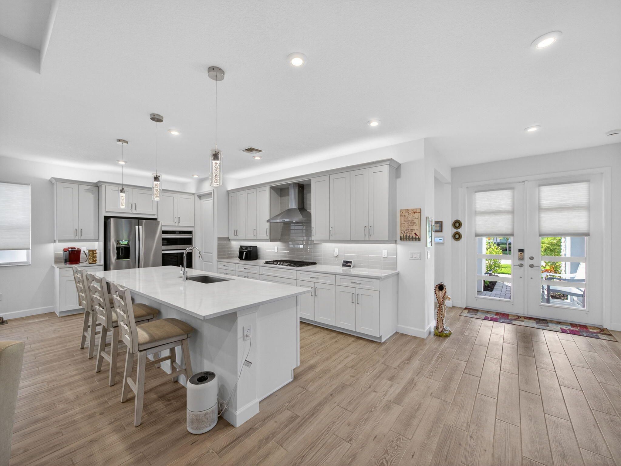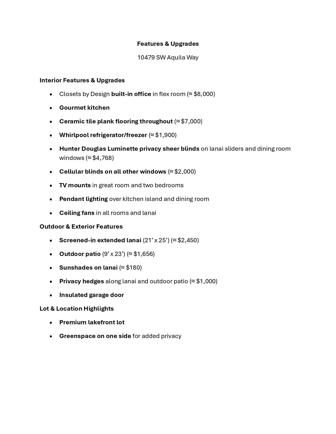Situated on a premium lakefront lot with lush greenspace on one side, this impeccably upgraded residence located in Telaro at Tradition offers refined indoor-outdoor living and elevated design throughout. Thoughtfully curated enhancements blend luxury, comfort, and functionality in every space. The home features ceramic tile plank flooring throughout, creating a seamless, modern aesthetic. A gourmet kitchen anchors the living space, accented by designer pendant lighting and ideal for both entertaining and everyday living. The flex room has been transformed with a custom Closets by Design built-in office, providing a sophisticated and highly functional workspace. Expansive sliders open to a screened, extended lanai and adjacent outdoor patio, offering the perfect setting to relax while enjoying tranquil lake views. Privacy hedges and lanai sunshades enhance comfort and seclusion, creating a true outdoor retreat. Premium window treatments include Hunter Douglas Luminette privacy sheers on lanai sliders and dining room windows, complemented by custom cellular blinds throughout the remainder of the home. Ceiling fans in every room and the lanai, an insulated garage door, and a Whirlpool refrigerator/freezer add comfort and efficiency. Additional upgrades include TV mounts in the great room and two bedrooms, completing this move-in-ready home designed for effortless Florida living. This exceptional property combines a coveted lot, high-end finishes, and thoughtful upgrades an ideal opportunity for buyers seeking luxury, privacy, and style. HOA covers cable, internet, lawn care, security, and community events. Ideally located near Cleveland Clinic, top medical facilities, the upcoming Heart of Tradition shopping center, and the future Stars & Stripes Sports Park.