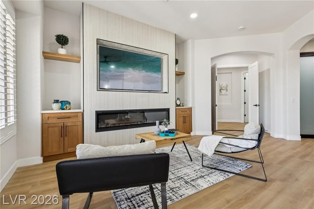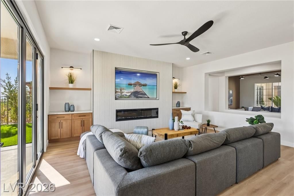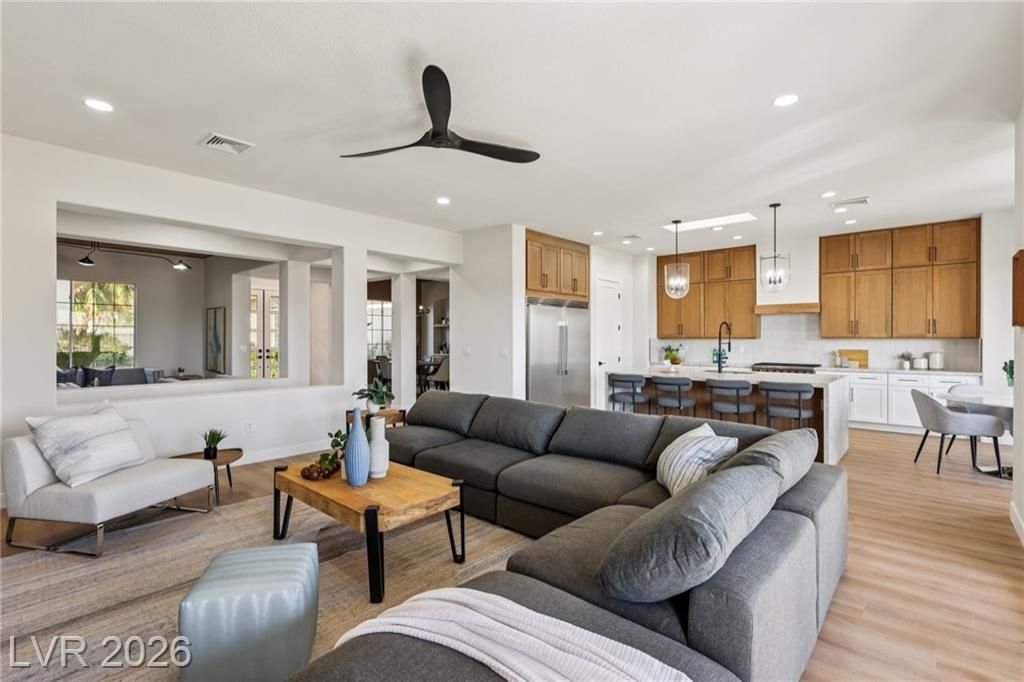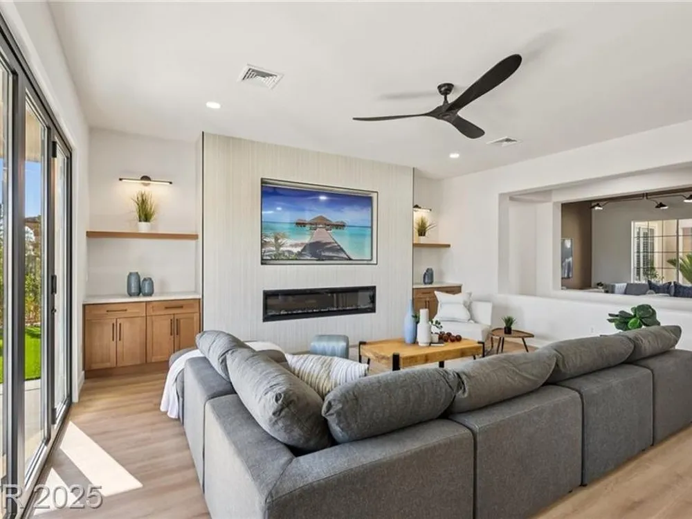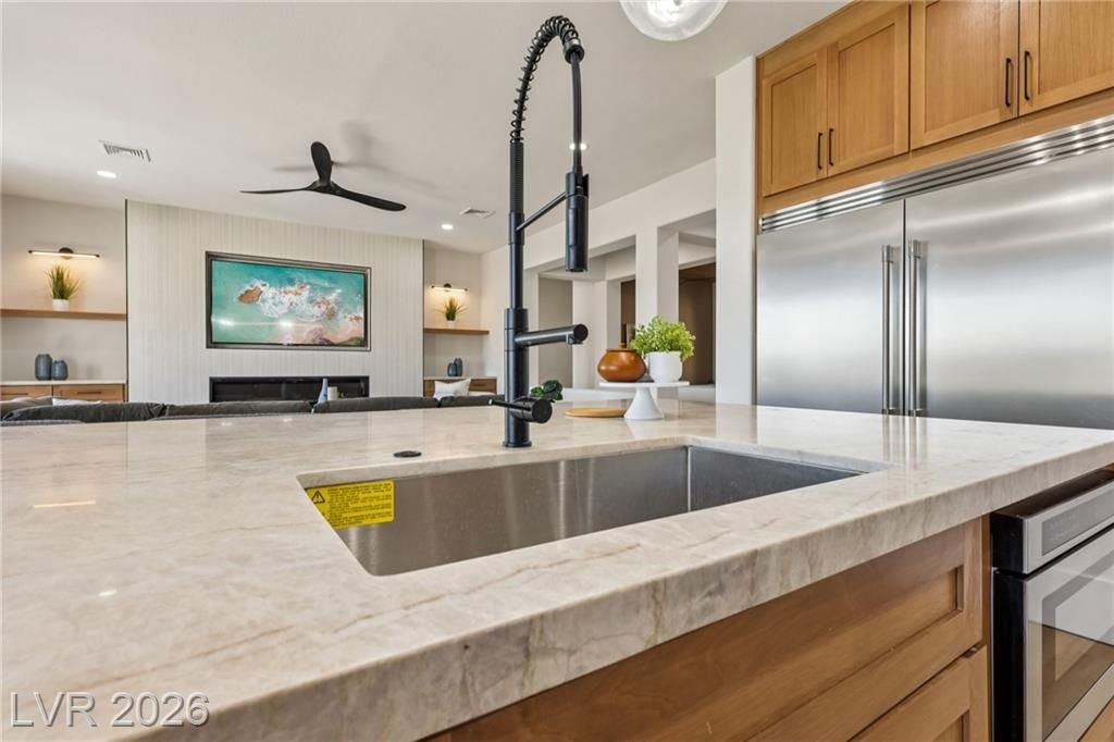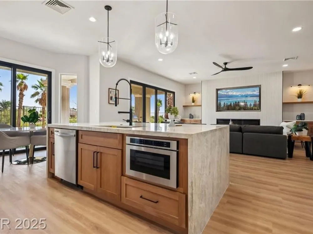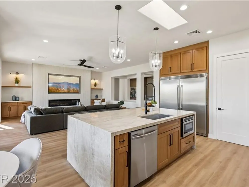 WELCOME TO YOUR OASIS ON THE GOLD COURSE - UNIQUELY SITUATED TO PROVIDE GREAT PRIVACY, YOU WILL FIND THIS FULLY REMODELED DESIGNER HOME WITH SEPARATE CASITA. UPGRADED W/ TOP QUALITY MATERIALS & FIXTURES INCLUDING BUT NOT LIMITED TO: NEW LUXURY VINYL PLANK FLOORS THROUGHOUT, FRESH INTERIOR & EXTERIOR PAINT, TWO TONE WHITE OAK CABINETRY W/ HIGH-END DESIGNER HARDWARE, CUSTOM FABRICATED TAJ MAHAL QUARTZITE COUNTERTOPS W/ OVERSIZED WATERFALL ISLAND, BRAND NEW LUXURY APPLIANCE PACKAGE IN THE KITCHEN, 2 CUSTOM BUILT LED FIREPLACES LOCATED IN THE FAMILY ROOM & PRIMARY BEDROOM, DESIGNER FIXTURES/FAUCETS/LIGHTING THROUGHOUT, A SPA STYLE PRIMARY BATH WITH HIS & HER VANITIES, CUSTOM TILED SHOWER W/ FREESTANDING TUB! FULL LANDSCAPE OVERHALL FRONT AND REAR! ENJOY THE GOLF COURSE VIEWS THROUGHOUT THE HOME. ENJOY YOUR OVERSIZED COVERED PATIO WITH OUTDOOR KITCHEN, AND BUILT IN FIRE PIT! THE HOME IS EVERYTHING YOU ARE LOOKING FOR IN THE BEST LOCATION IN SUMMERLIN.