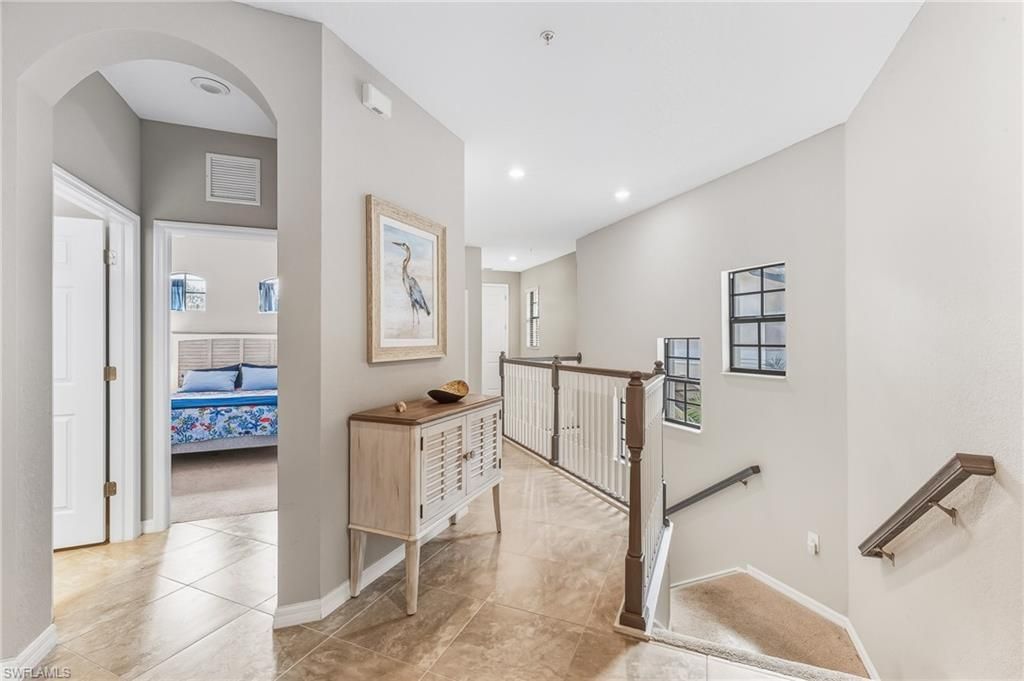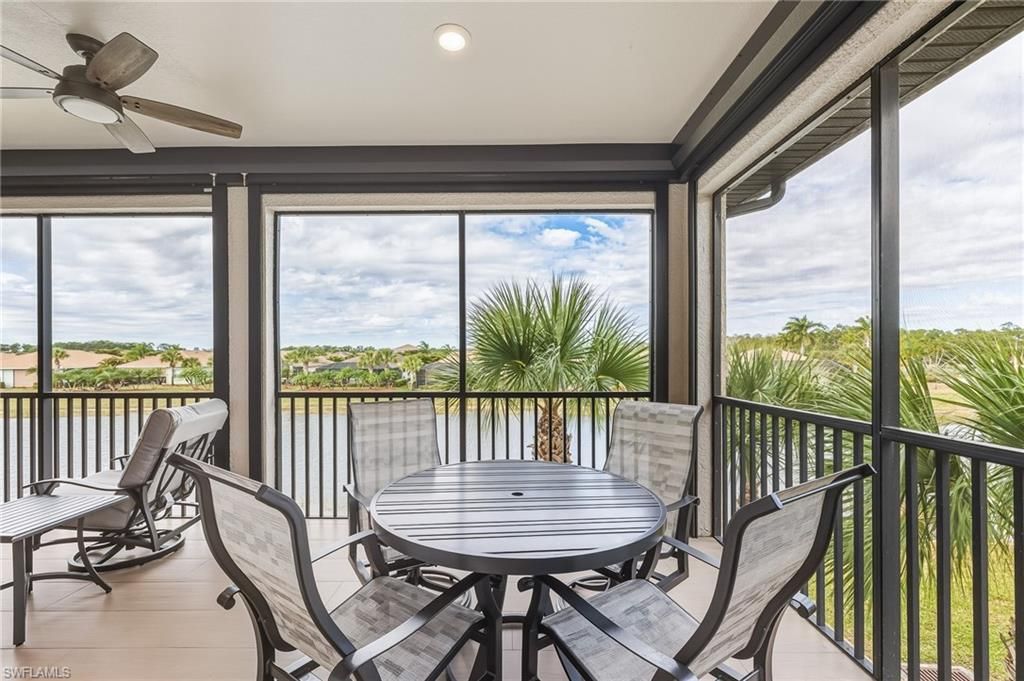 ONE OF THE BEST SUNSET VIEWS IN PELICAN PRESERVE.......Perfectly positioned with a short walk to Casella's Community Pool, this spacious, second floor unit w/ private elevator spans over 2,500 total sq ft. The bright and sunny unit with its volume, tray ceilings features UPDATES UNIQUE TO THE UNIT - primary bedroom/bathroom privacy door added between the two rooms creating increased privacy + extra guest bath if desired. In addition, new frosted french doors installed to den entry creating privacy and sound barrier for guests using the den as an extra guest bedroom. The open concept designed kitchen has premium stainless steel appliances; 42" white cabinets; breakfast bar island seating; large walk-in pantry with built-in shelving; and beautiful white quartz counter tops w/ decorative tile backsplash. Multiple sets of sliding glass doors lead out to the newly painted lanai w/ new tile flooring + brand new Storm Smart Hurricane Screens. The enclosed, screened balcony offers endless, panoramic sunsets captured by its coveted western facing lake view. Perfect for anyone seeking a second home or as a permanent residence....this home invites true resort-style living and an elite lifestyle in an amenity rich, active 55+ community. Be sure to check out all the Town Center's community offerings of multiple sports, arts & crafts activities, social clubs, indoor movies and live concerts. Truly a coastal get-a-way you'll love coming home to.