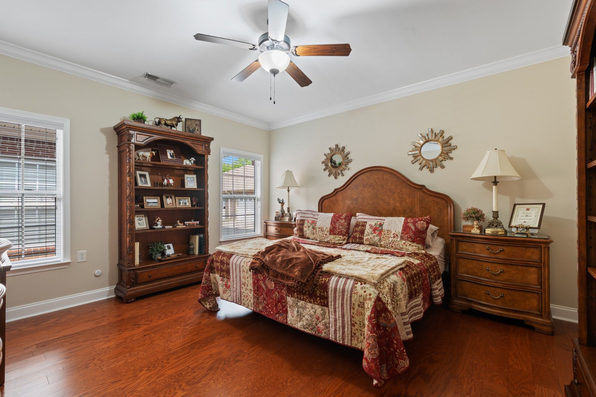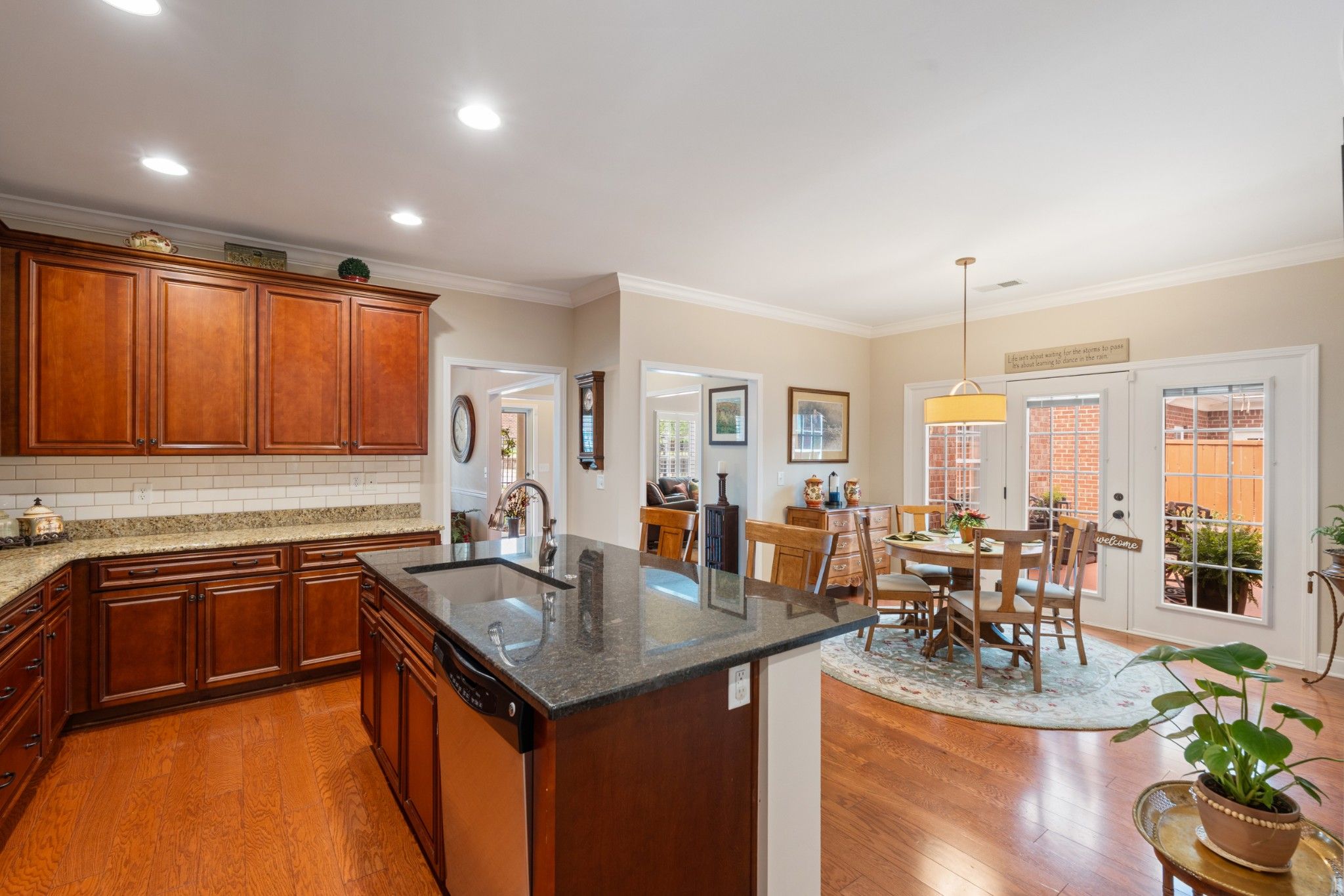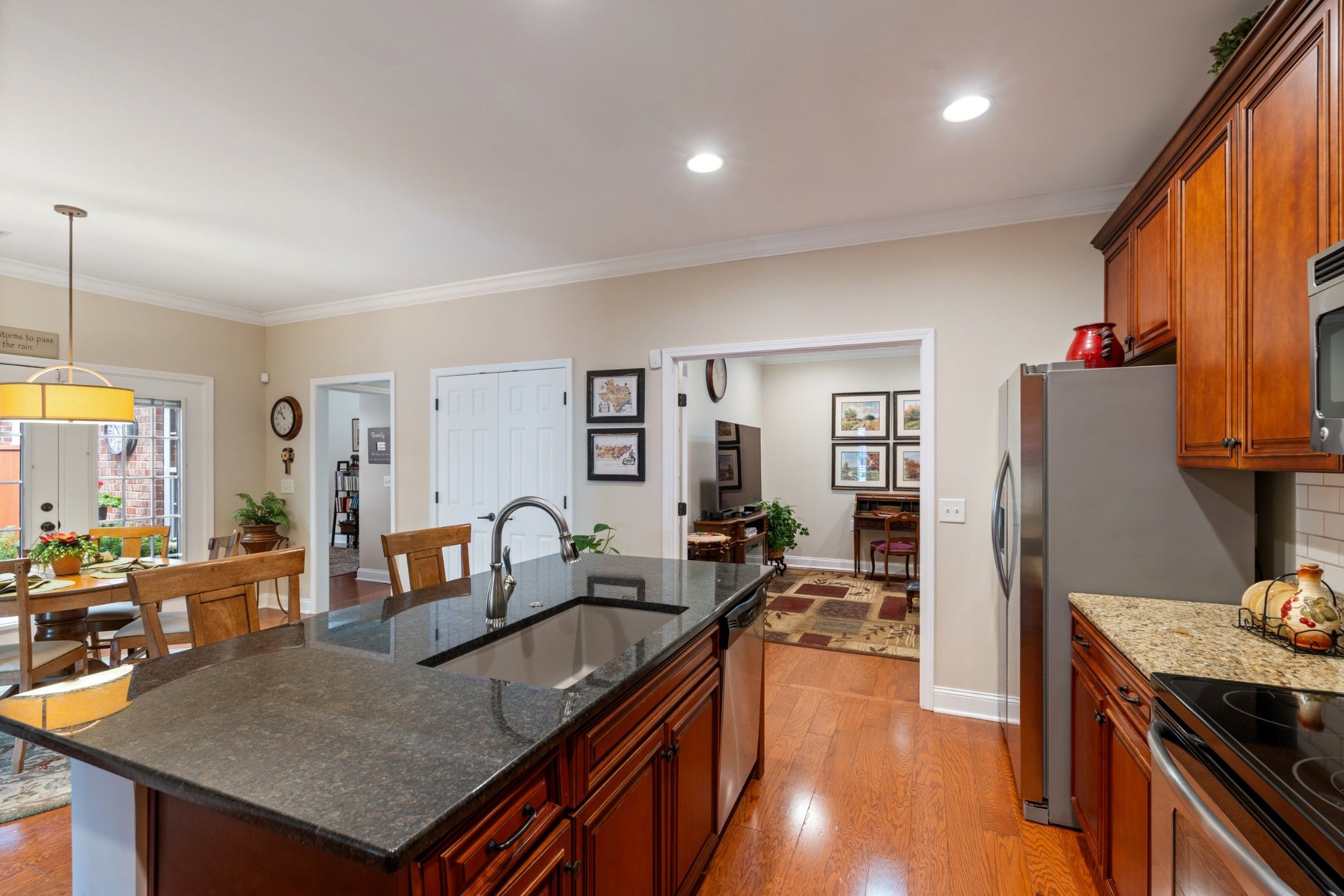 Premium floor plan and location in highly desirable Reid Hill Commons! This spacious one-level 55+ patio home offers an ideal layout with thoughtful design throughout. Featuring a welcoming rocking chair front porch, the home includes separate formal living and dining rooms with hardwood flooring, a dedicated den/study, and a large laundry room. The renovated kitchen is equipped with an island, breakfast area, and abundant storage, complemented by beautiful plantation shutters throughout the home. The expansive owner’s suite includes two closets and an en suite bath with a walk-in shower, while the secondary bedroom and hall bath provide comfortable space for guests. Enjoy outdoor living on the completely private side patio—perfect for entertaining. Additional highlights include a 2-car rear-entry garage with shelving, accessible attic storage, and ample visitor parking nearby. Ideally located just minutes from historic downtown Franklin and Westhaven Town Center, with convenient walkability to everyday essentials including shopping, dining, and medical services. Overlooking serene landscaped common space, this beautifully maintained home is the largest floor plan offered in the neighborhood and truly stands out.