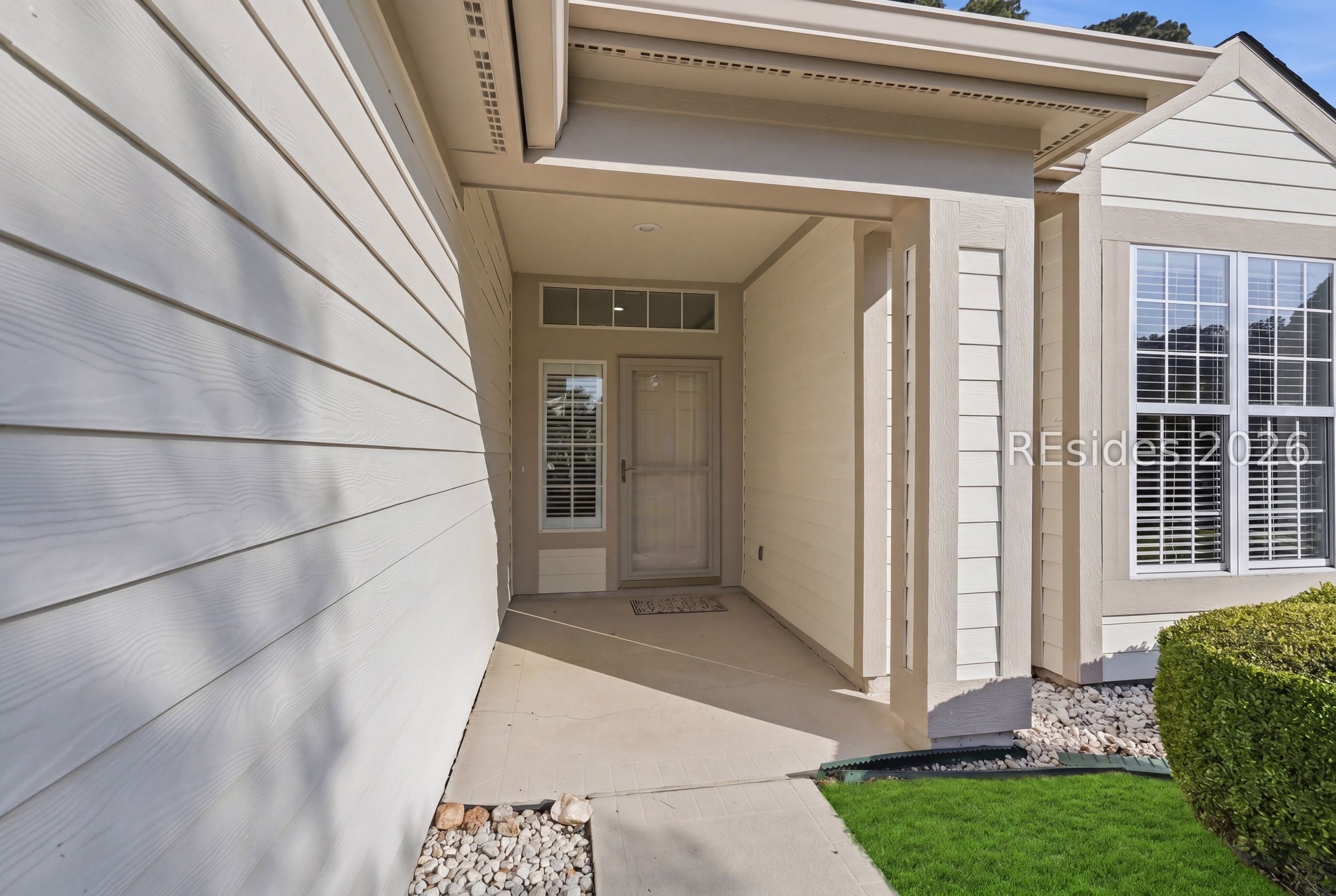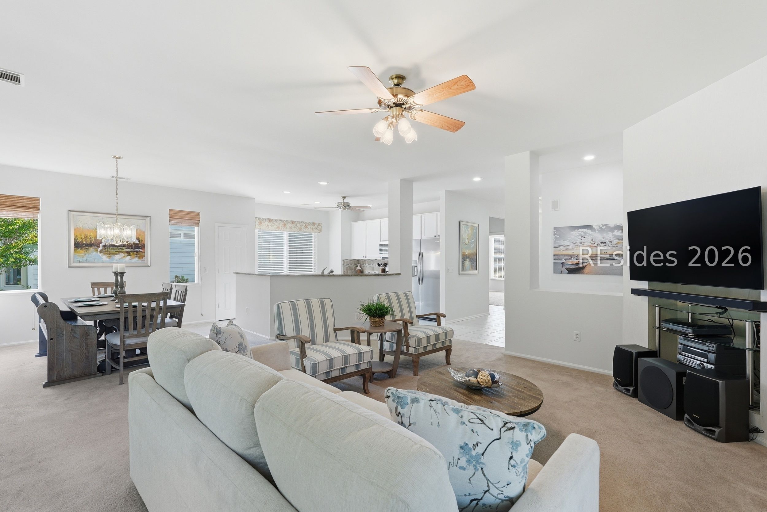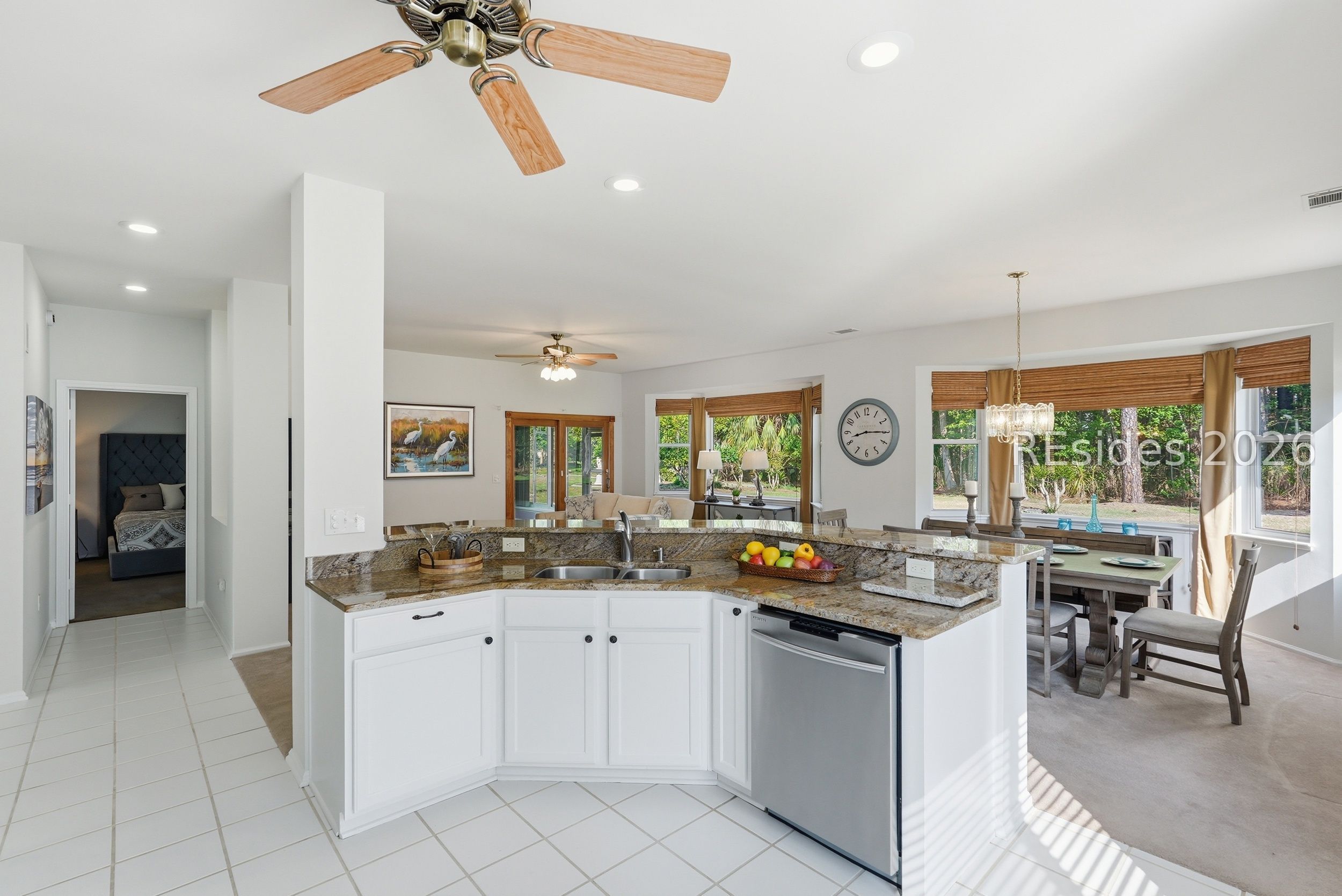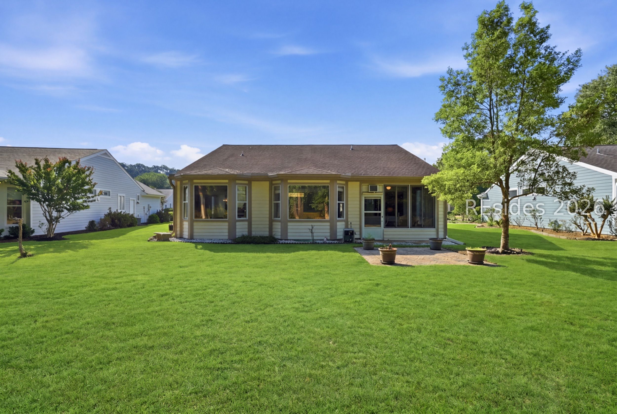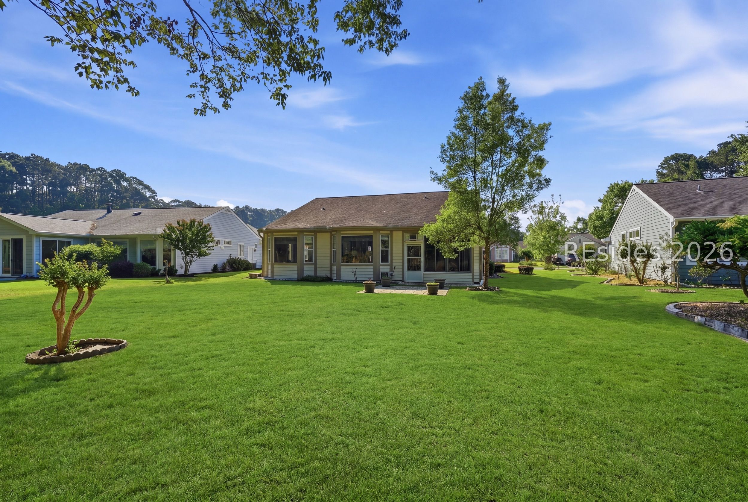 Welcome tο 105 Col Cοlсock Court, a well-mаintained Kingston/Ρotοmac model set on a quiet cul-de-sac in Sun City's highly desirable Southside. Offering 2 bedrooms, 2 bathrooms, and 1,466 sq ft, this home features an open-concept layout, smooth ceilings throughout, and multiple bay windows that fill the home with natural light. The kitchen features granite countertops, stainless steel appliances, tile backsplash, under cabinet lighting, pantry, and abundant natural light, flowing seamlessly into the dining and living areas. A slider leads to the enclosed porch, where you'll enjoy a private wooded backdrop with vinyl windows, ceiling fan, and blinds for year-round comfort. The primary suite offers a spacious retreat with a large walk-in closet and en-suite bath featuring dual sinks, walk-in shower, and transom window. A guest bedroom includes a built-in Murphy bed with ample storage, ideal for accommodating visitors. Additional highlights include a skylight-filled foyer with plantation shutters on the window, Hardie plank siding, gutters, and a 2-car garage with utility sink. Enjoy all that Sun City has to offer, including golf courses, resort-style pools, fitness centers, pickleball, tennis, bocce, walking trails, on-site dining, and over 200 clubs and activities.
