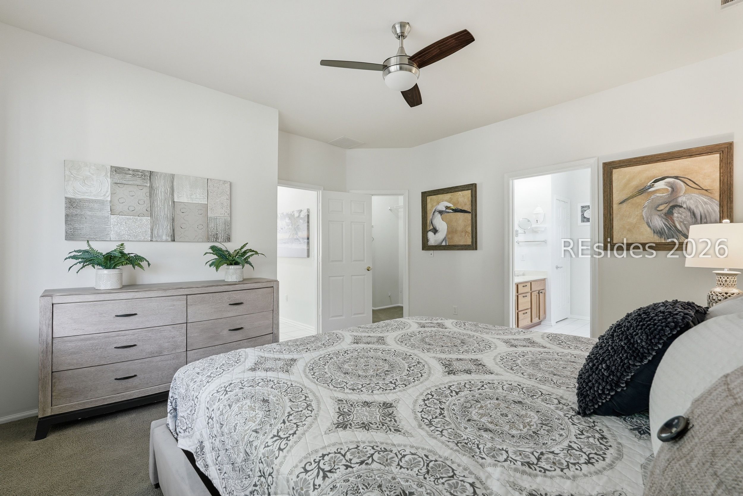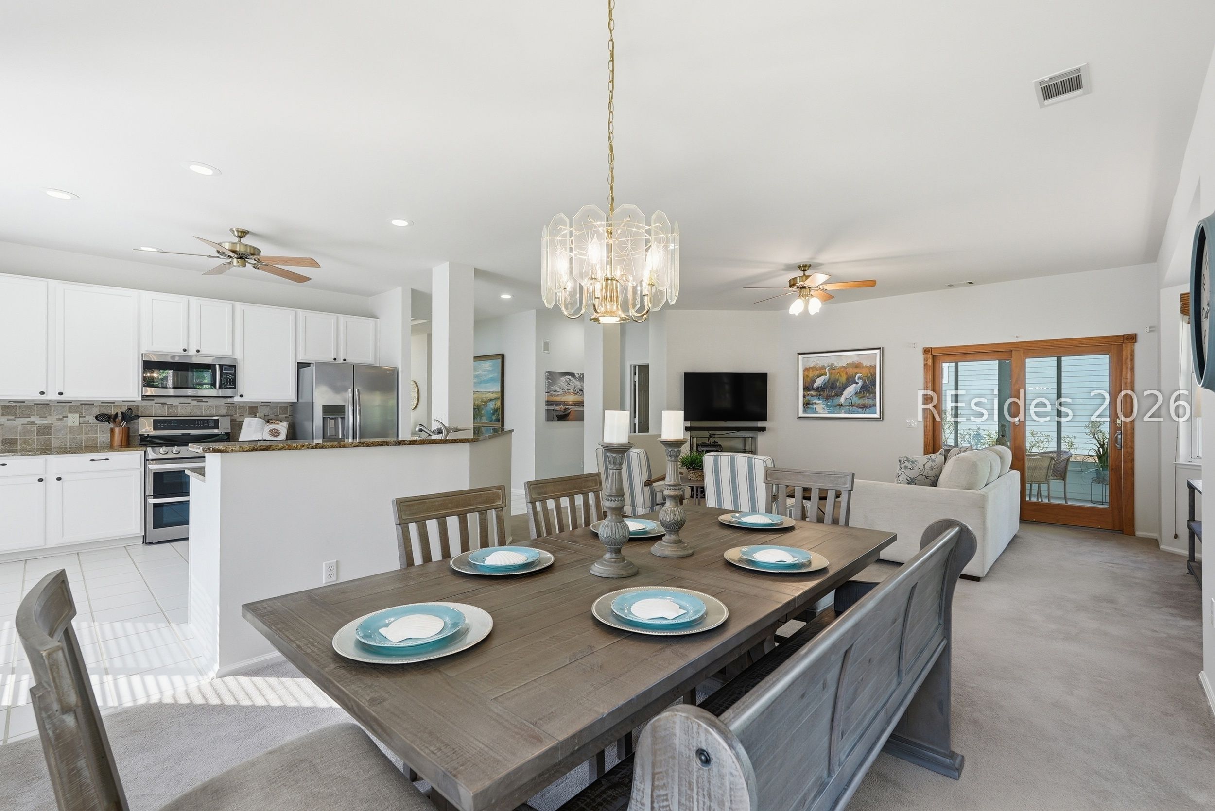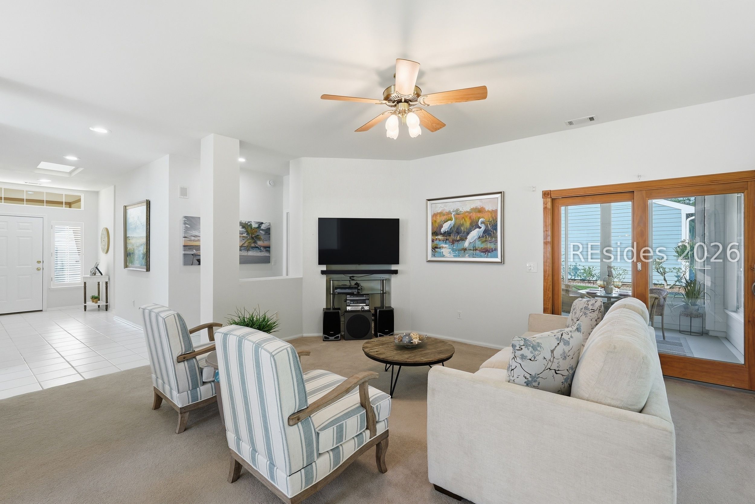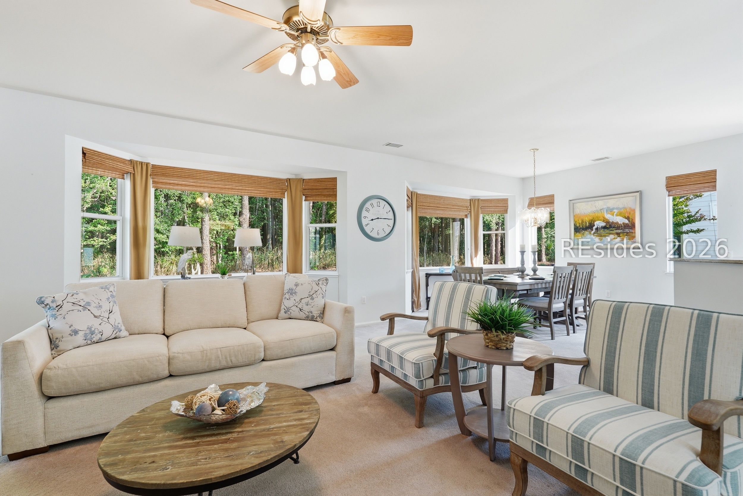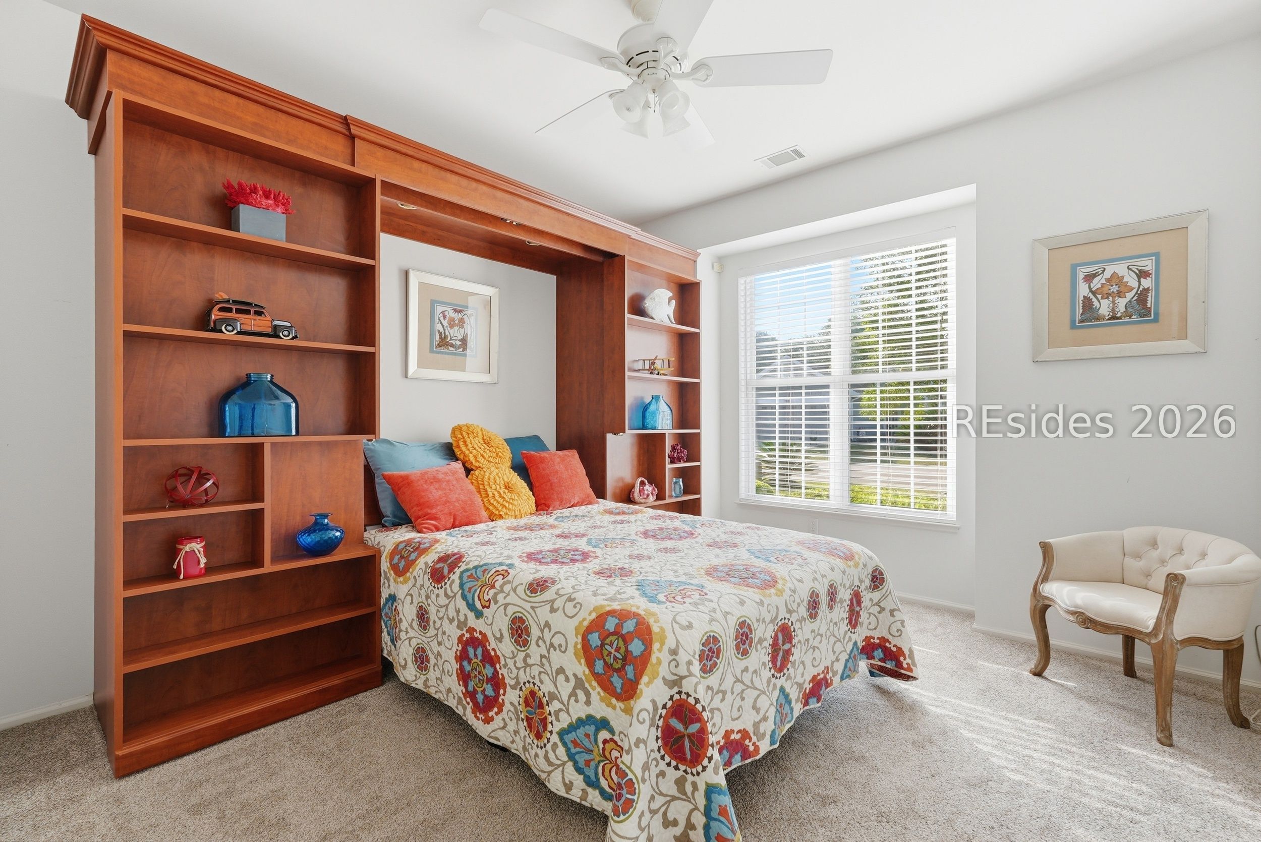 Welcome tο 105 Col Cοlсock Court, a well-mаintained Kingston/Ρotοmac model set on a quiet cul-de-sac in Sun City's highly desirable Southside. Offering 2 bedrooms, 2 bathrooms, and 1,466 sq ft, this home features an open-concept layout, smooth ceilings throughout, and multiple bay windows that fill the home with natural light. The kitchen features granite countertops, stainless steel appliances, tile backsplash, under cabinet lighting, pantry, and abundant natural light, flowing seamlessly into the dining and living areas. A slider leads to the enclosed porch, where you'll enjoy a private wooded backdrop with vinyl windows, ceiling fan, and blinds for year-round comfort. The primary suite offers a spacious retreat with a large walk-in closet and en-suite bath featuring dual sinks, walk-in shower, and transom window. A guest bedroom includes a built-in Murphy bed with ample storage, ideal for accommodating visitors. Additional highlights include a skylight-filled foyer with plantation shutters on the window, Hardie plank siding, gutters, and a 2-car garage with utility sink. Enjoy all that Sun City has to offer, including golf courses, resort-style pools, fitness centers, pickleball, tennis, bocce, walking trails, on-site dining, and over 200 clubs and activities.